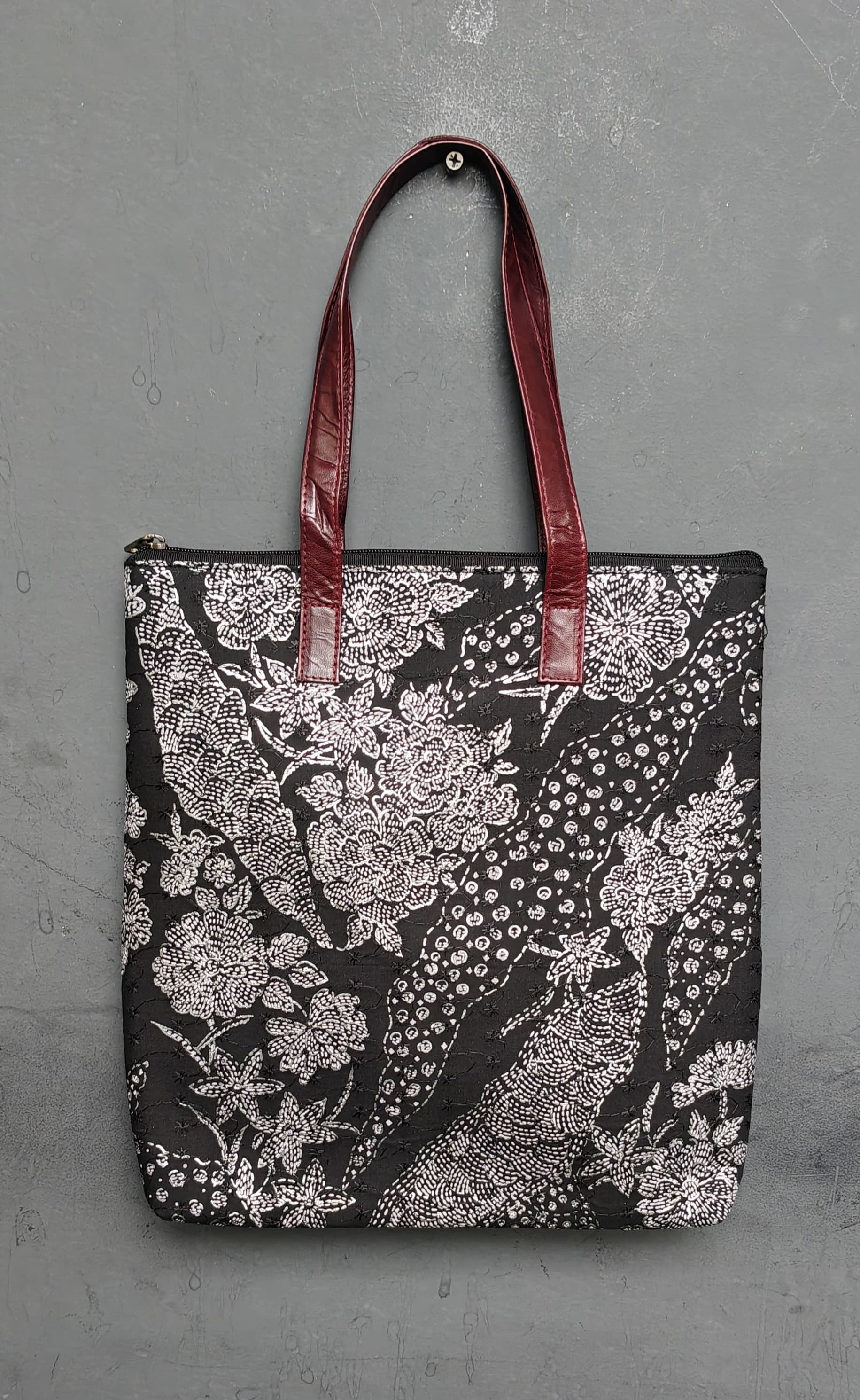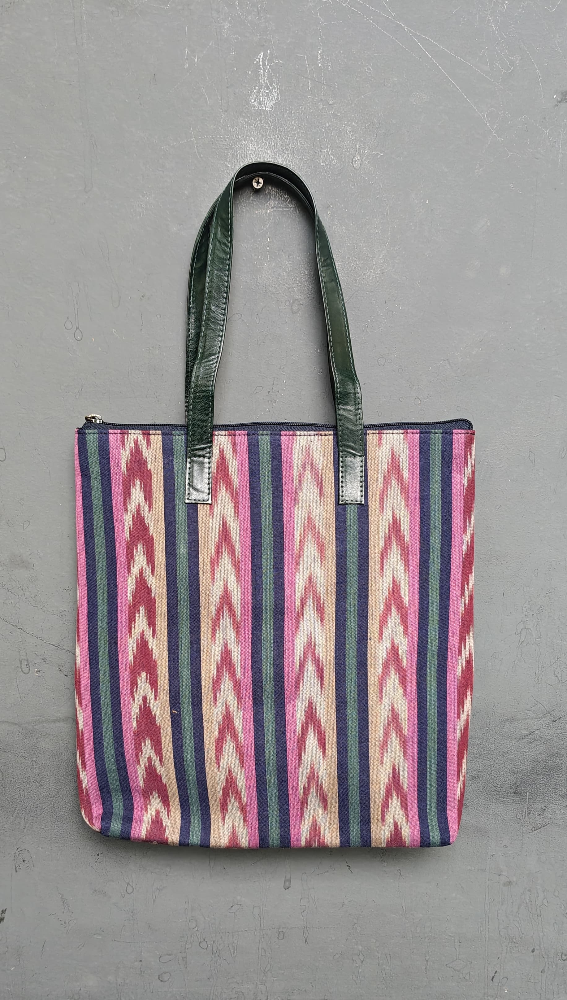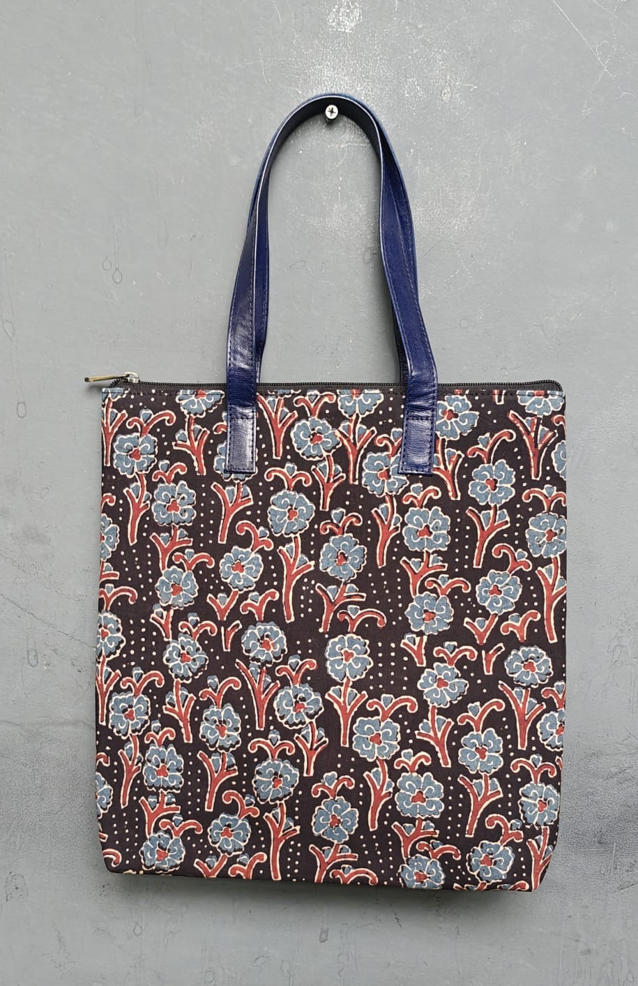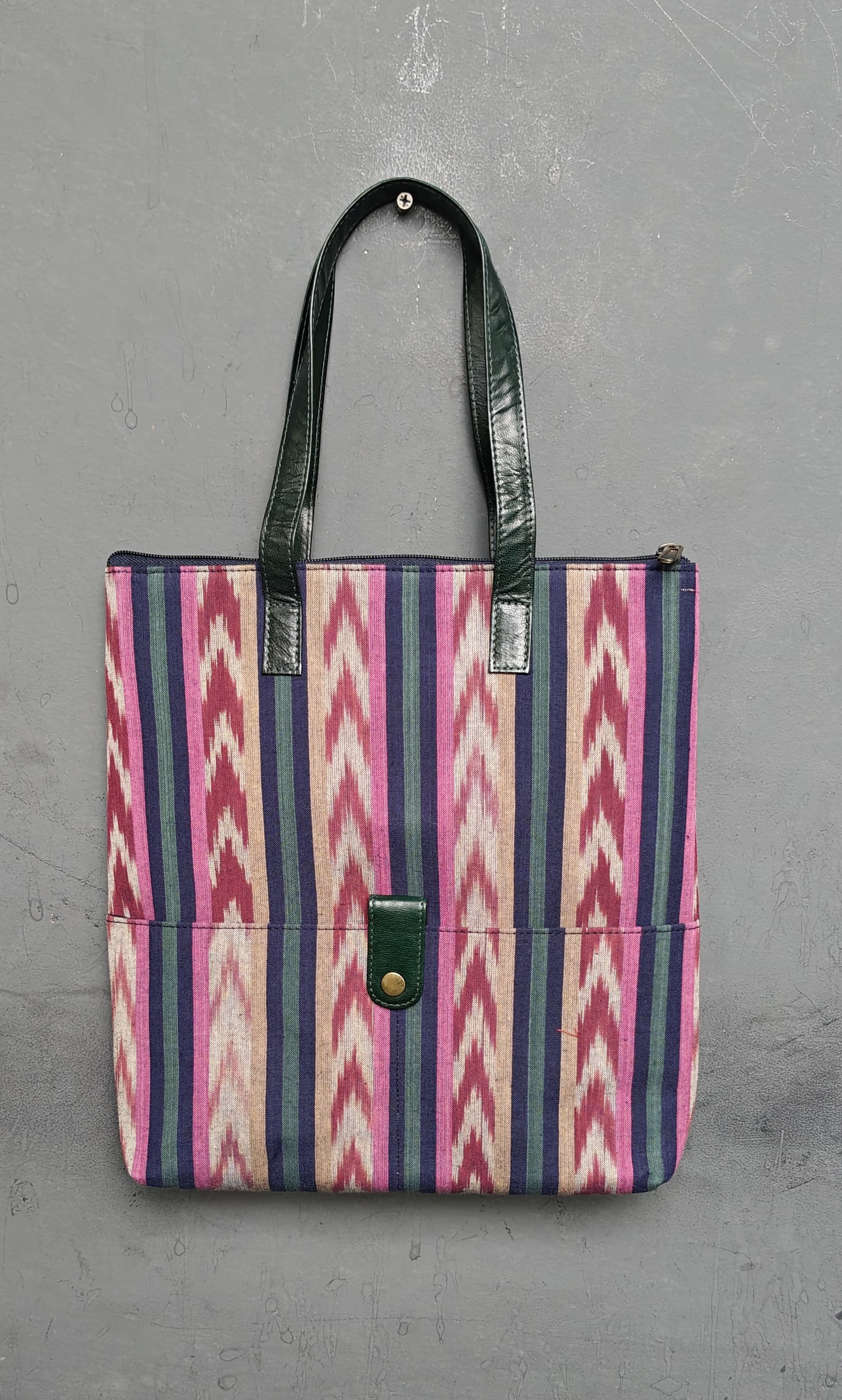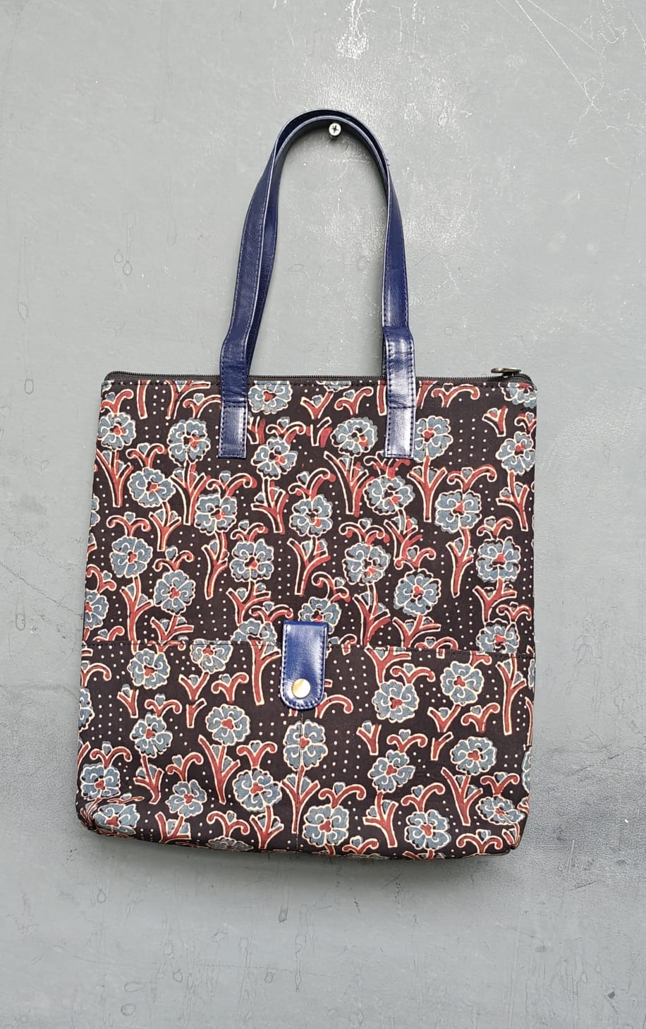 Hand crafted fabric tote bag with leatherflap closure front pocket and leather handles