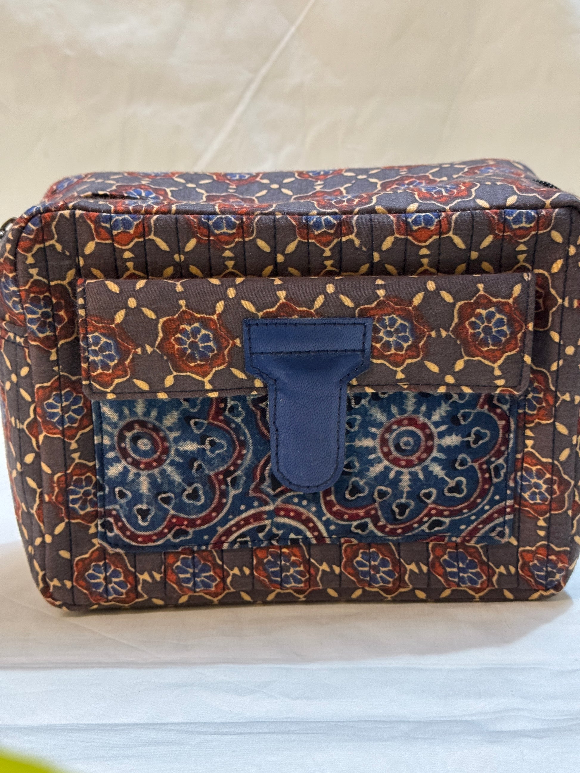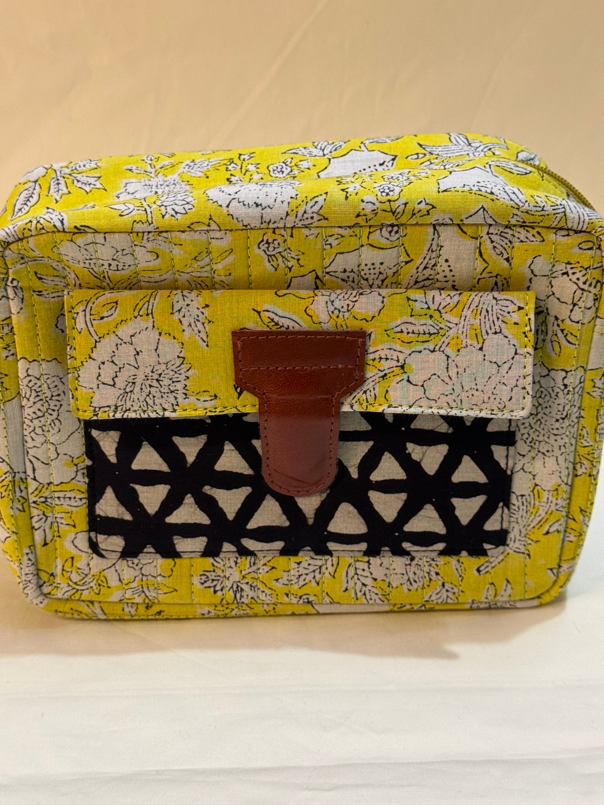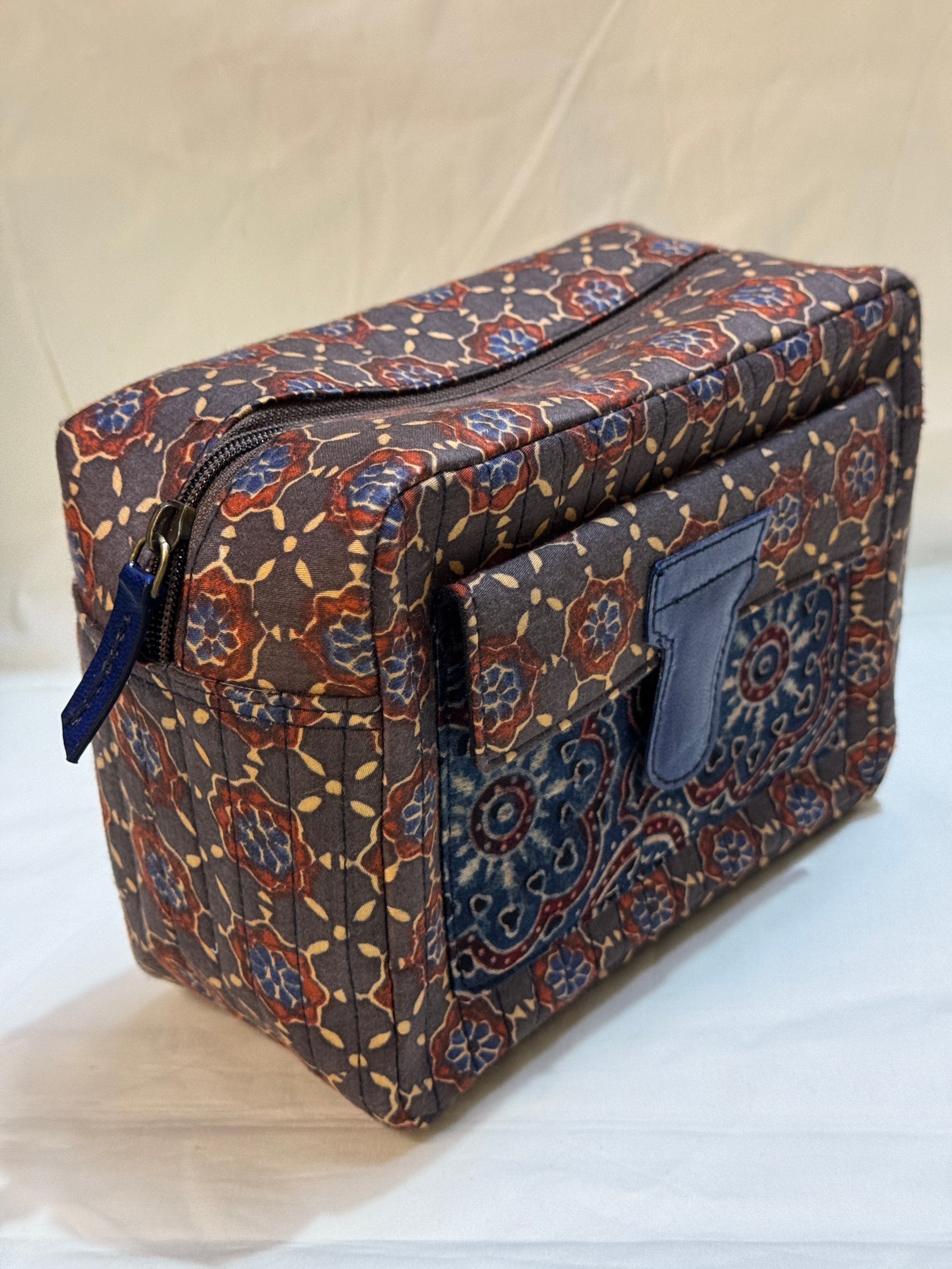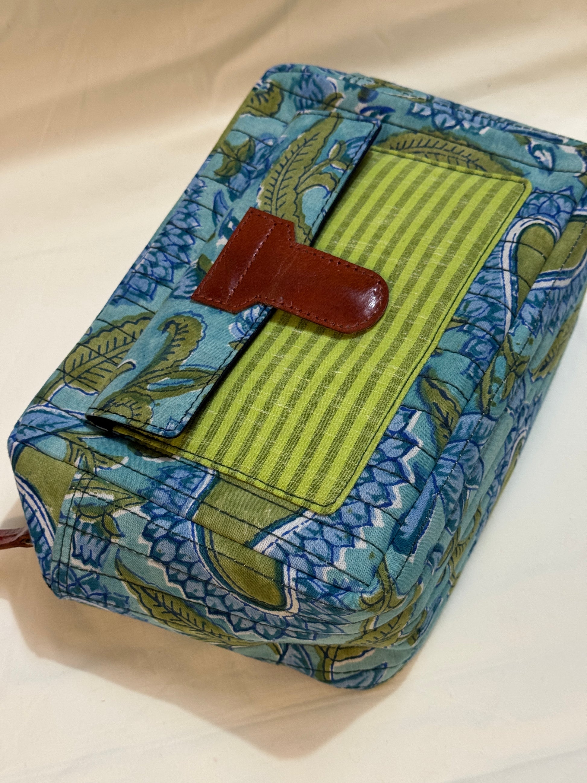 Handcrafted toiletries / travel pouch with leak proof plastic lining plus colorful front pocket with leather patch