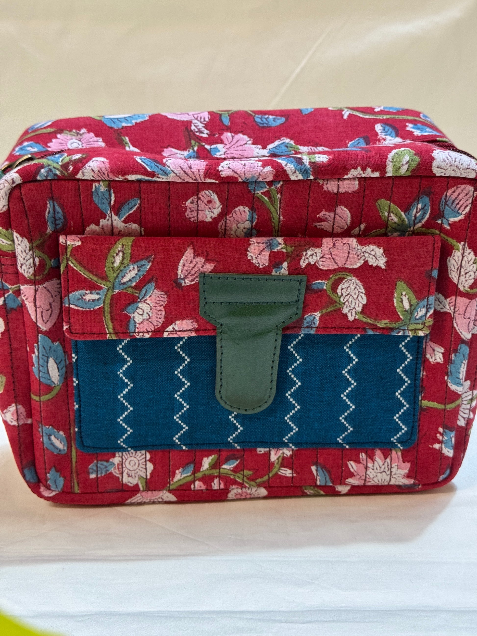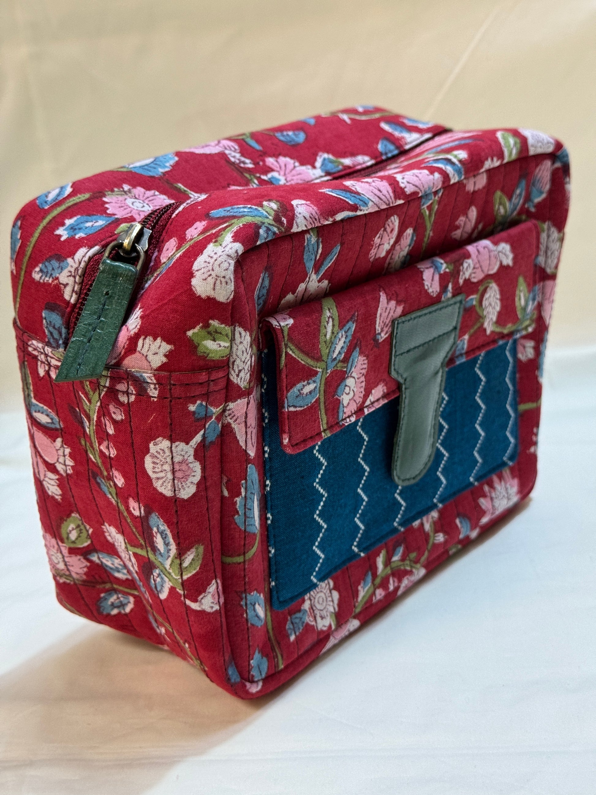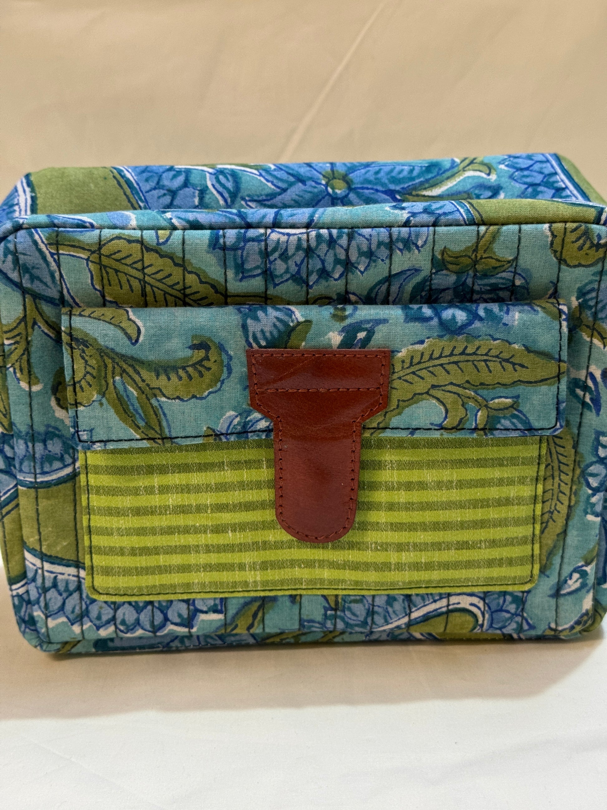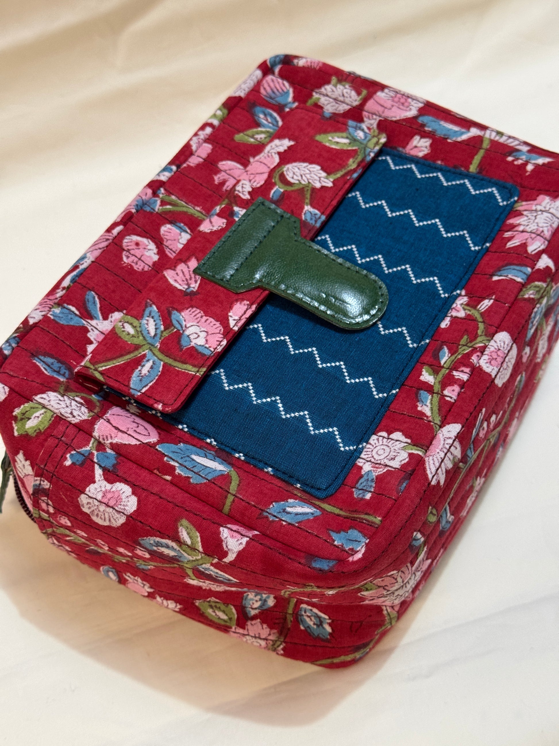 Handcrafted toiletries / travel pouch with leak proof plastic lining plus colorful front pocket with leather patch