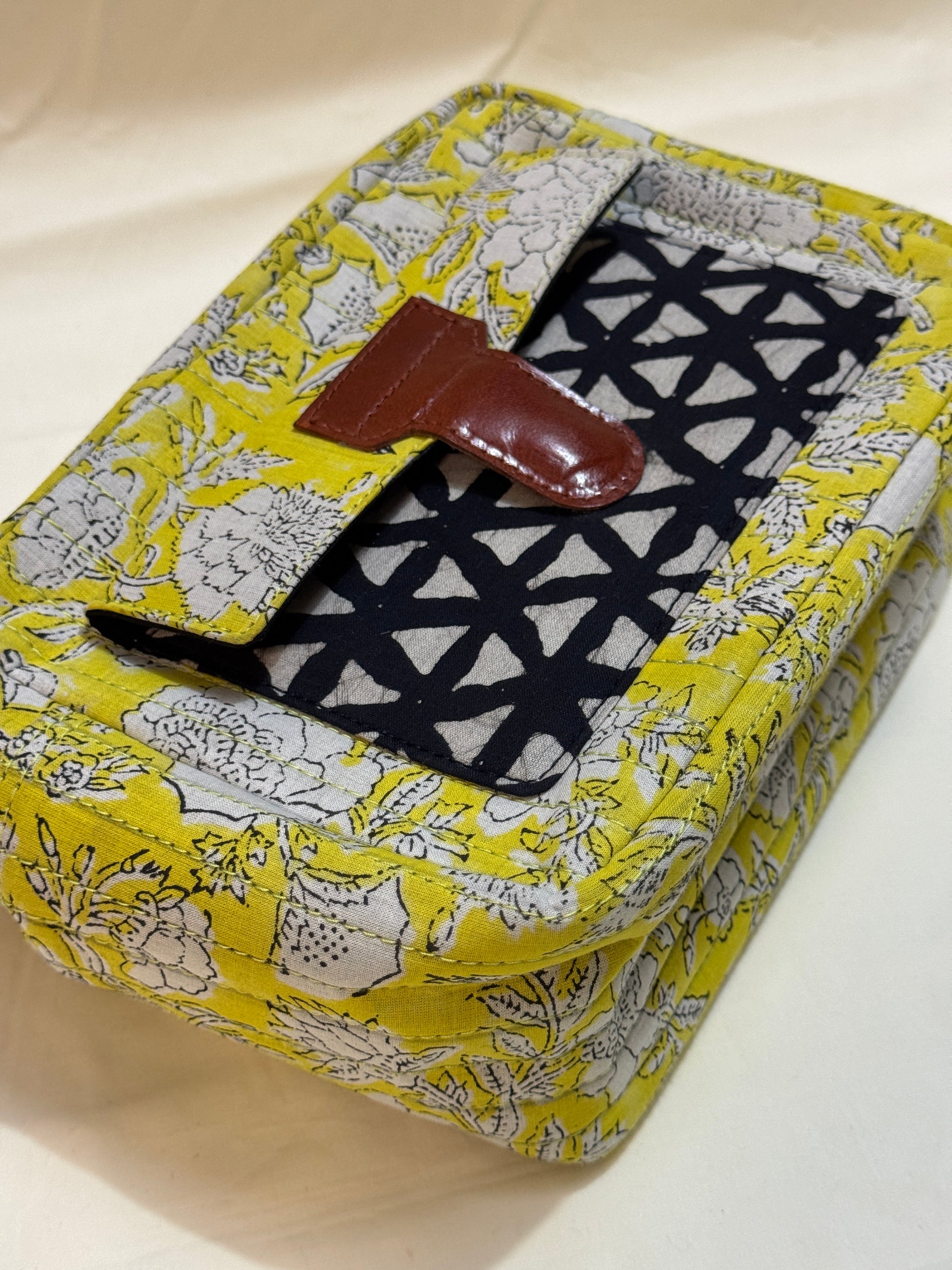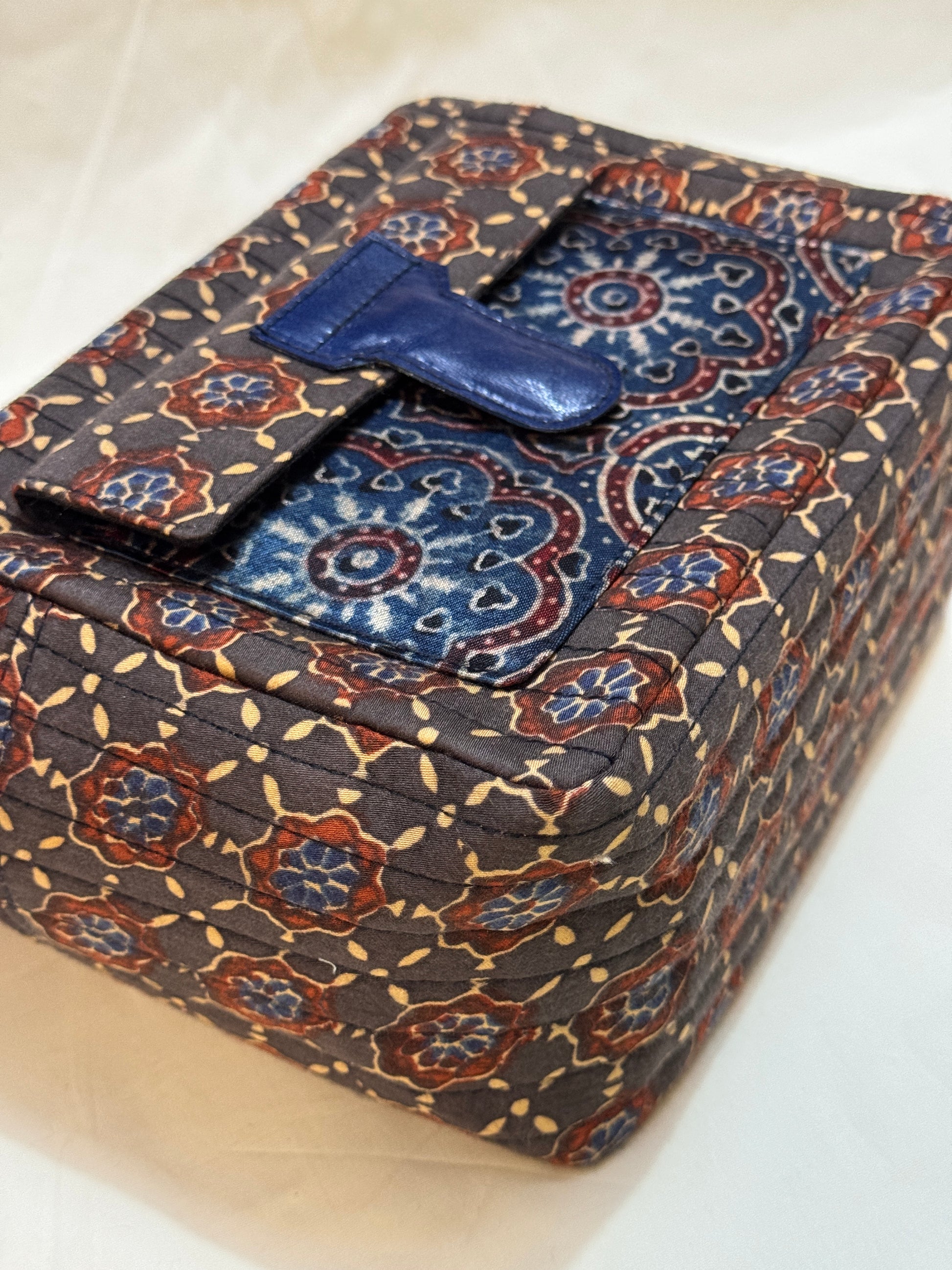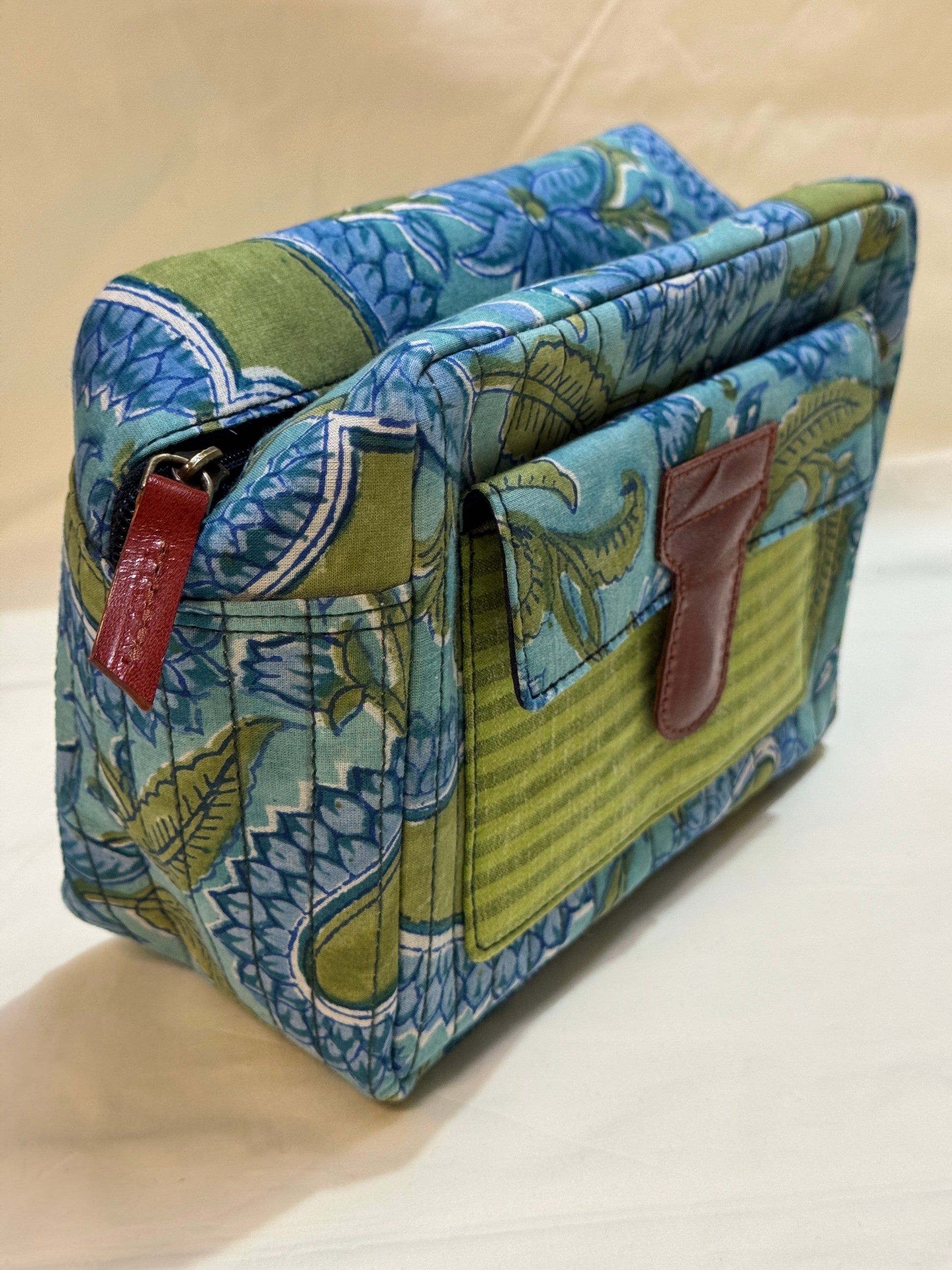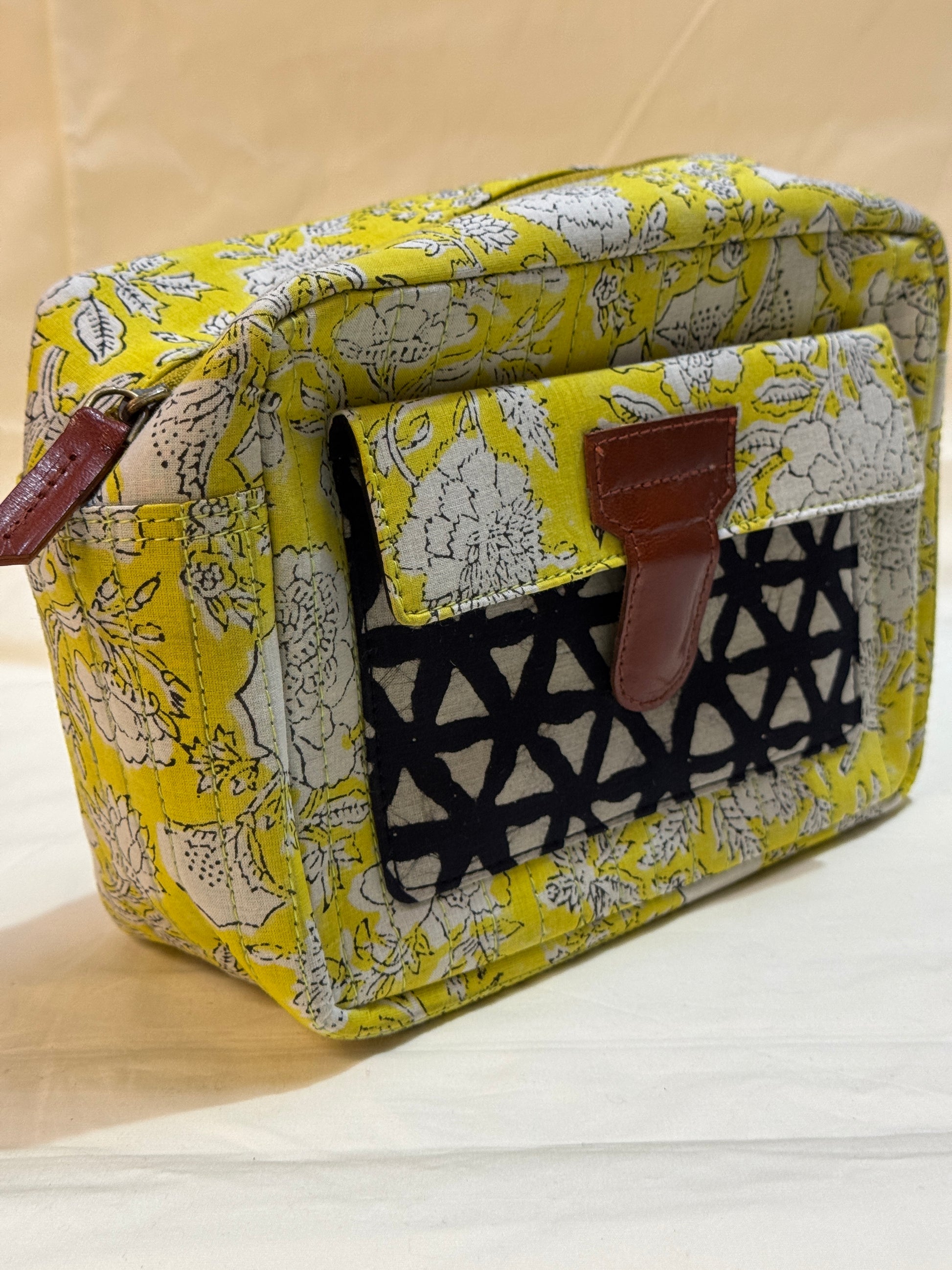 Handcrafted toiletries / travel pouch with leak proof plastic lining plus colorful front pocket with leather patch