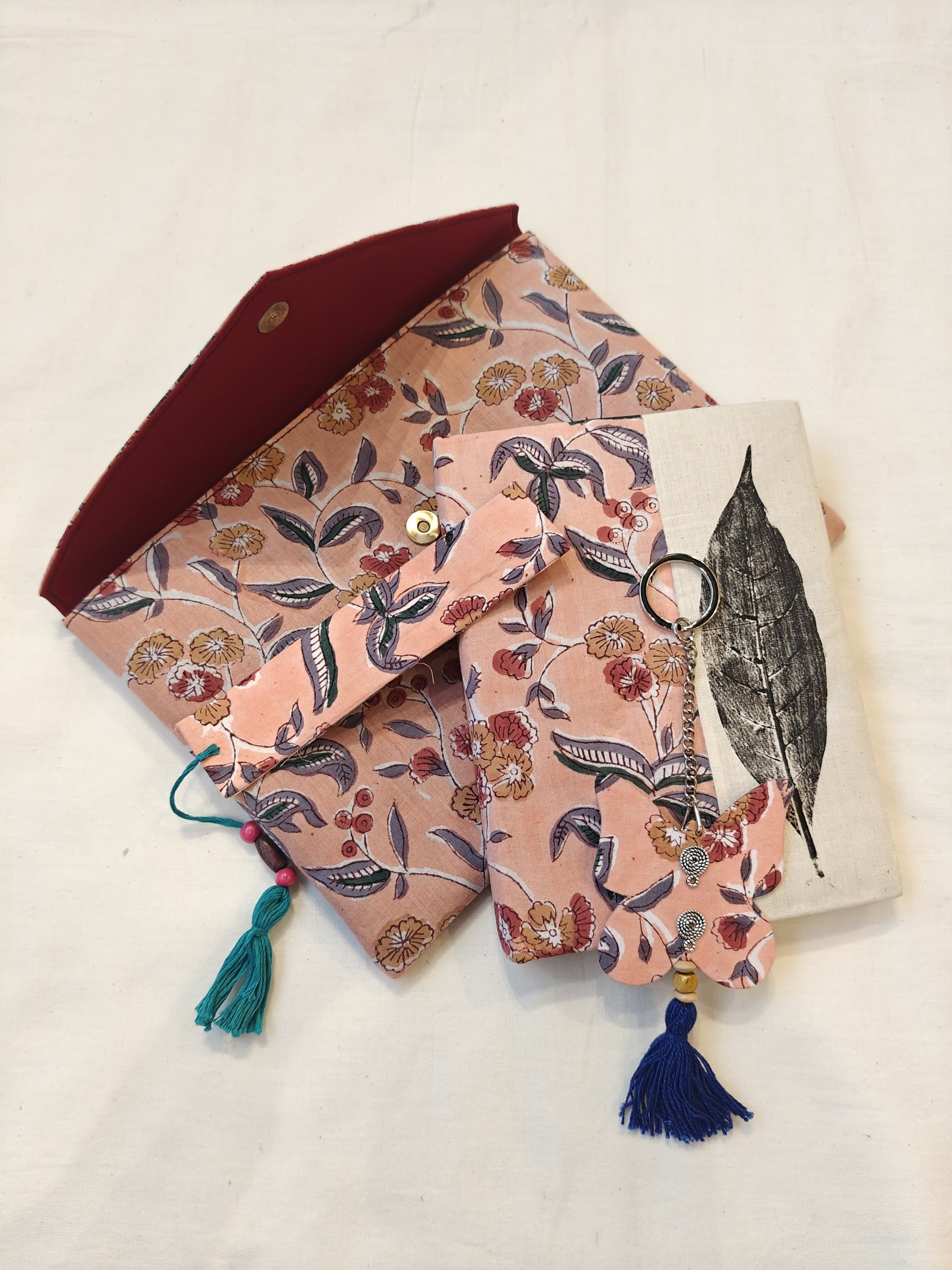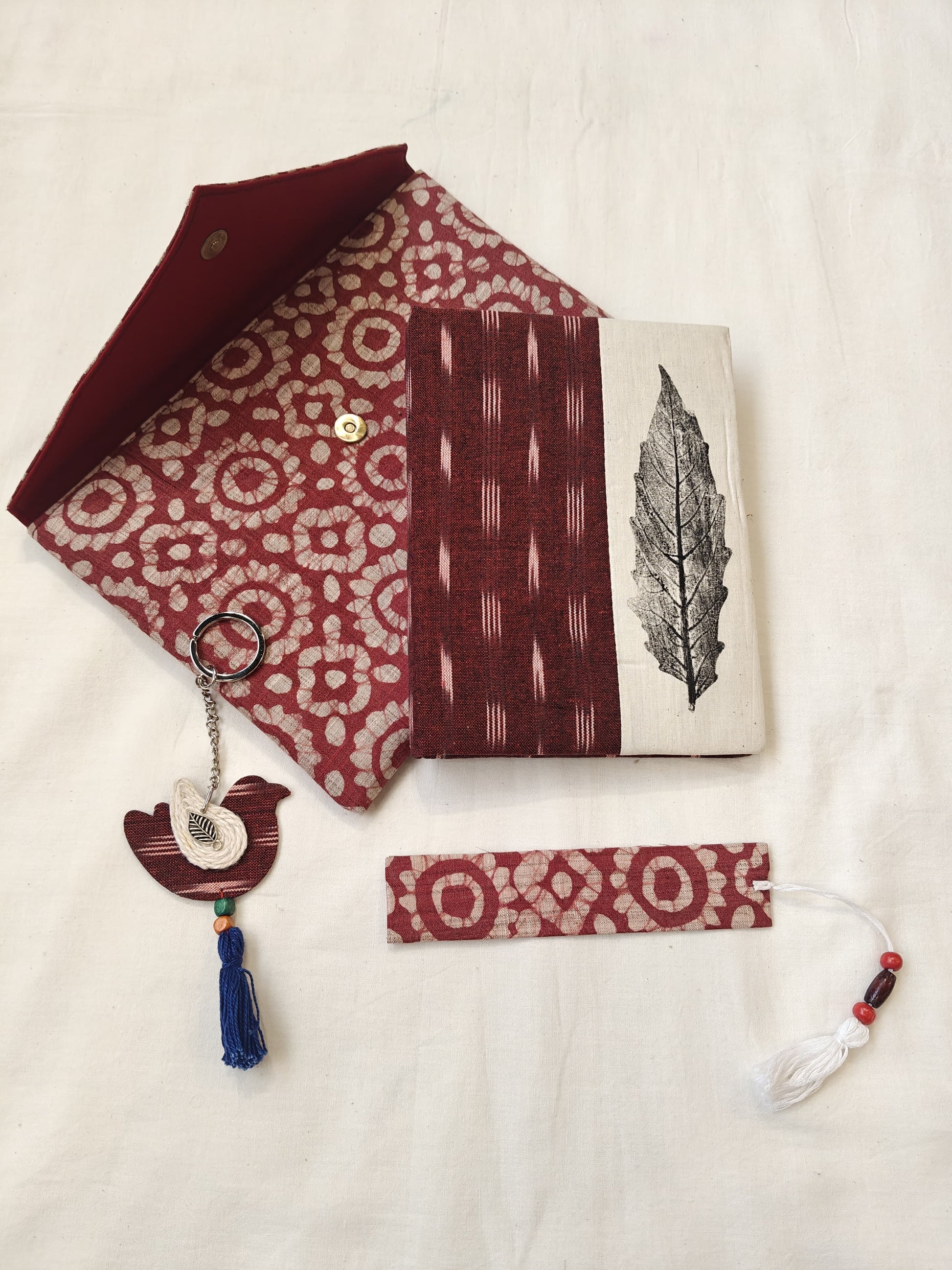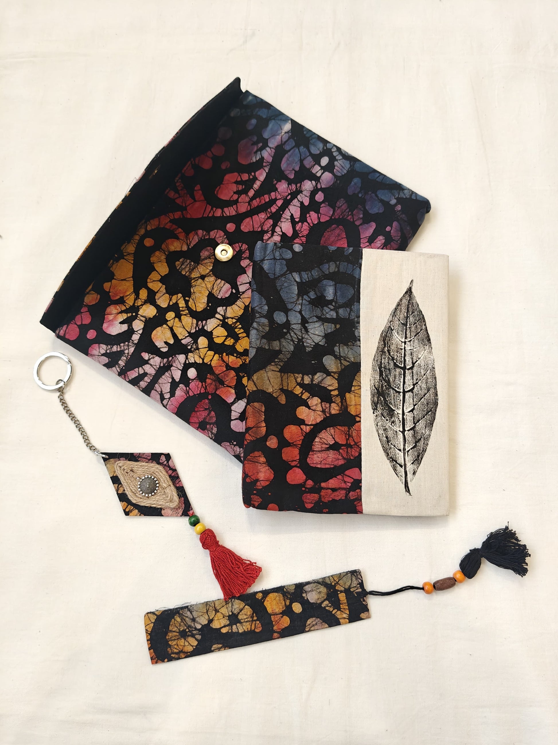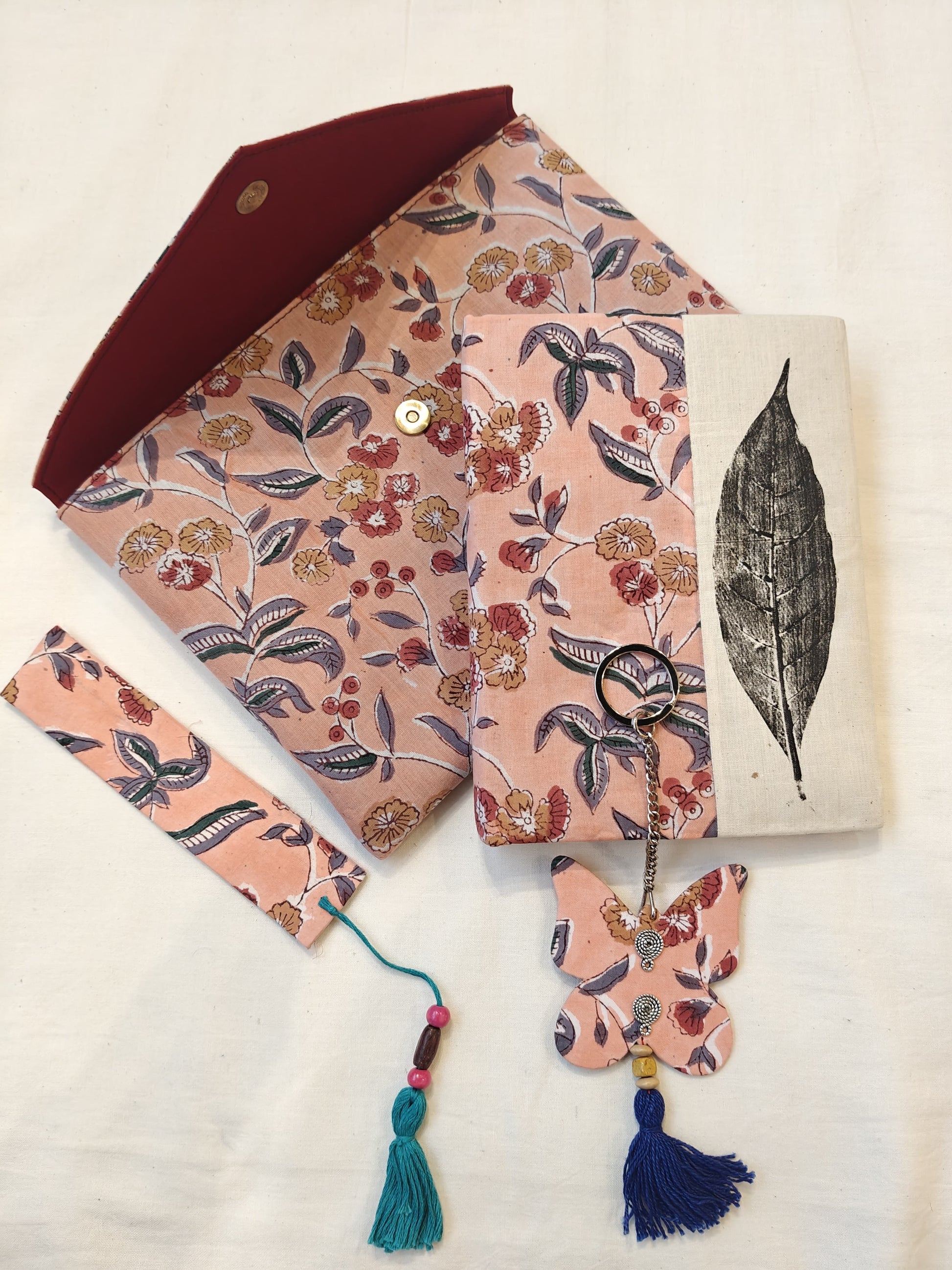 Handmade paper notebook with eco leaf printed fabric cover, hand crafted bookmark, key ring / charm and a container pouch set