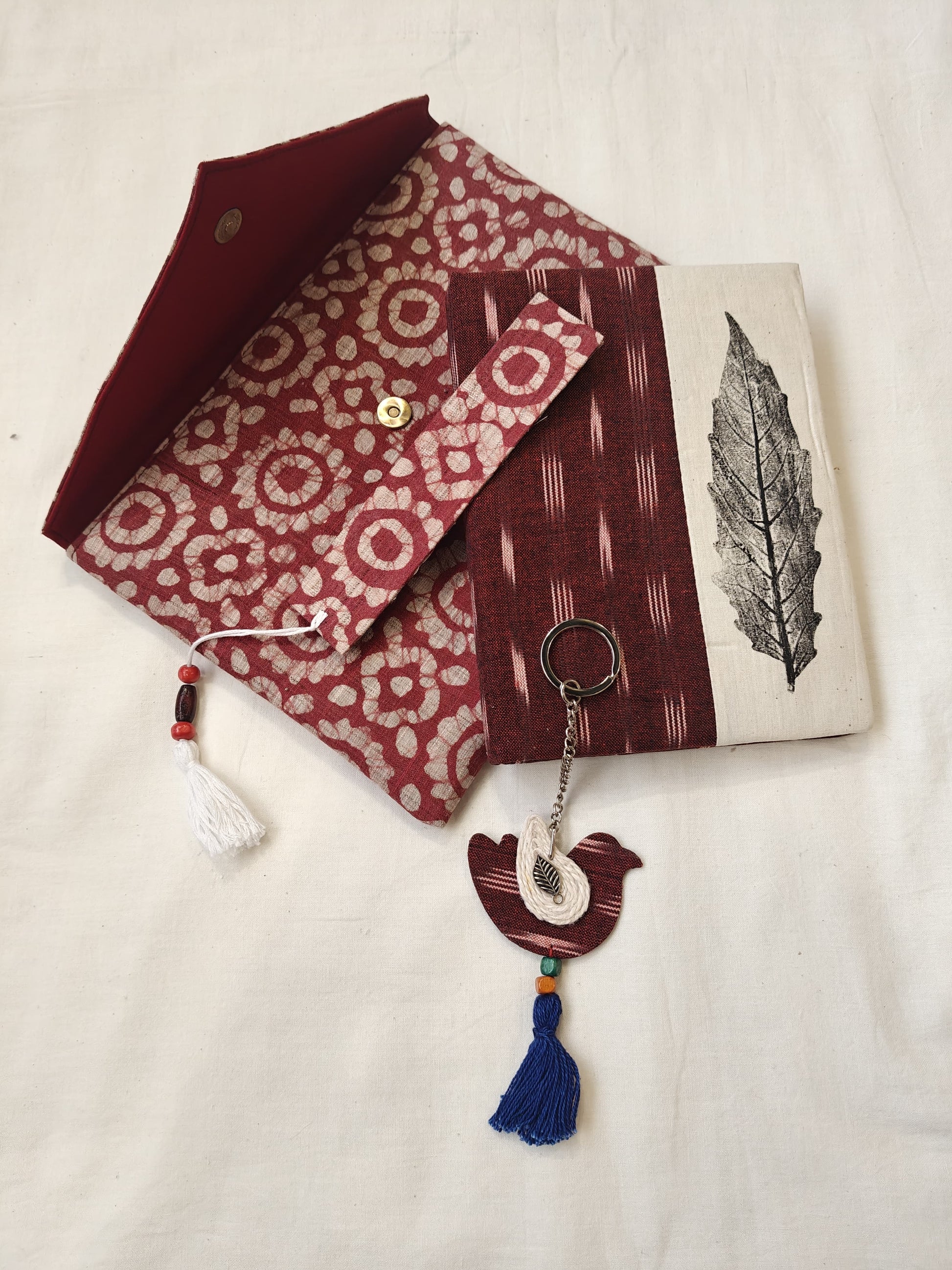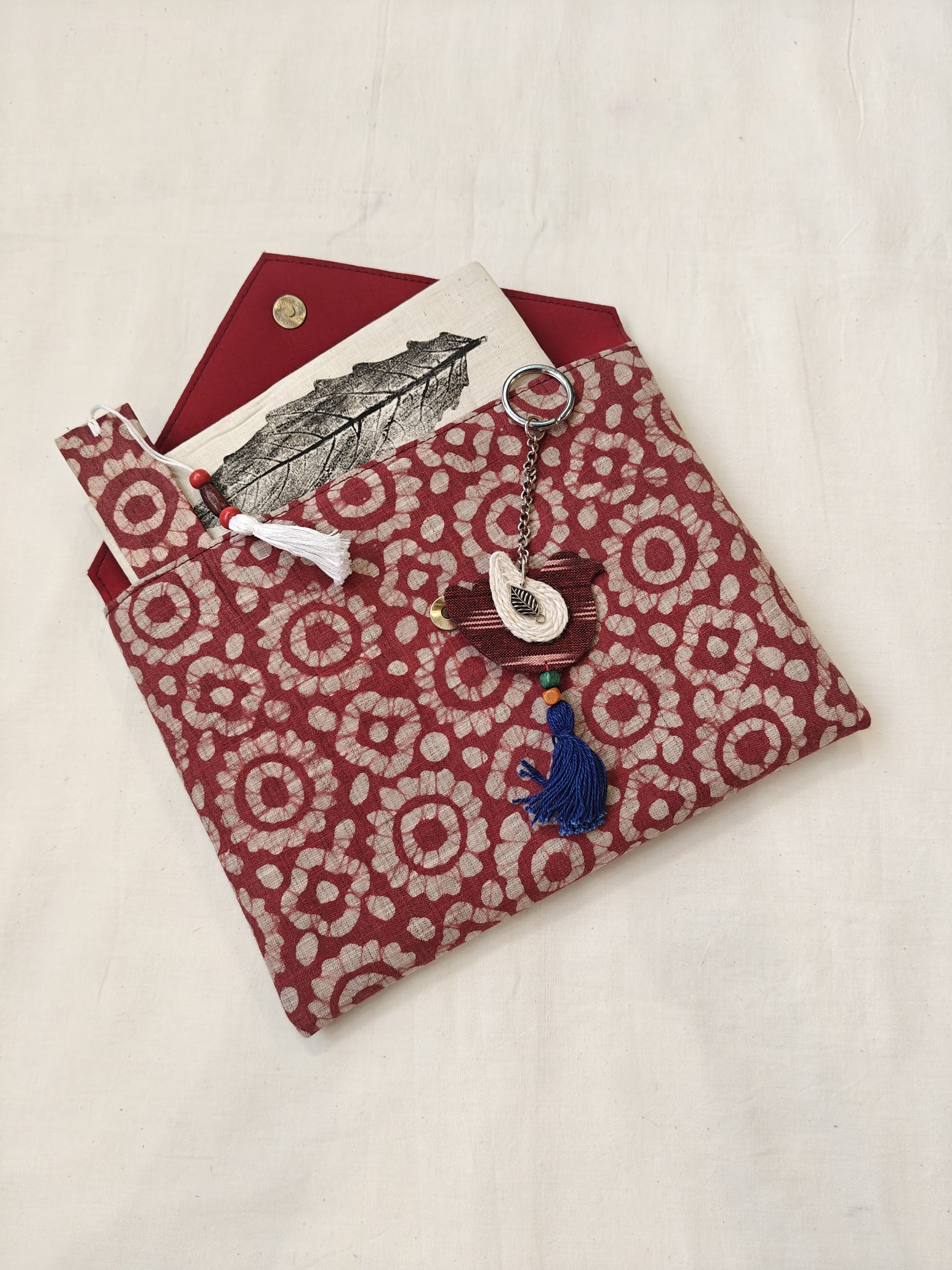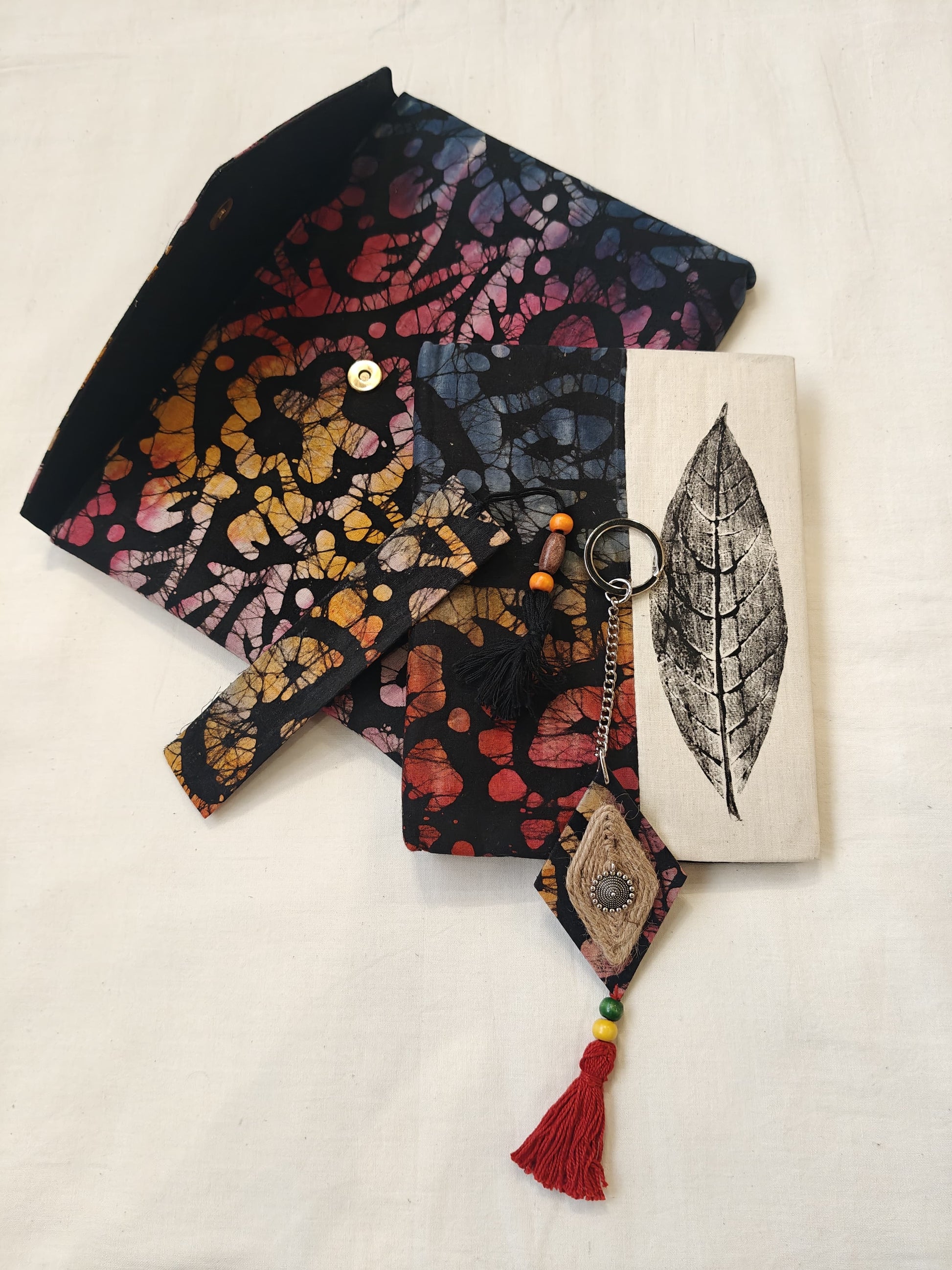Handmade paper notebook with eco leaf printed fabric cover, hand crafted bookmark, key ring / charm and a container pouch set