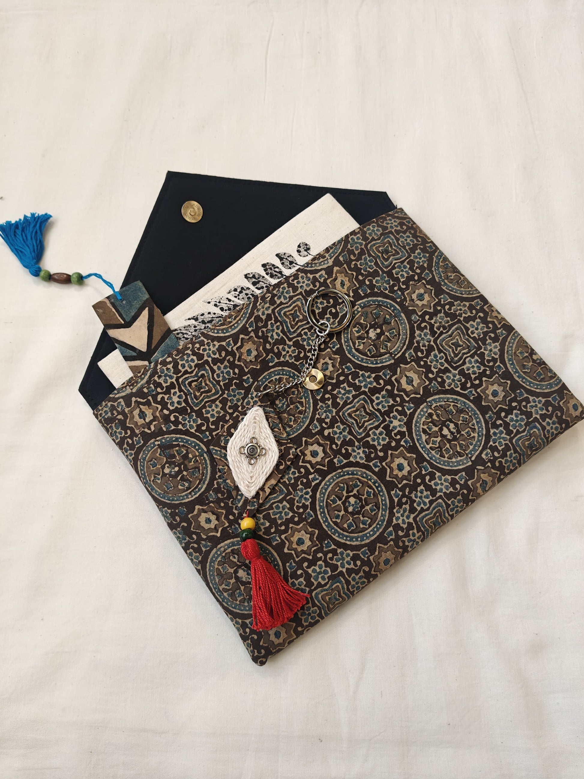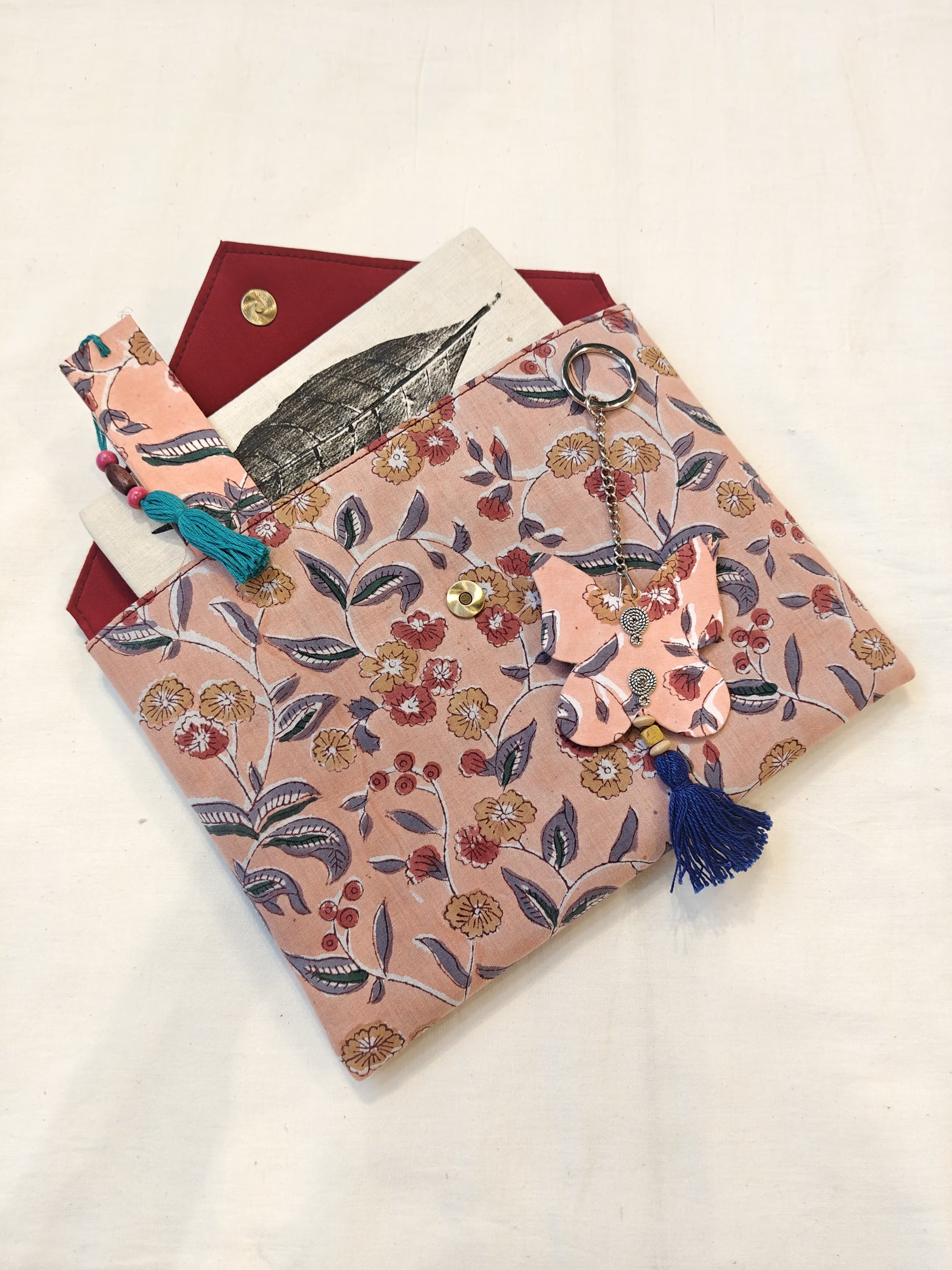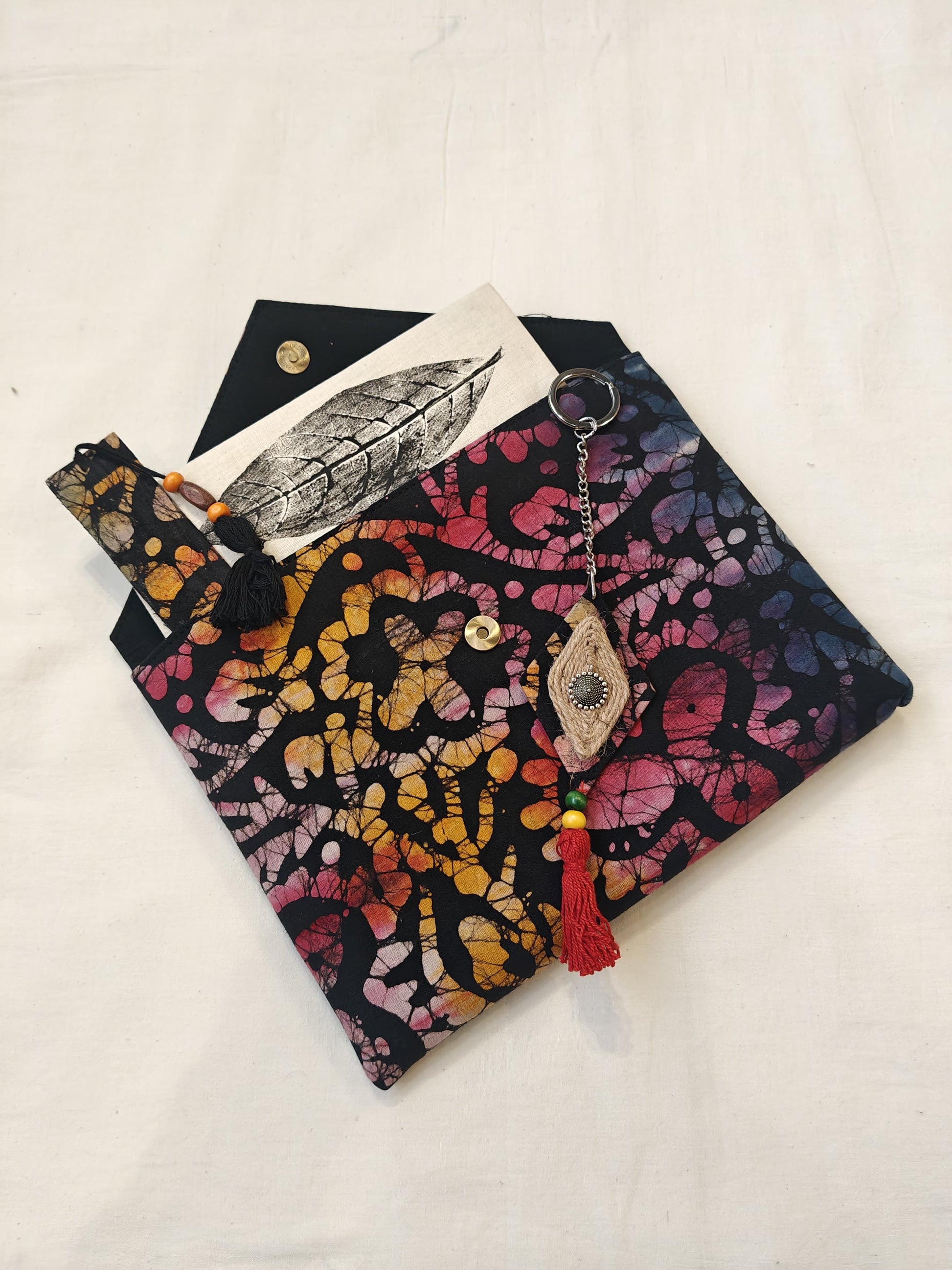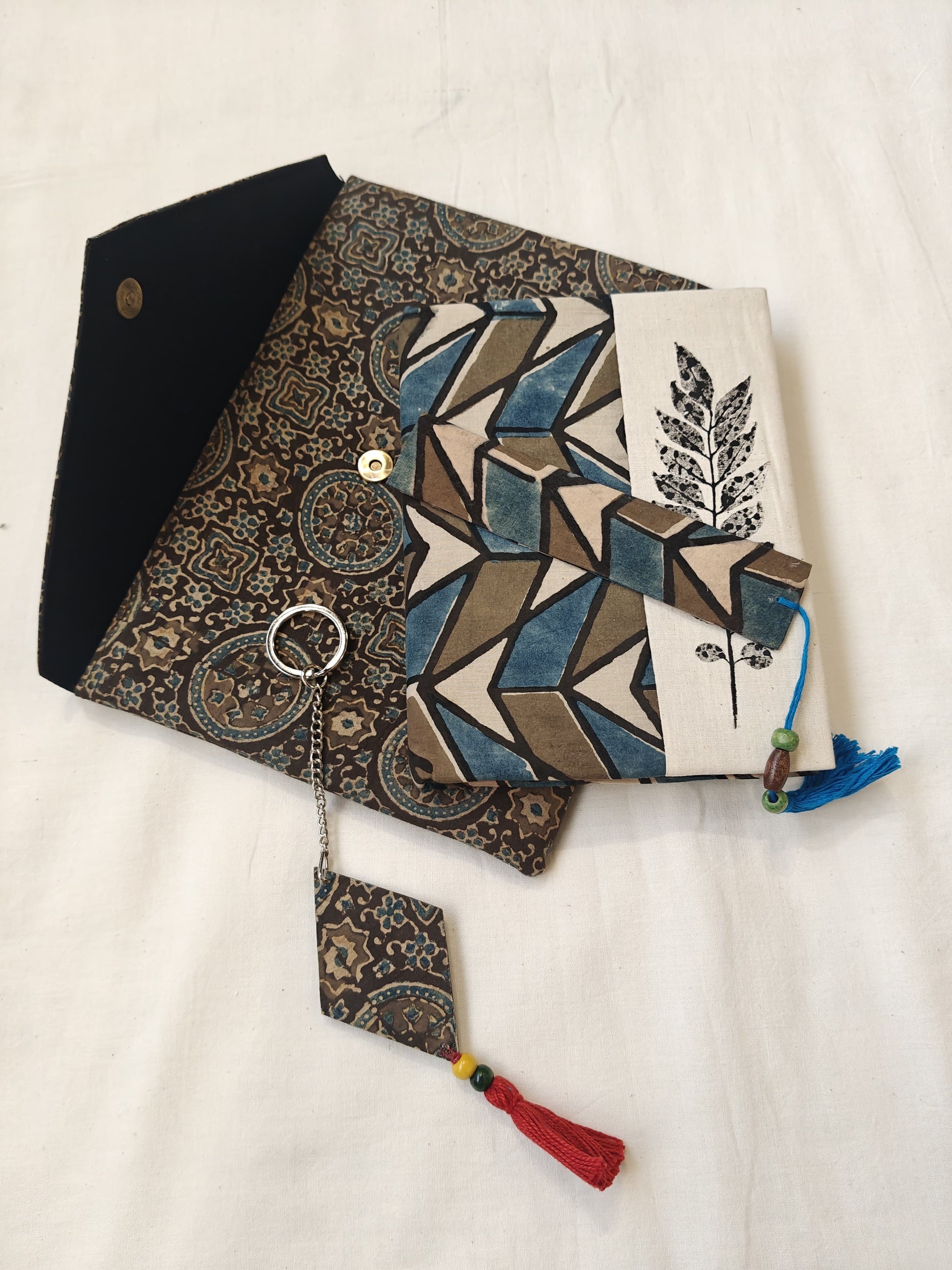 Handmade paper notebook with eco leaf printed fabric cover, hand crafted bookmark, key ring / charm and a container pouch set