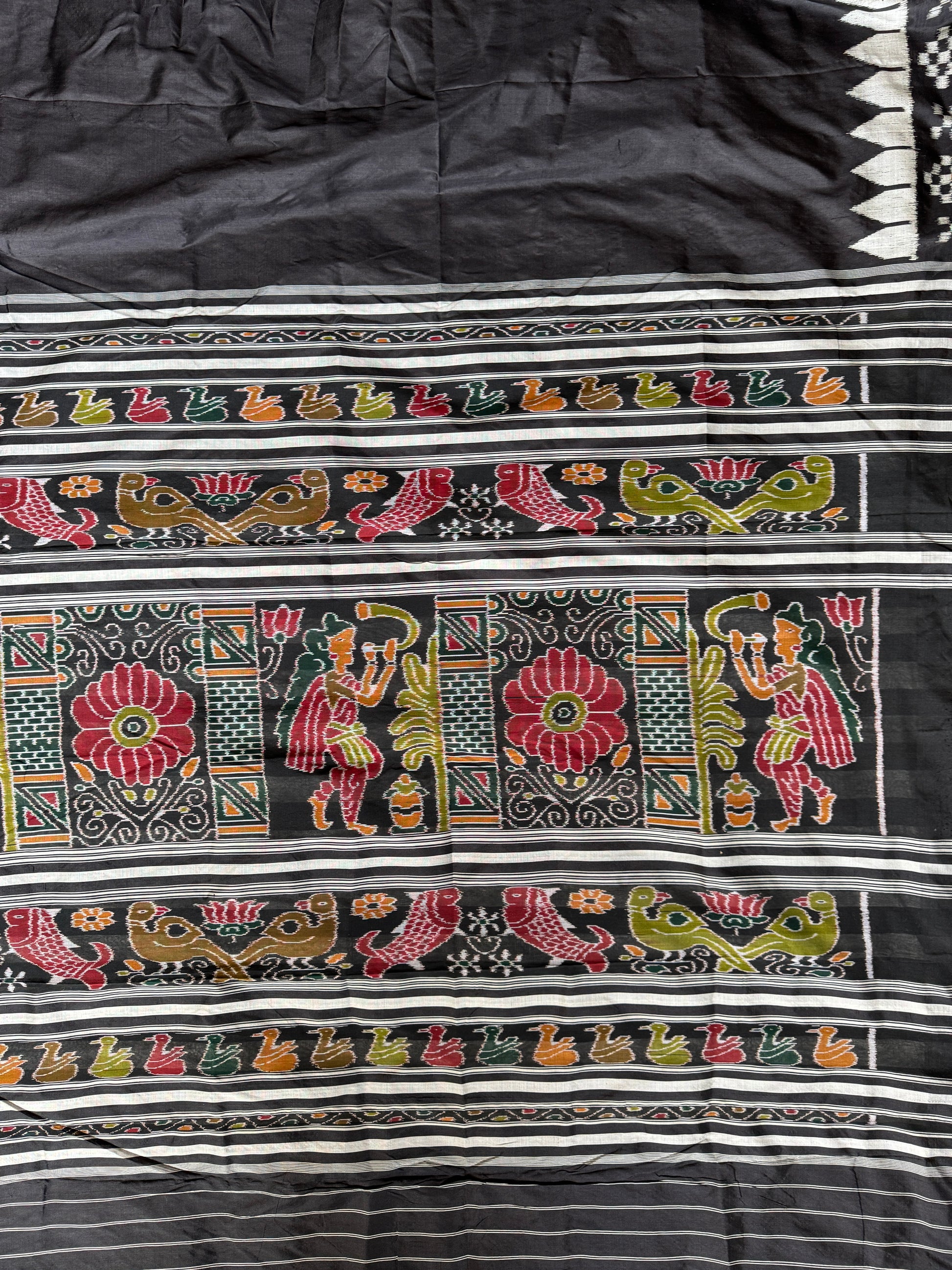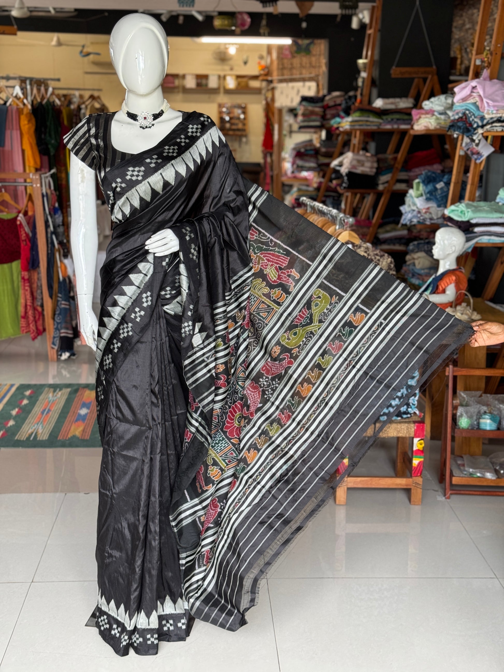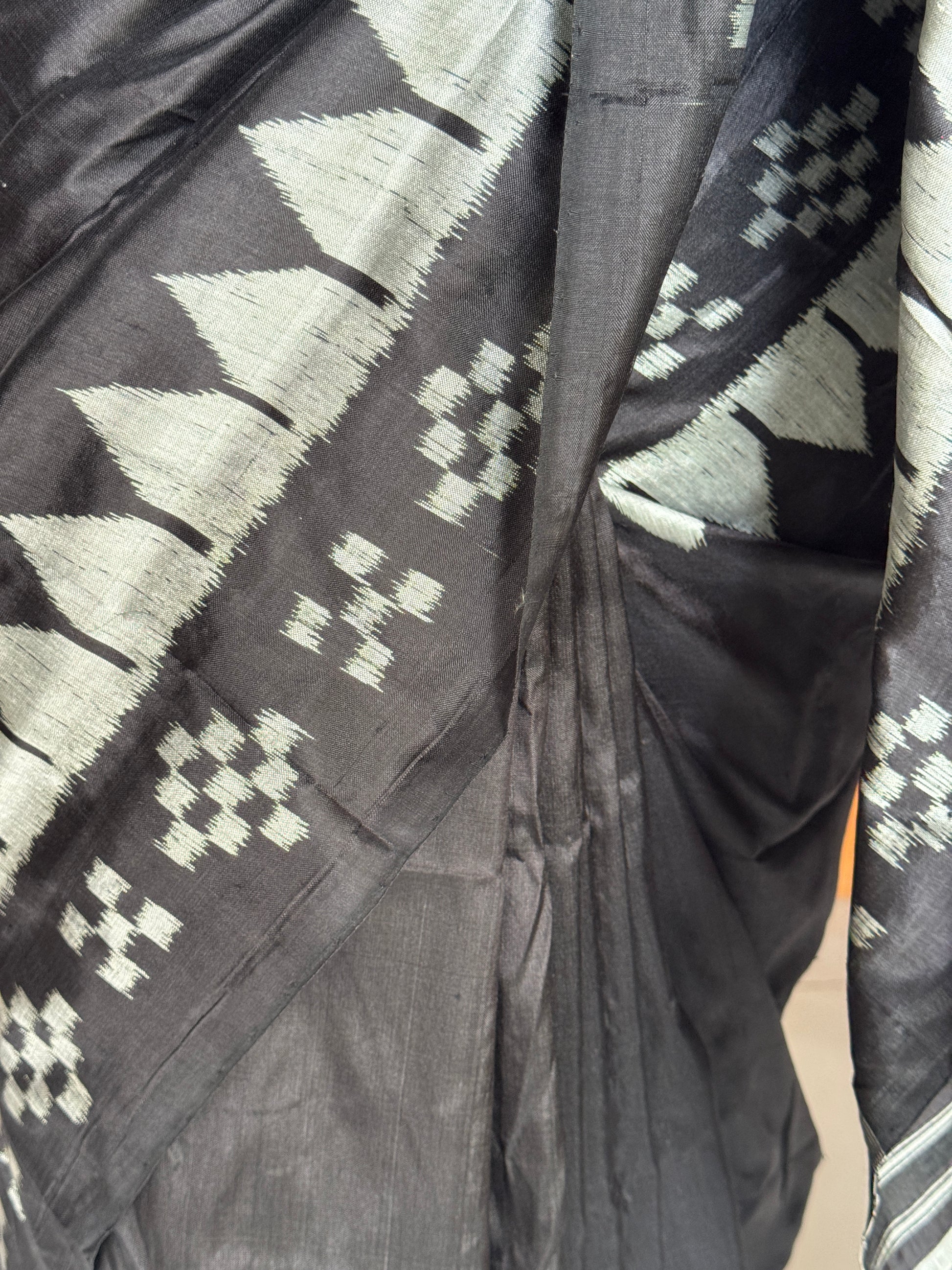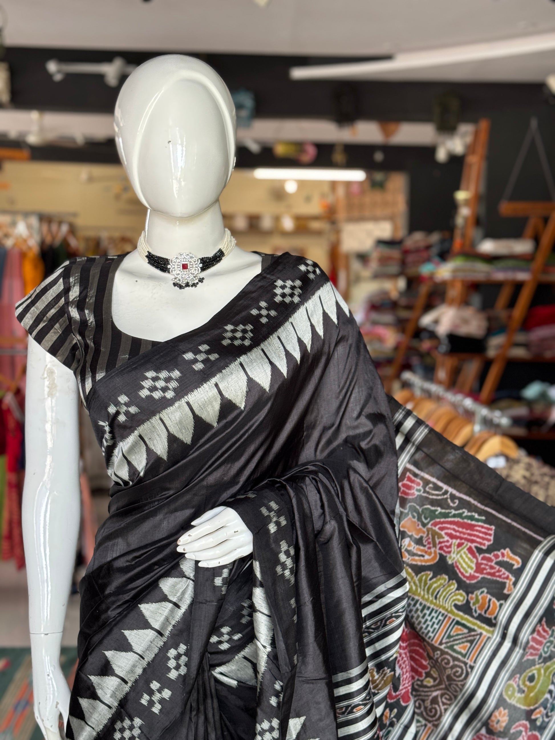 Ikat splendor - black and silver pure silk handloom saree with colorful Ikat pallu and temple border