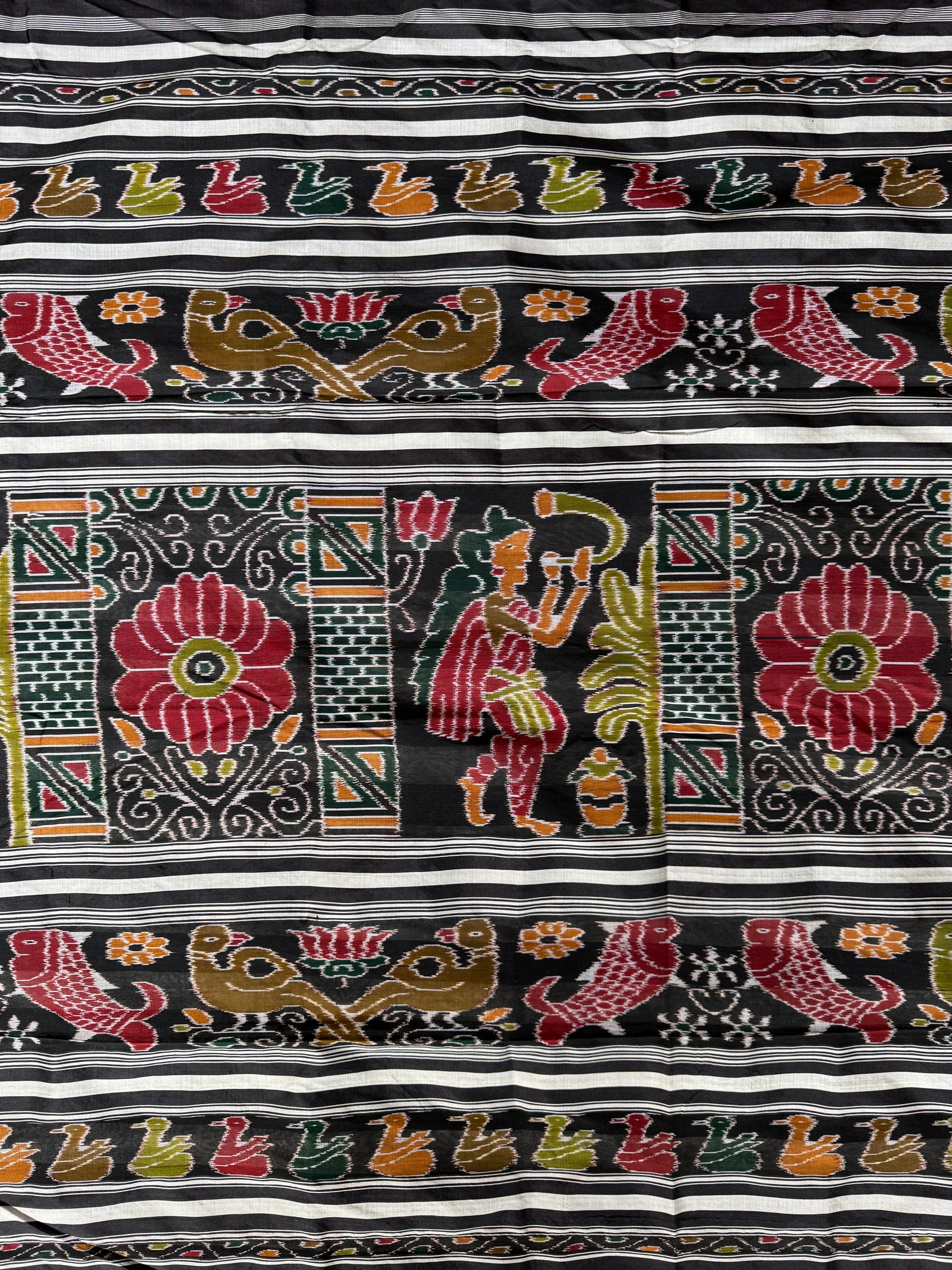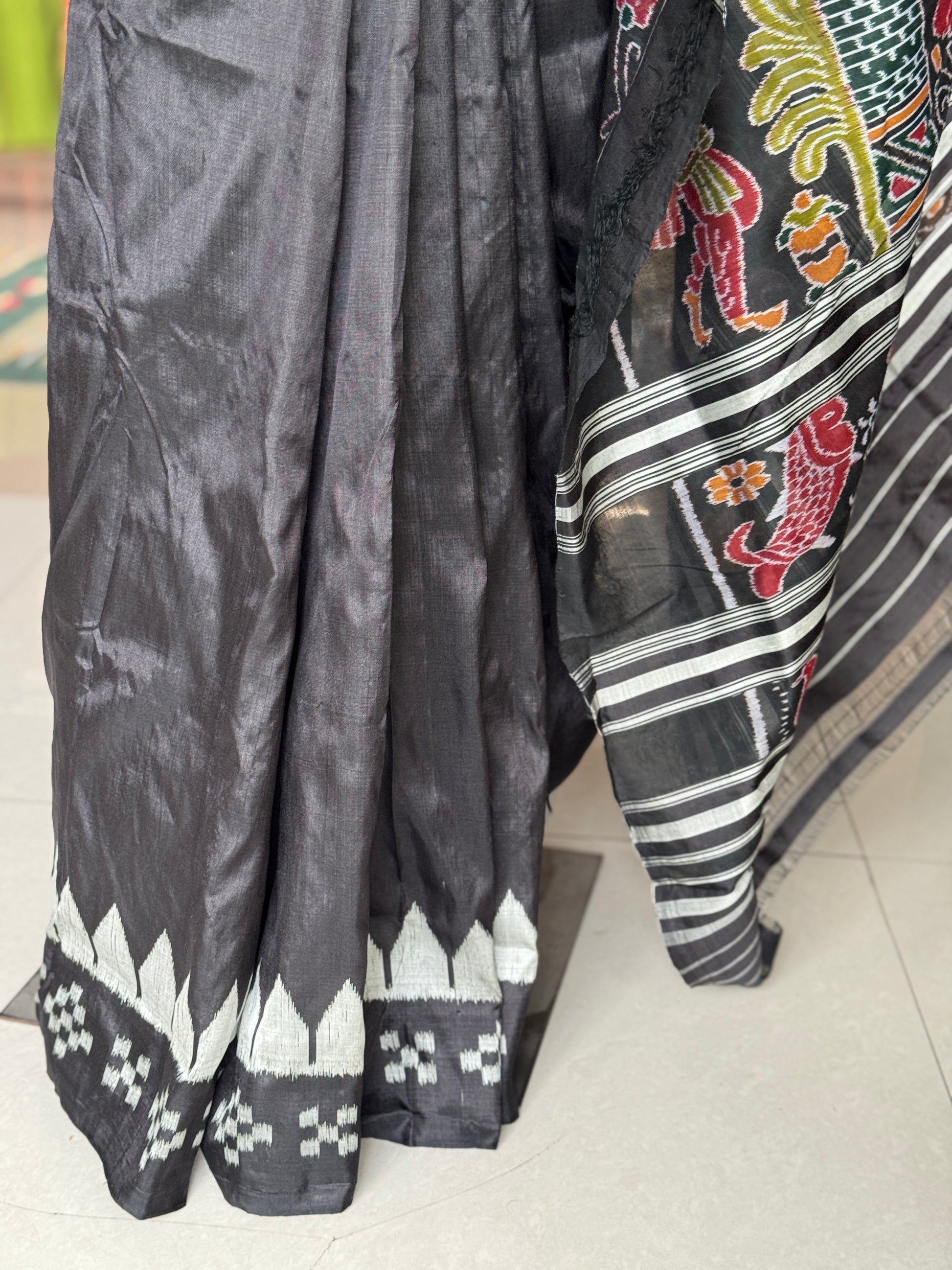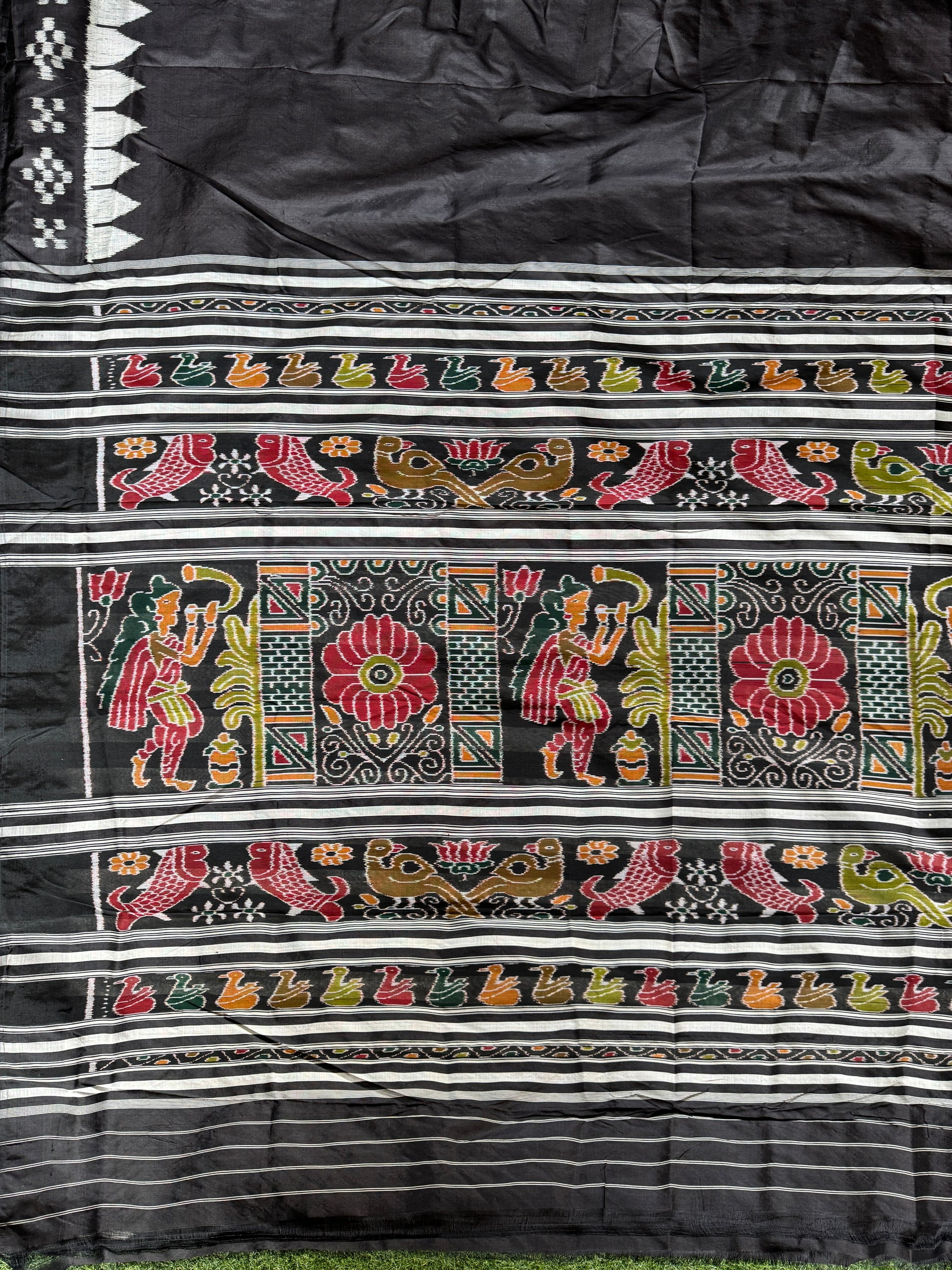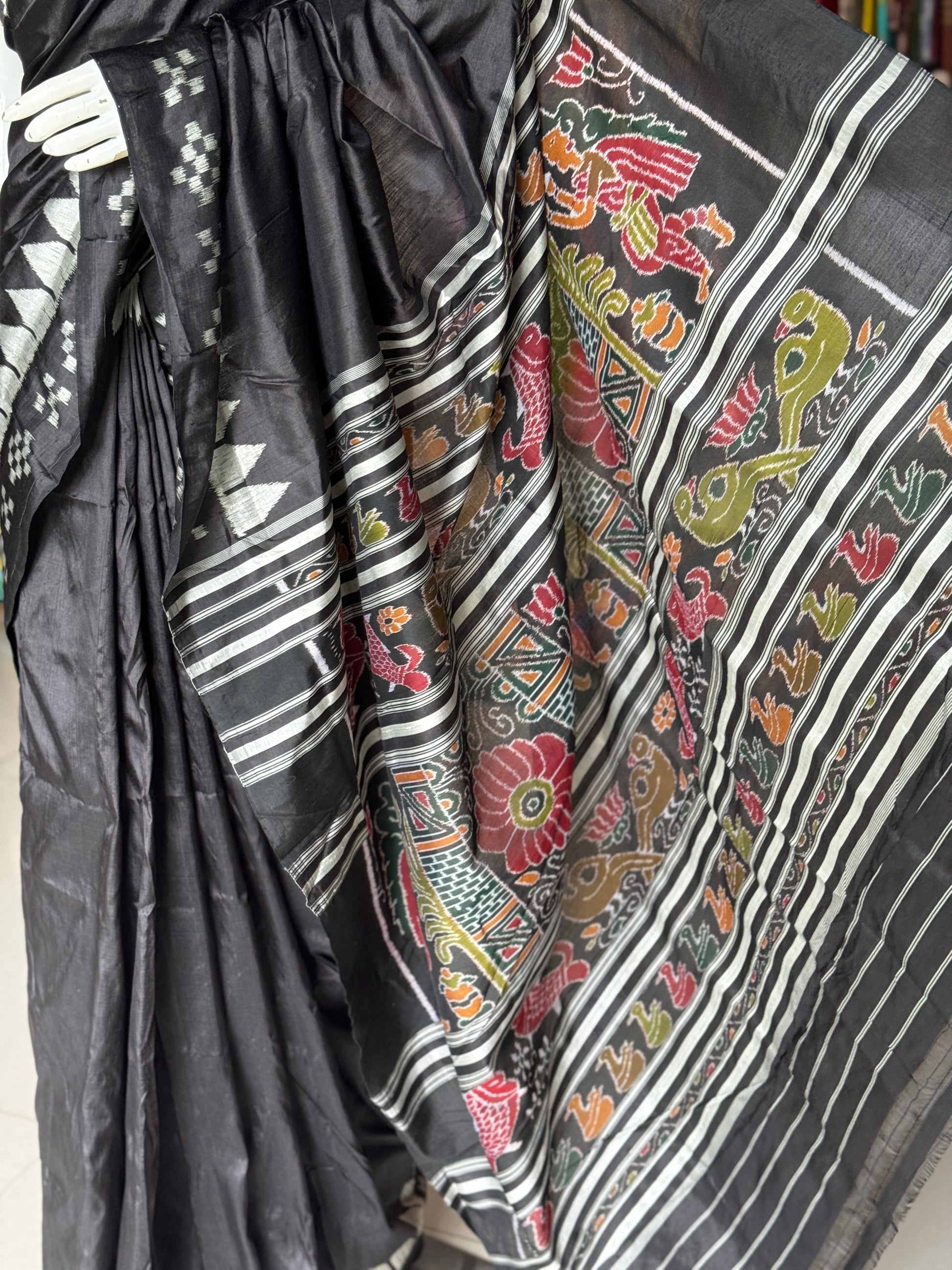 Ikat splendor - black and silver pure silk handloom saree with colorful Ikat pallu and temple border