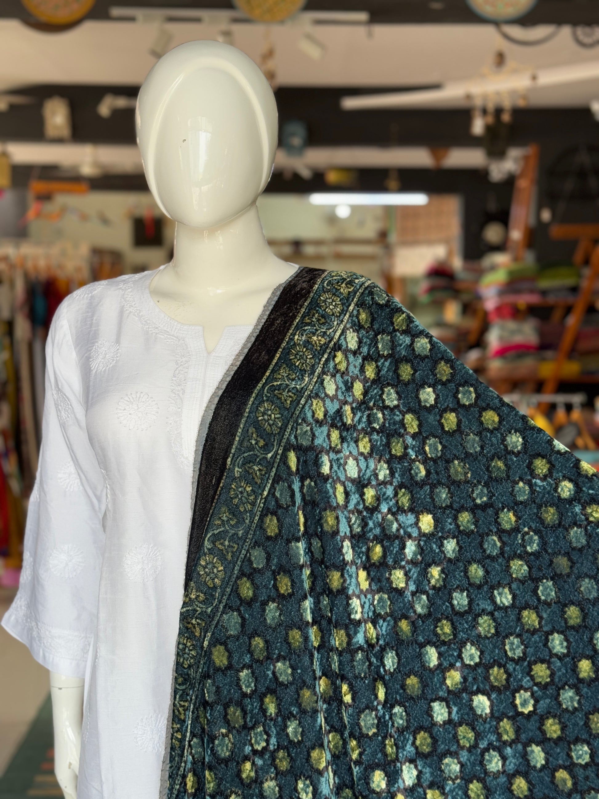 Indigo blue and green luxurious velvet dupatta with hand block Ajrakh prints