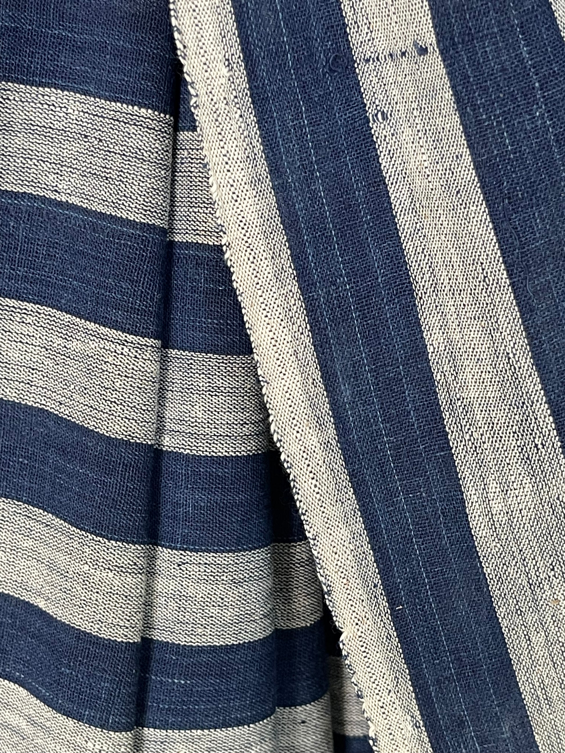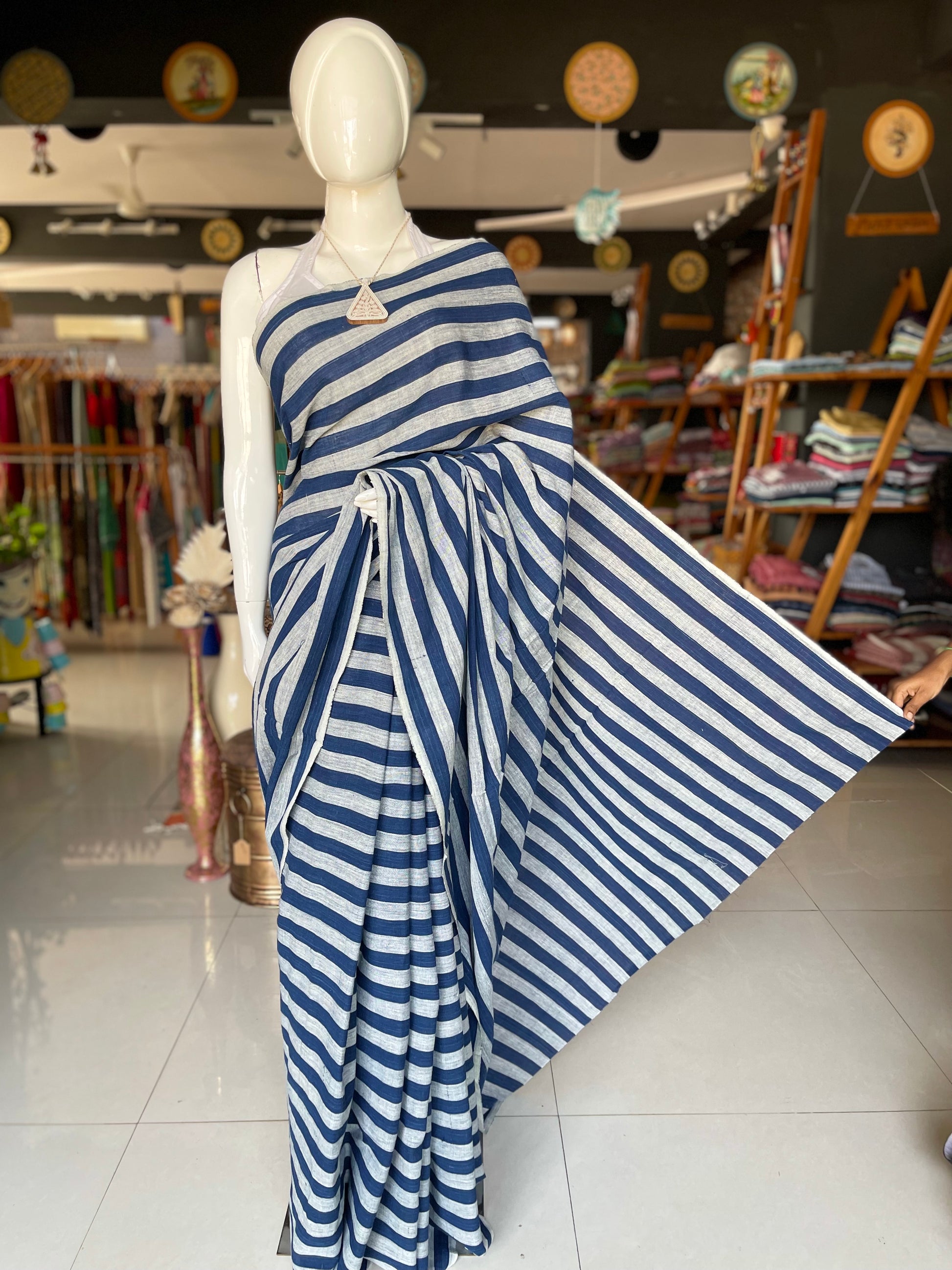 Indigo broad stripes cotton hand spun, hand woven, natural dyed yardage saree
