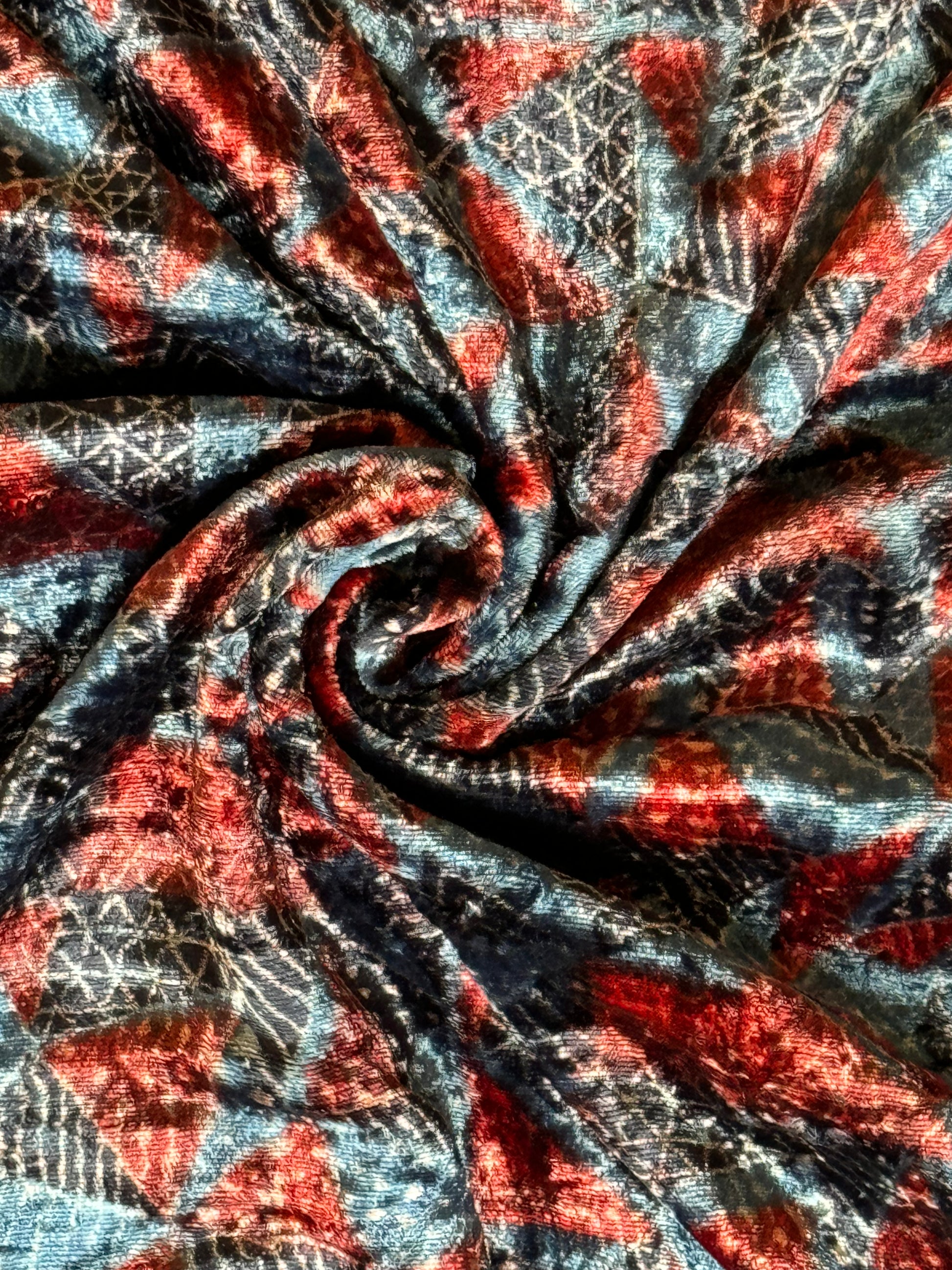 Indigo maroon black triangles design ajrakh hand block prints on velvet fabric