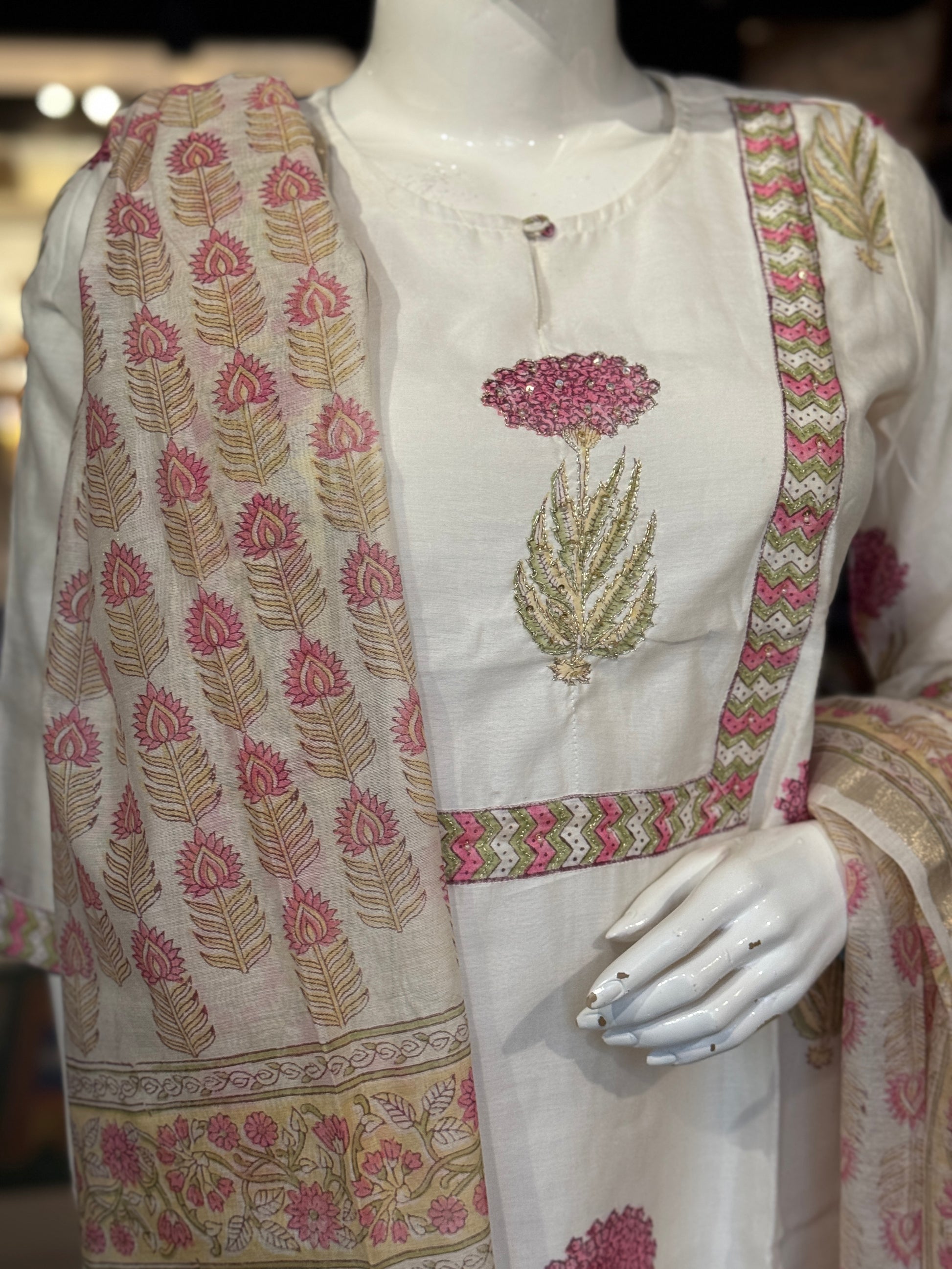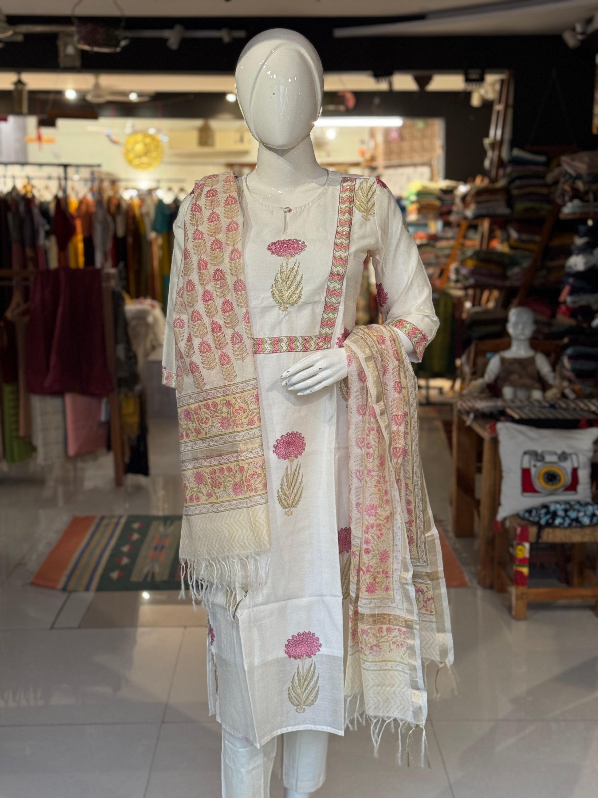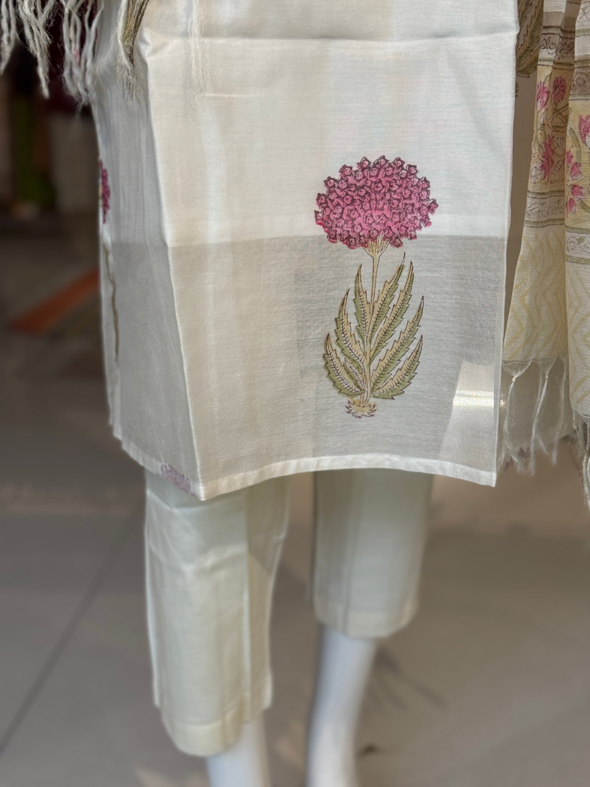 Ivory tone hand block print floral chanderi hand embroidered straight kurti, pants and dupatta - 3 piece suit set