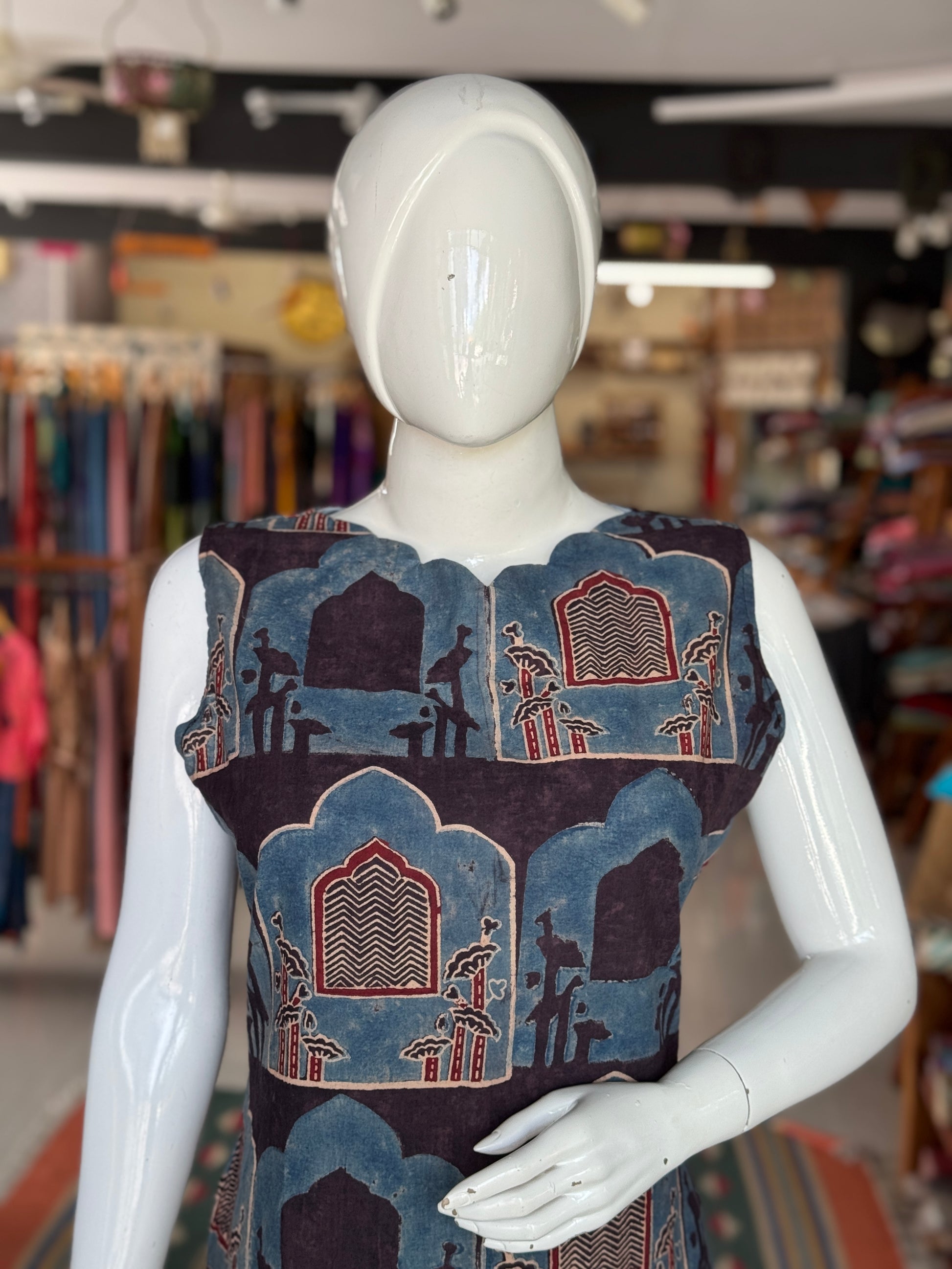 Jharokhas design Indigo Ajrakh hand block printed cotton sleeveless straight kurti