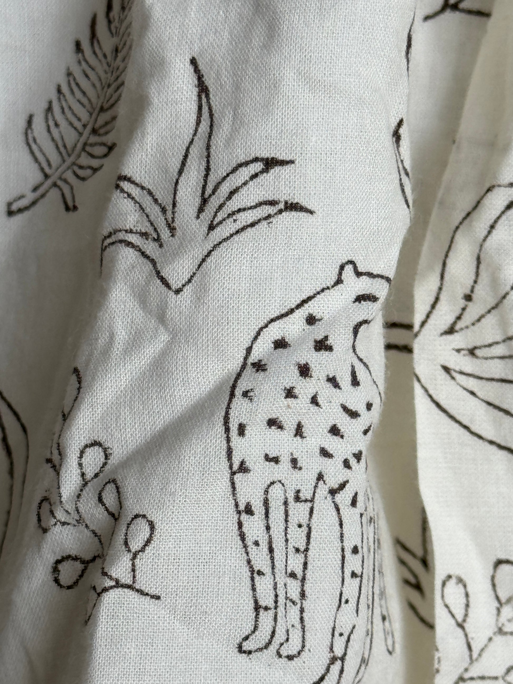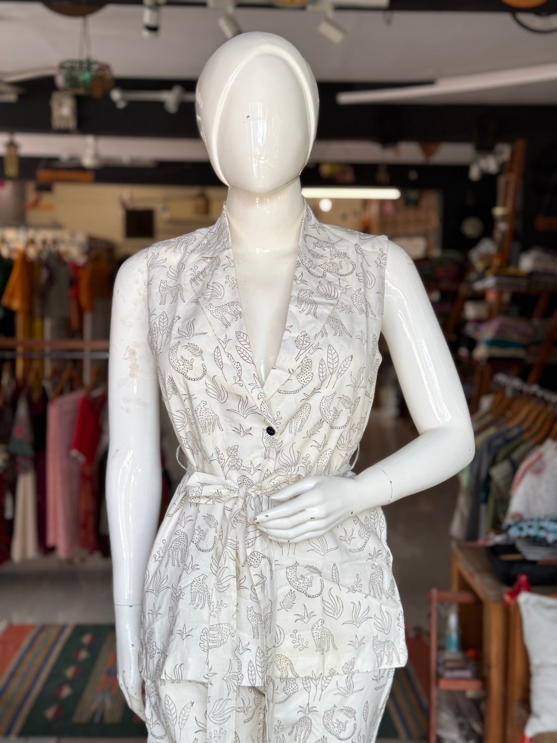 Jungle theme hand block printed collared cotton sleeveless gilet jacket and pants coord set