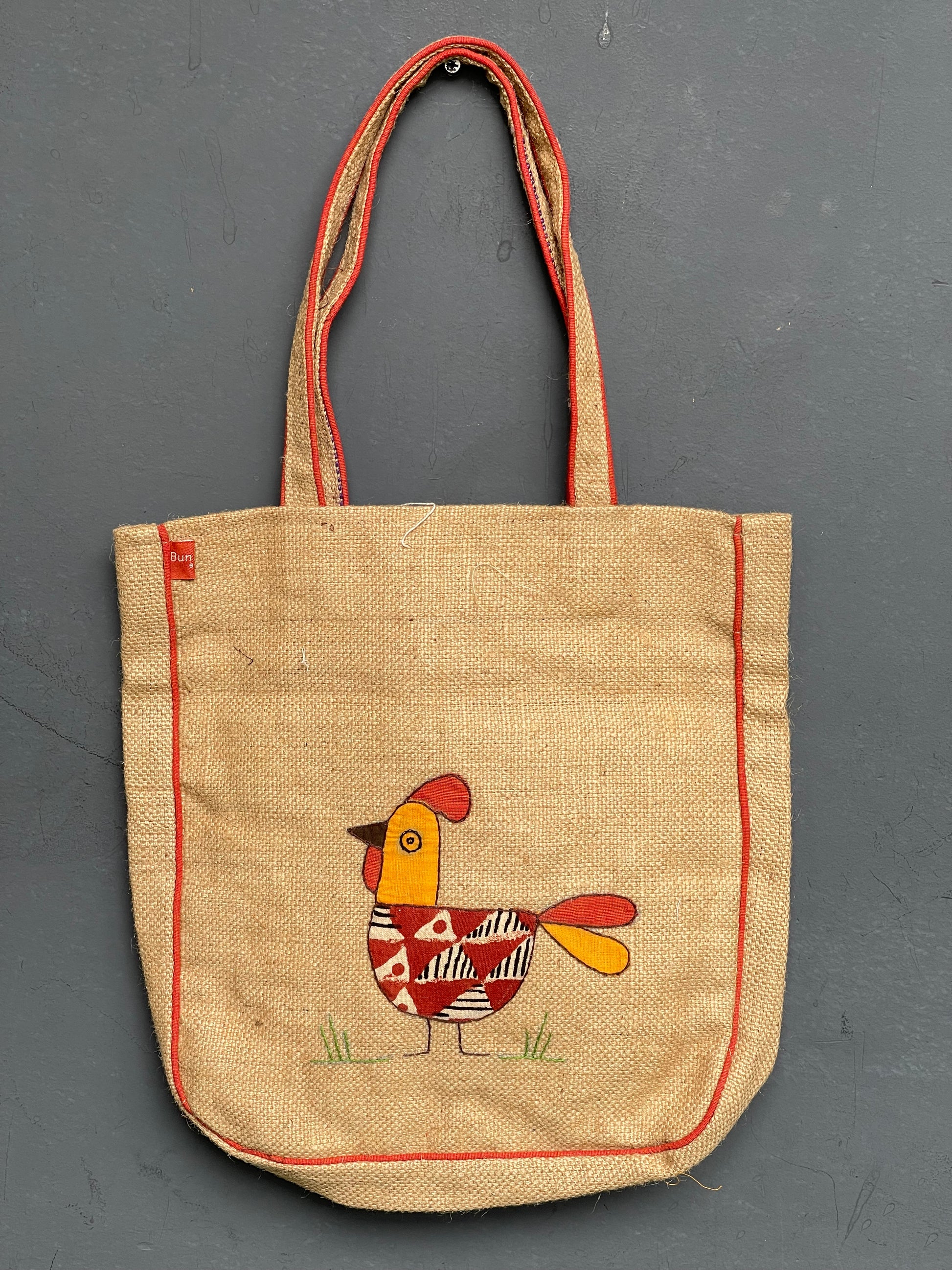 Jute cock design hand embroidered with appliq patch work bag