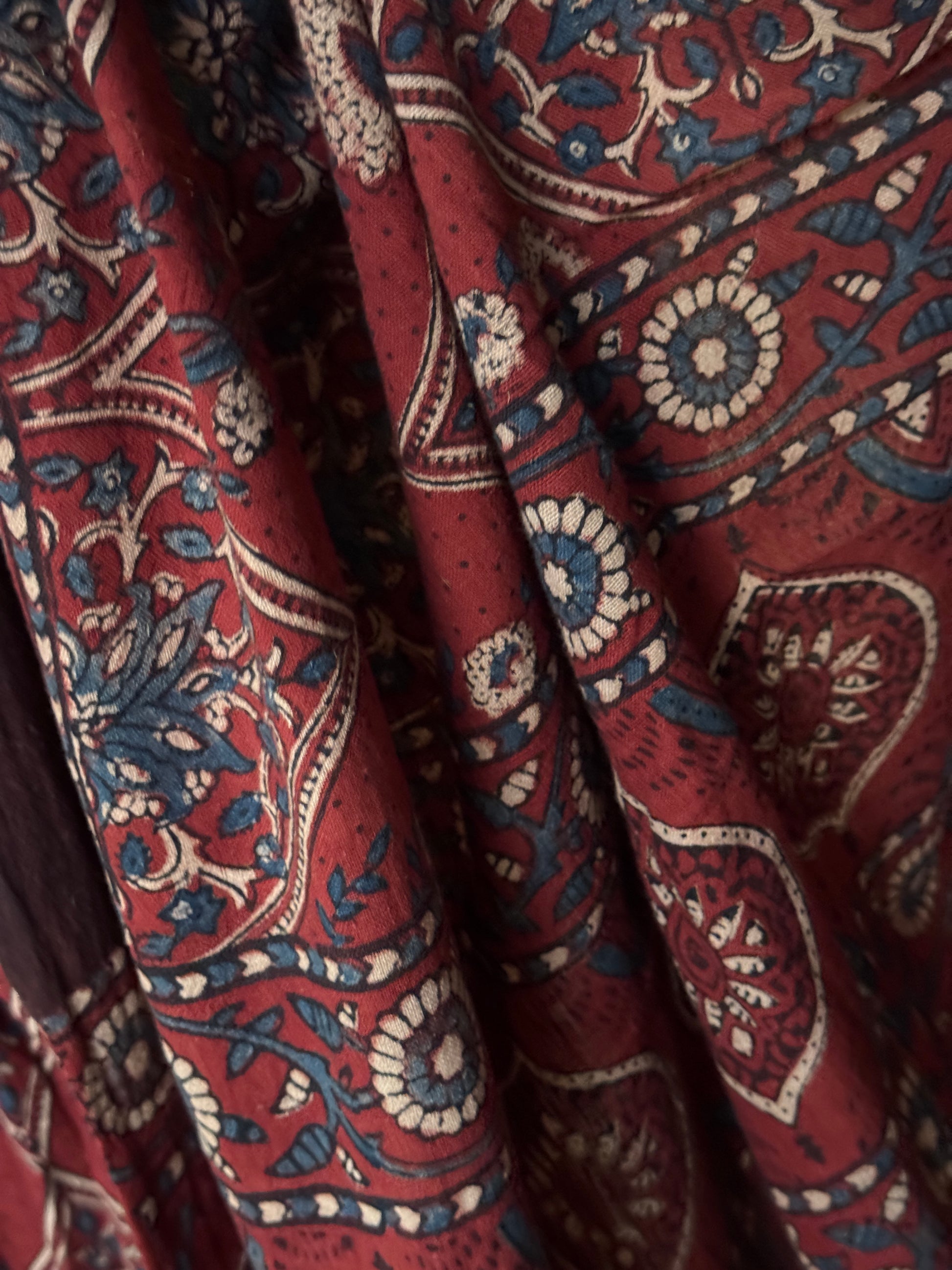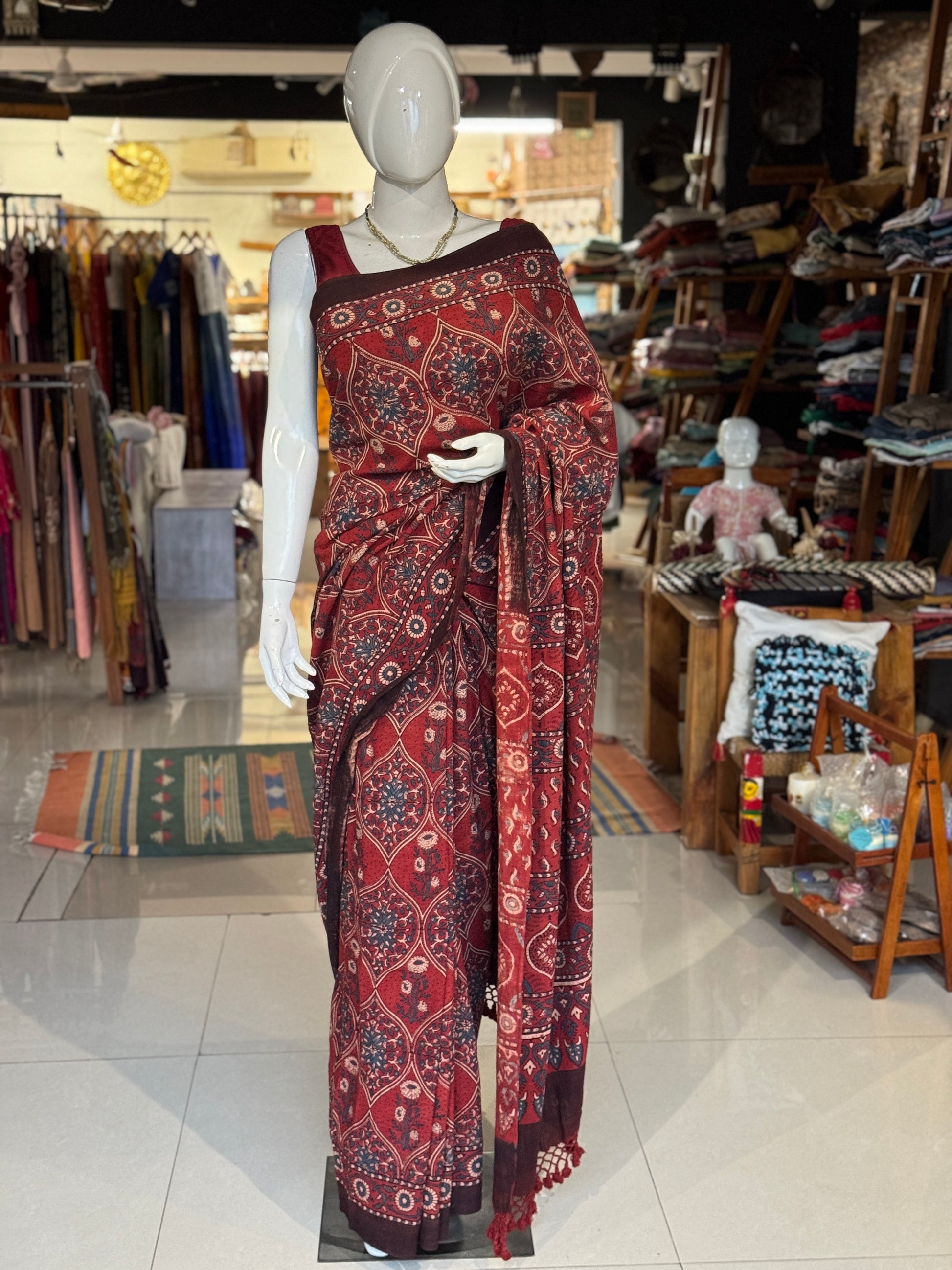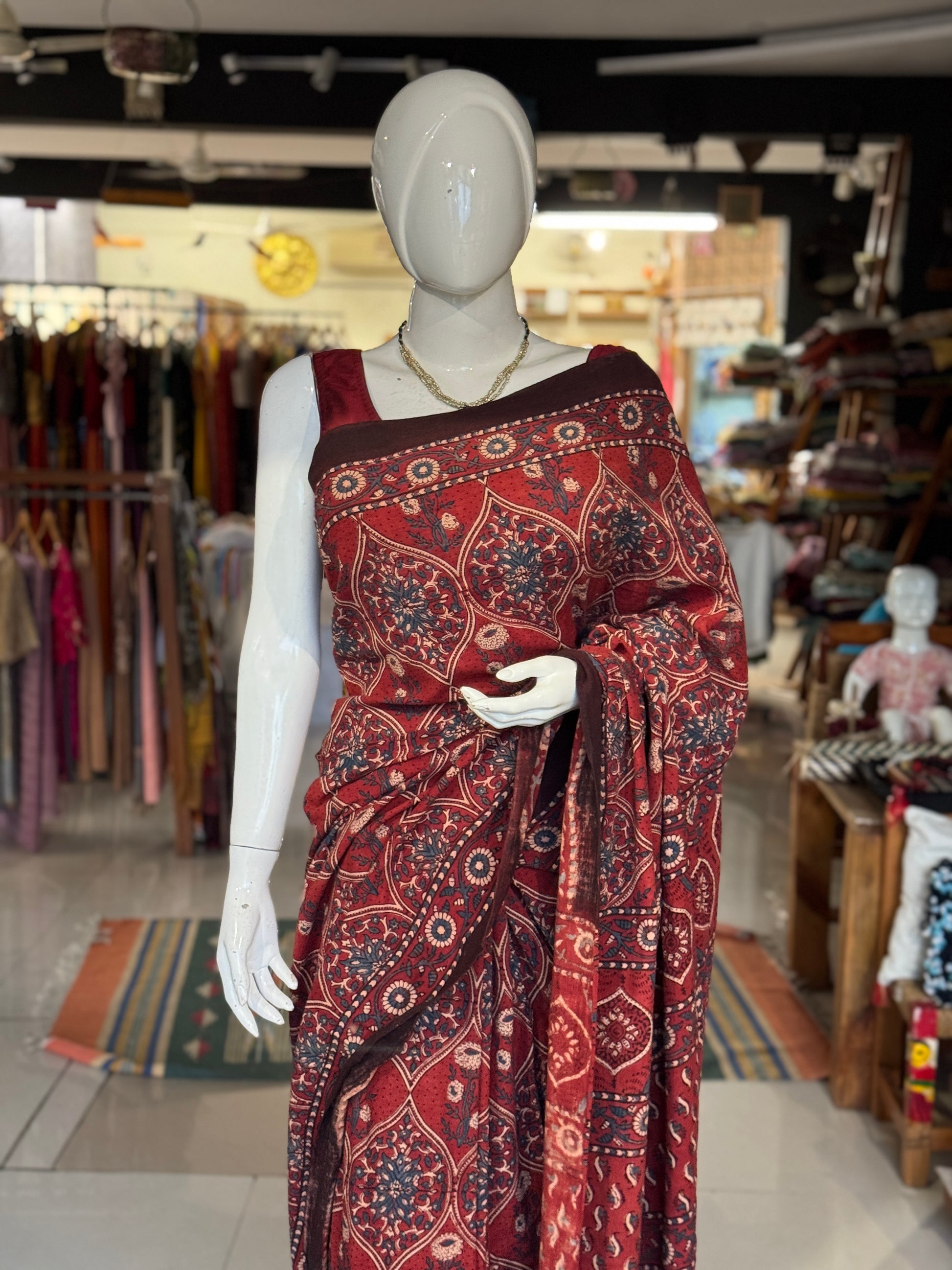 Kala cotton hand woven saree with maroon tone Ajrakh hand block prints