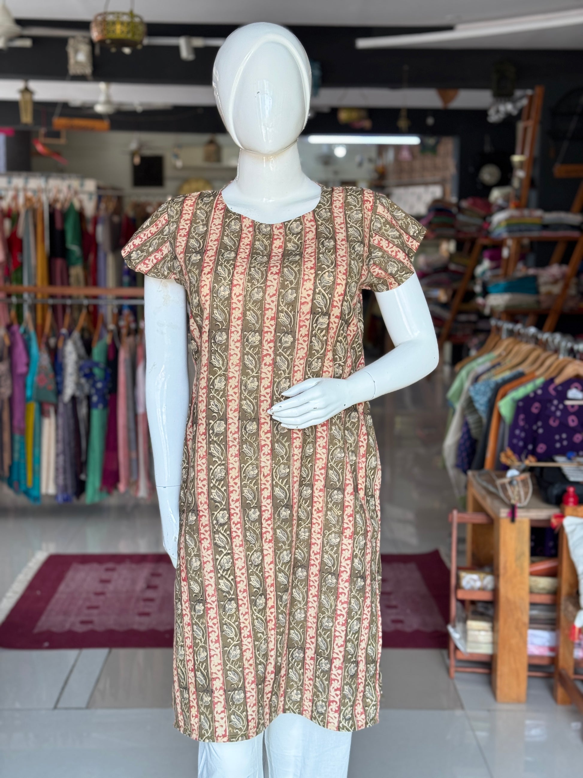Kalamkari hand block printed cotton straight kurti with fancy neckline