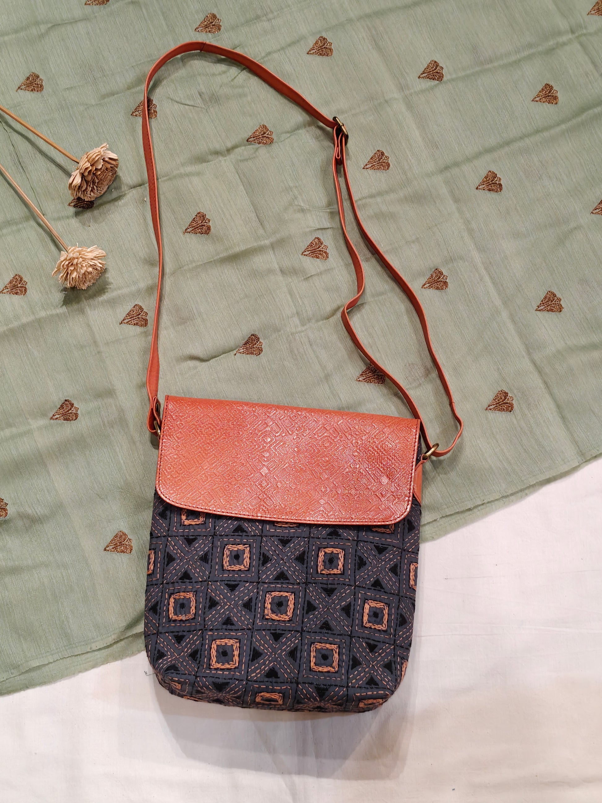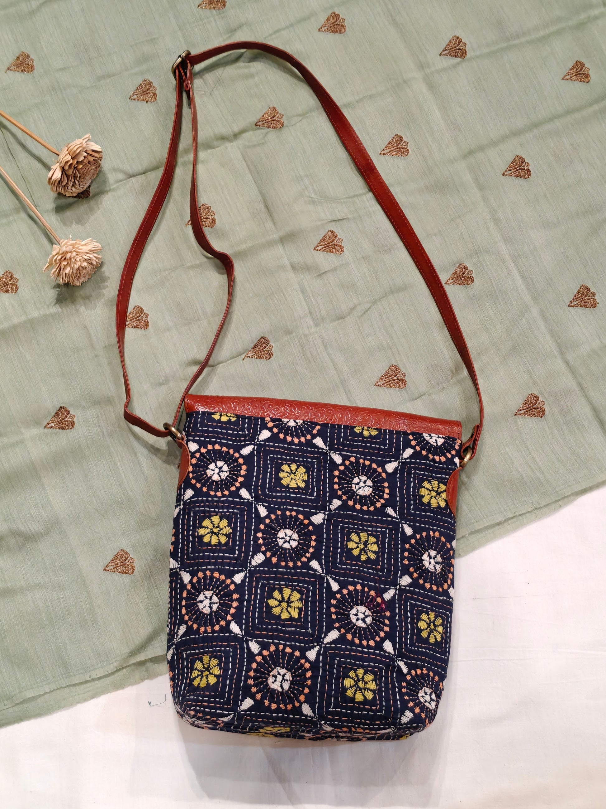Kantha embroidered fabric with embossed leather flap - hand crafted adjustable length bag