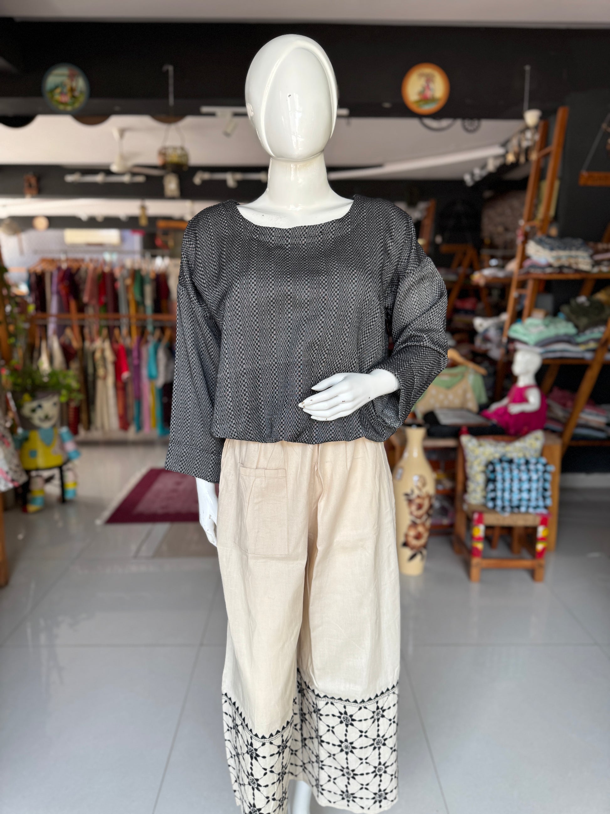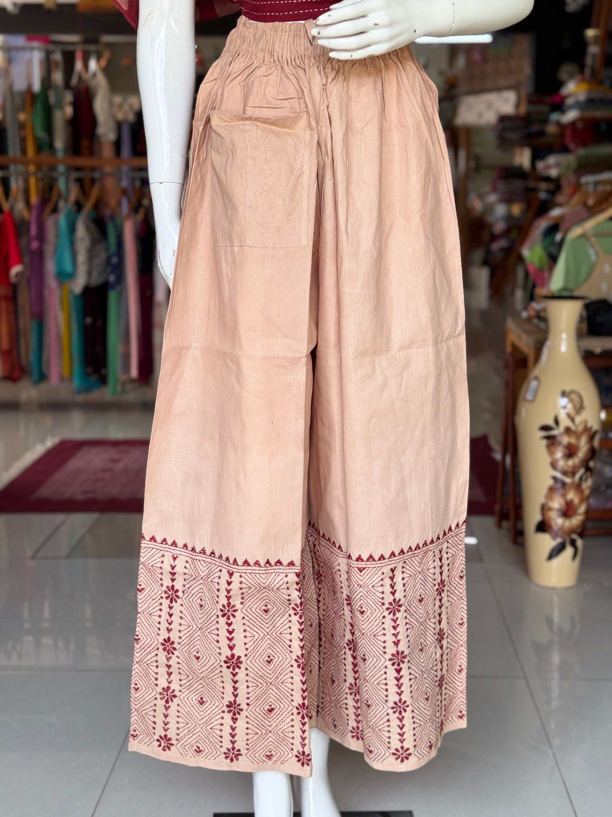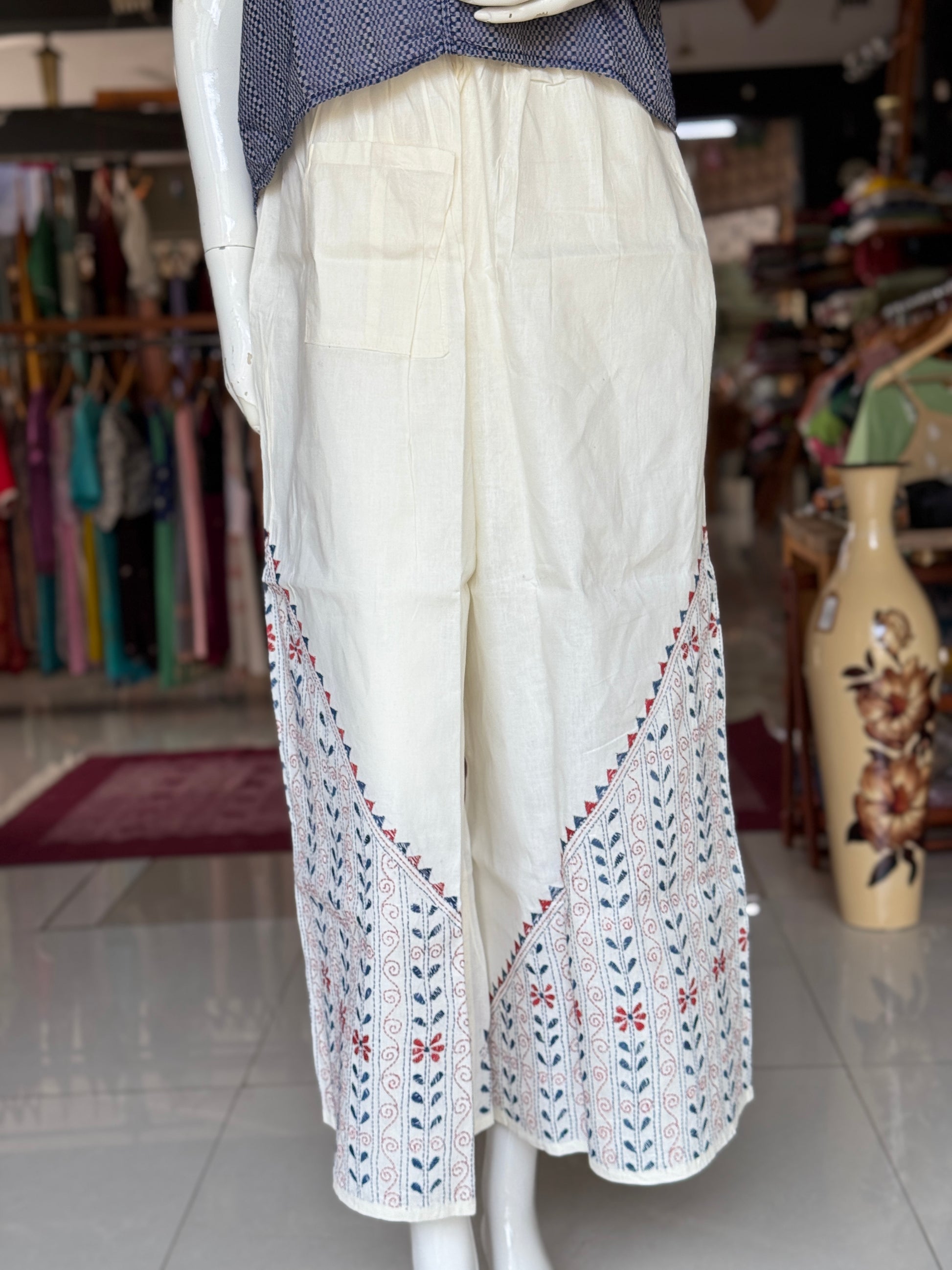 Kantha hand embroidered cotton poplin free size plazo with front pocket