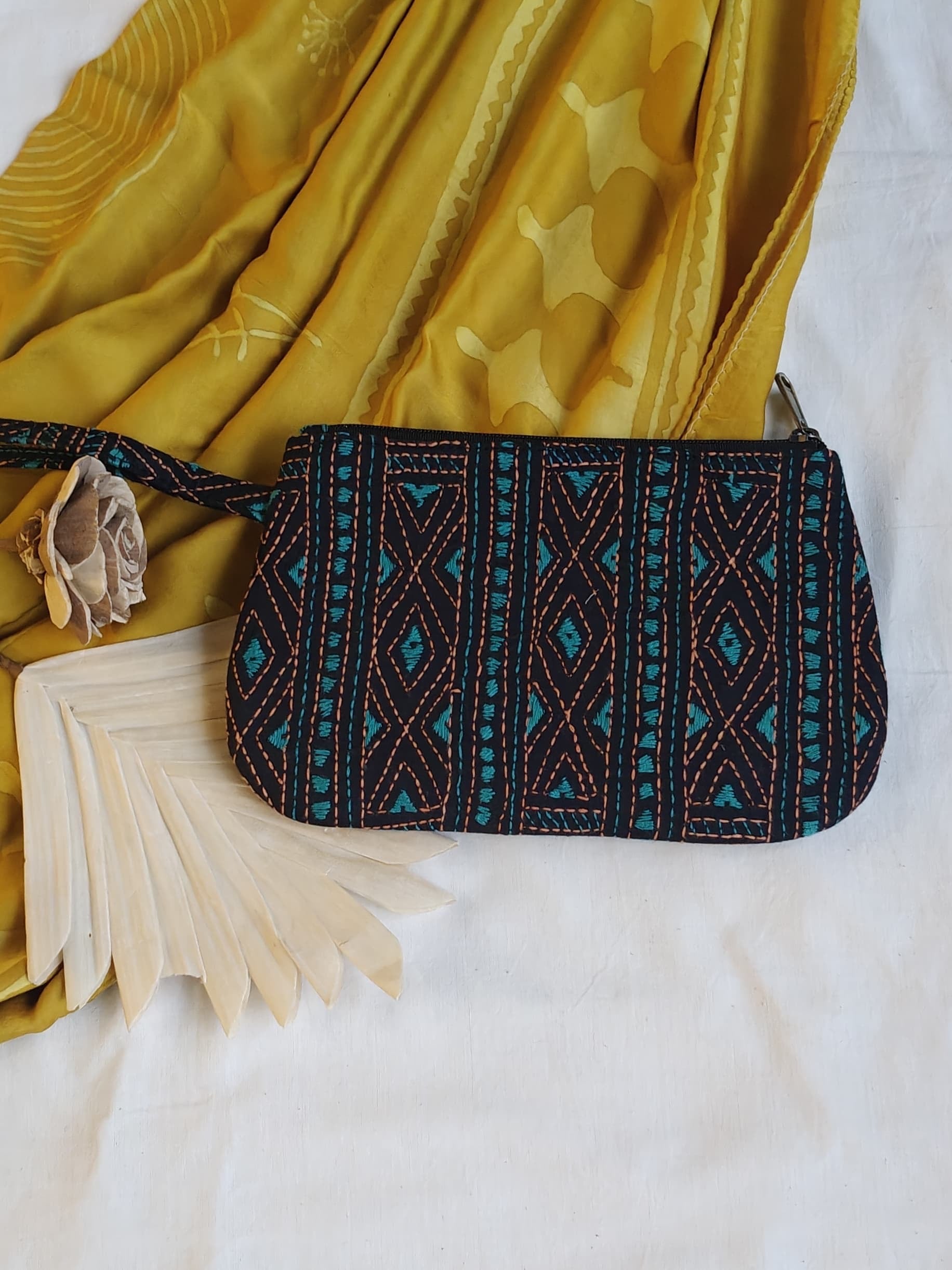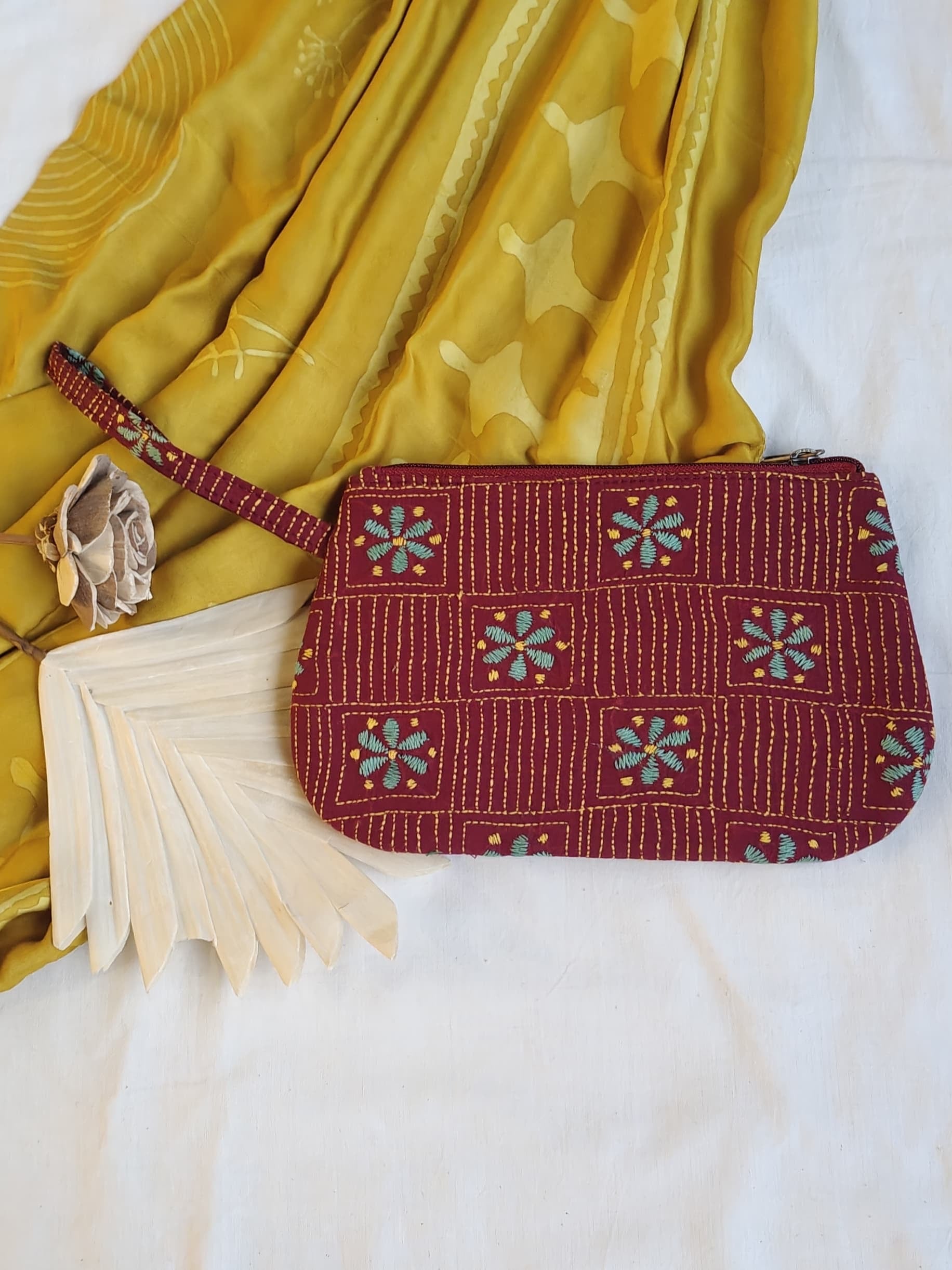 Kantha hand embroidered wristlet pouch - multiple colors and designs available