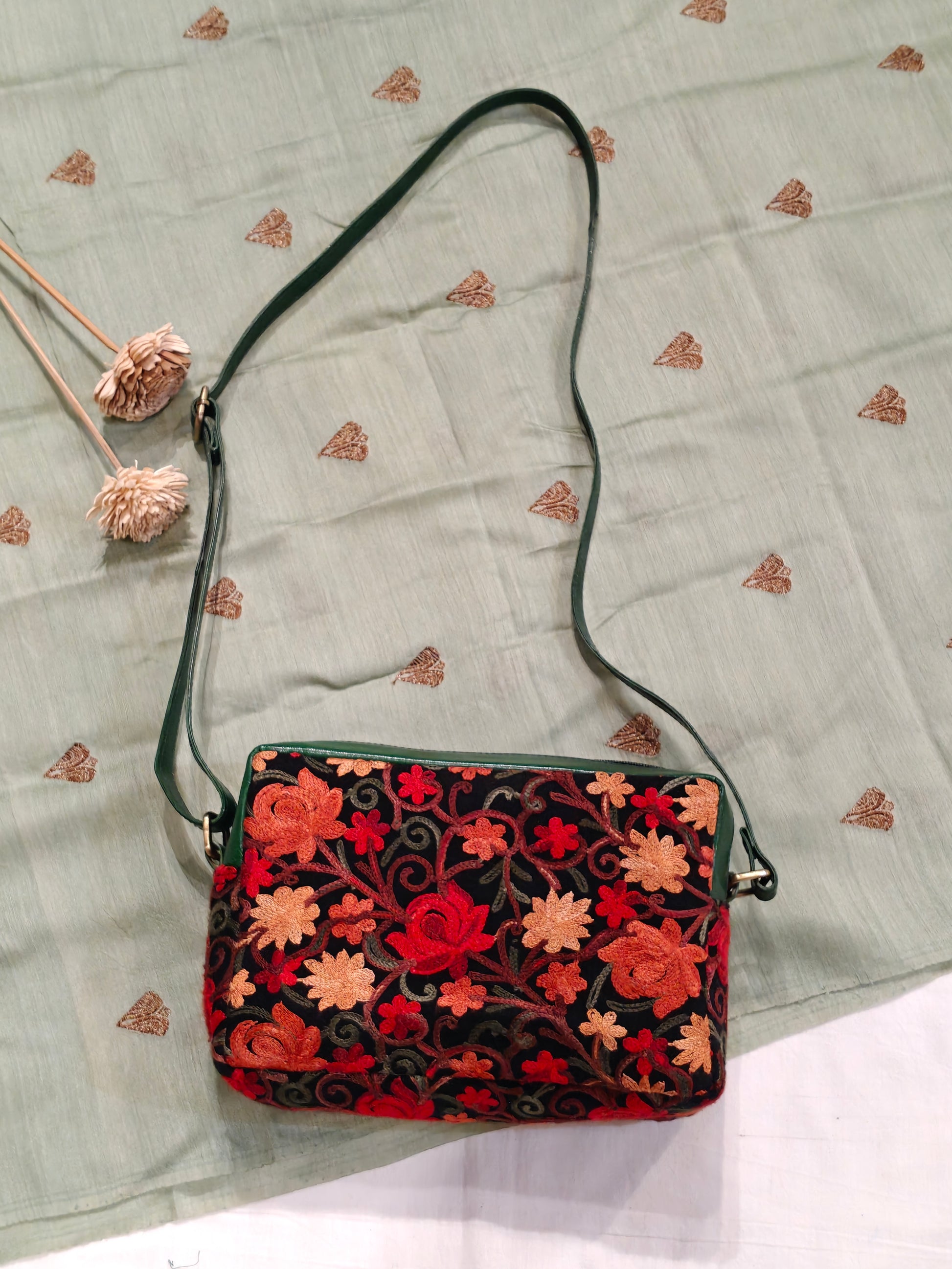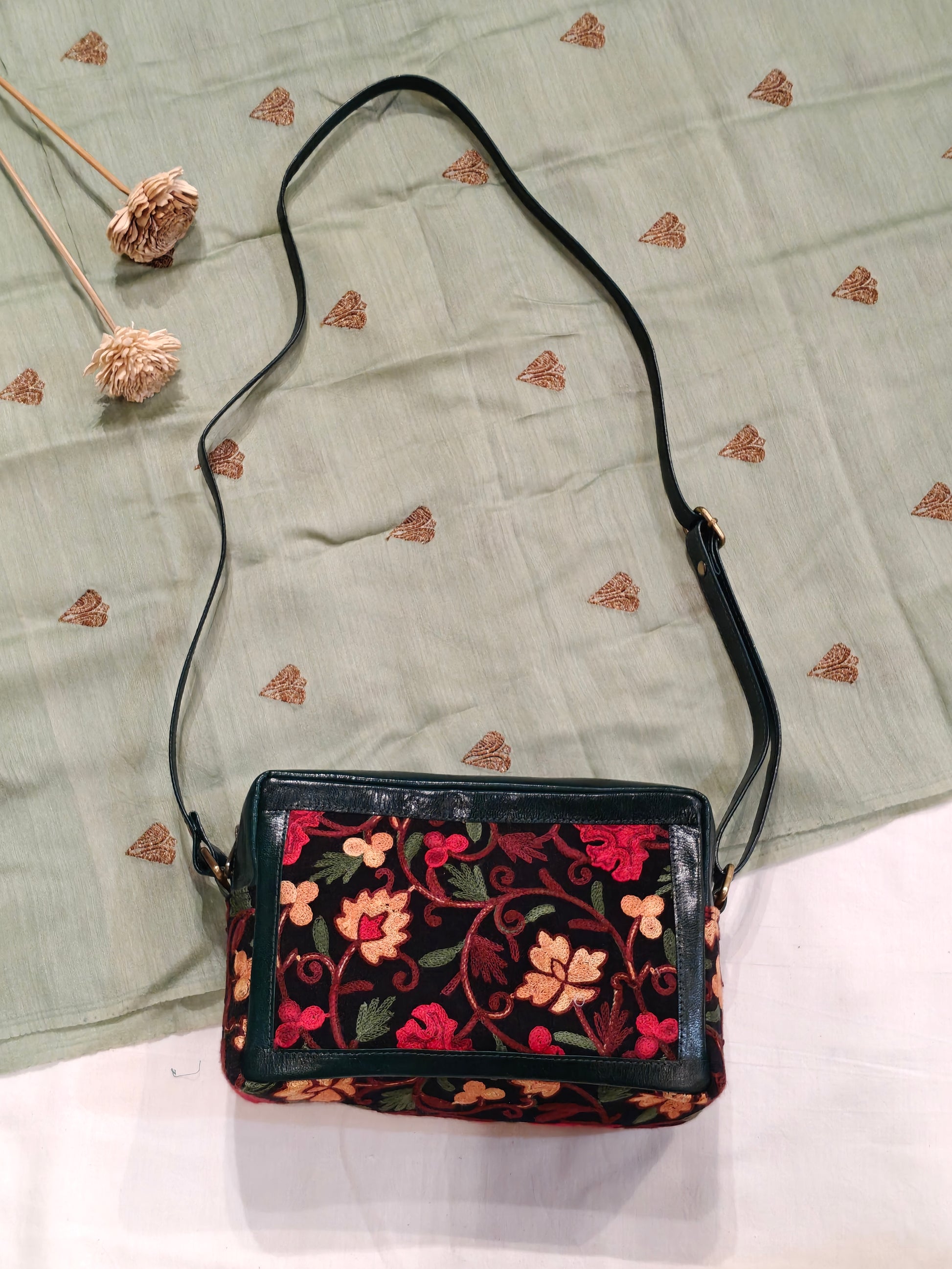 Kashmiri floral Aari embroidered rectangular leather boxy sling bag with adjustable length leather strap