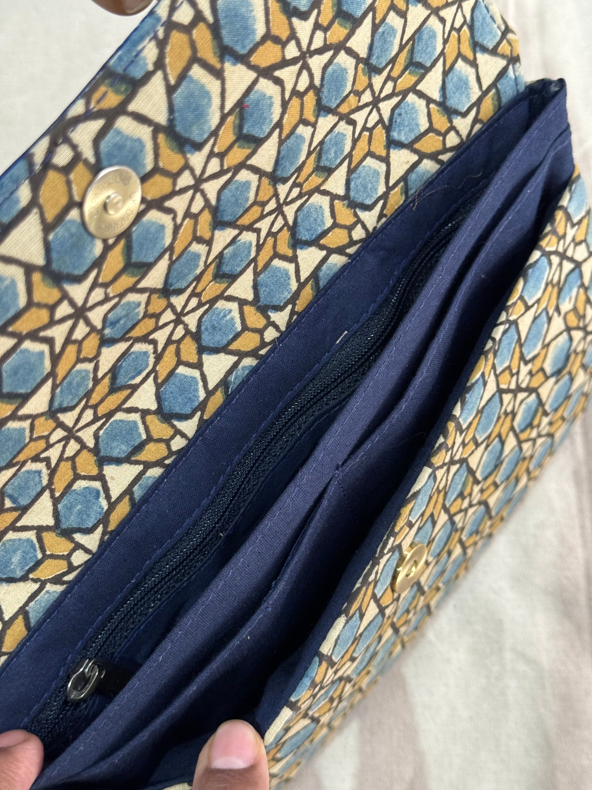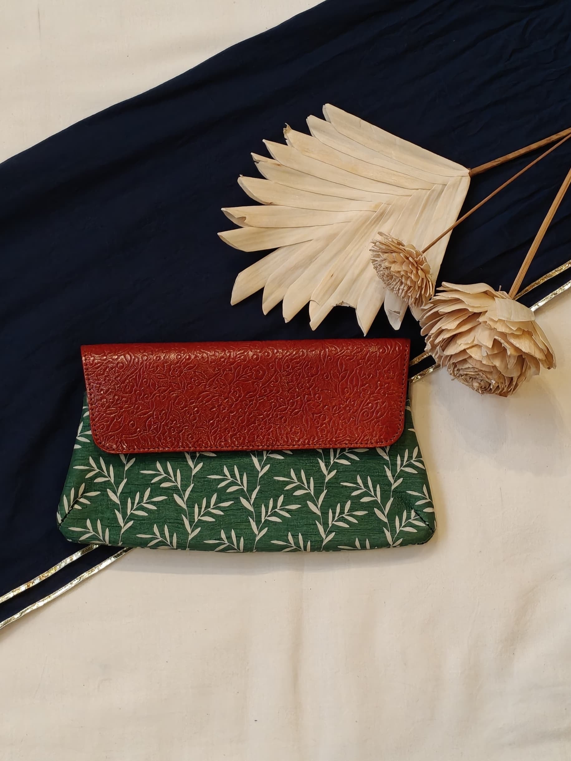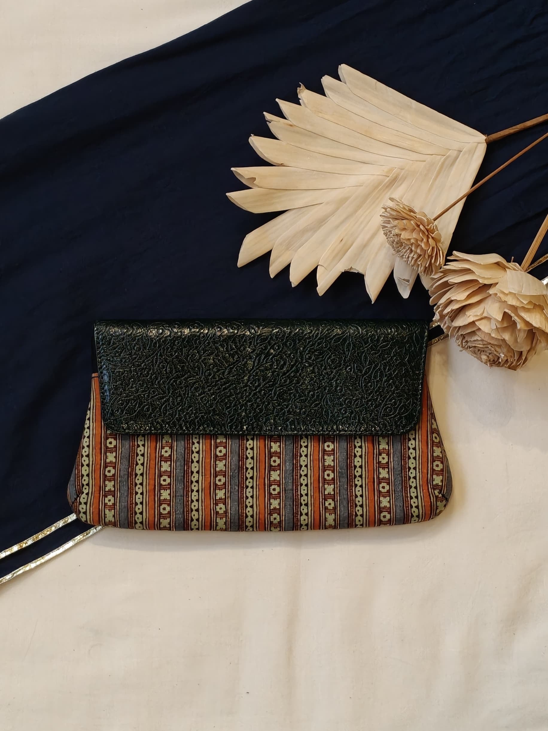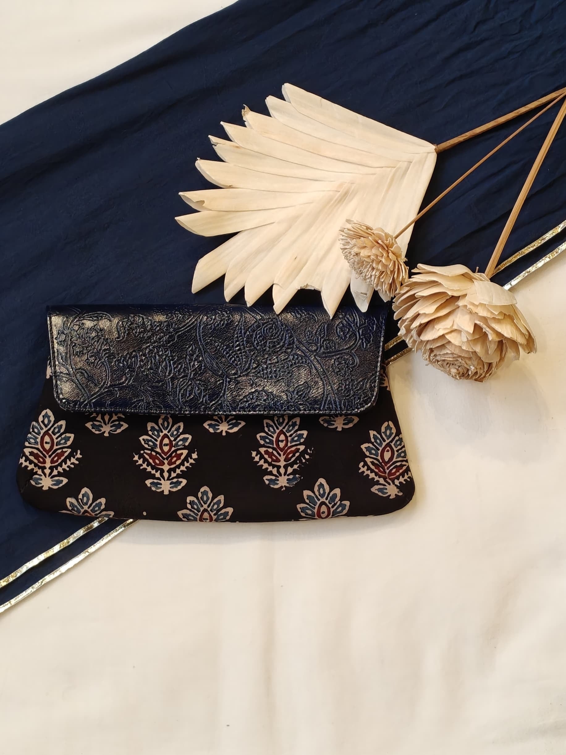 Leather hand embossed flap purse / clutch with hand block printed fabric base