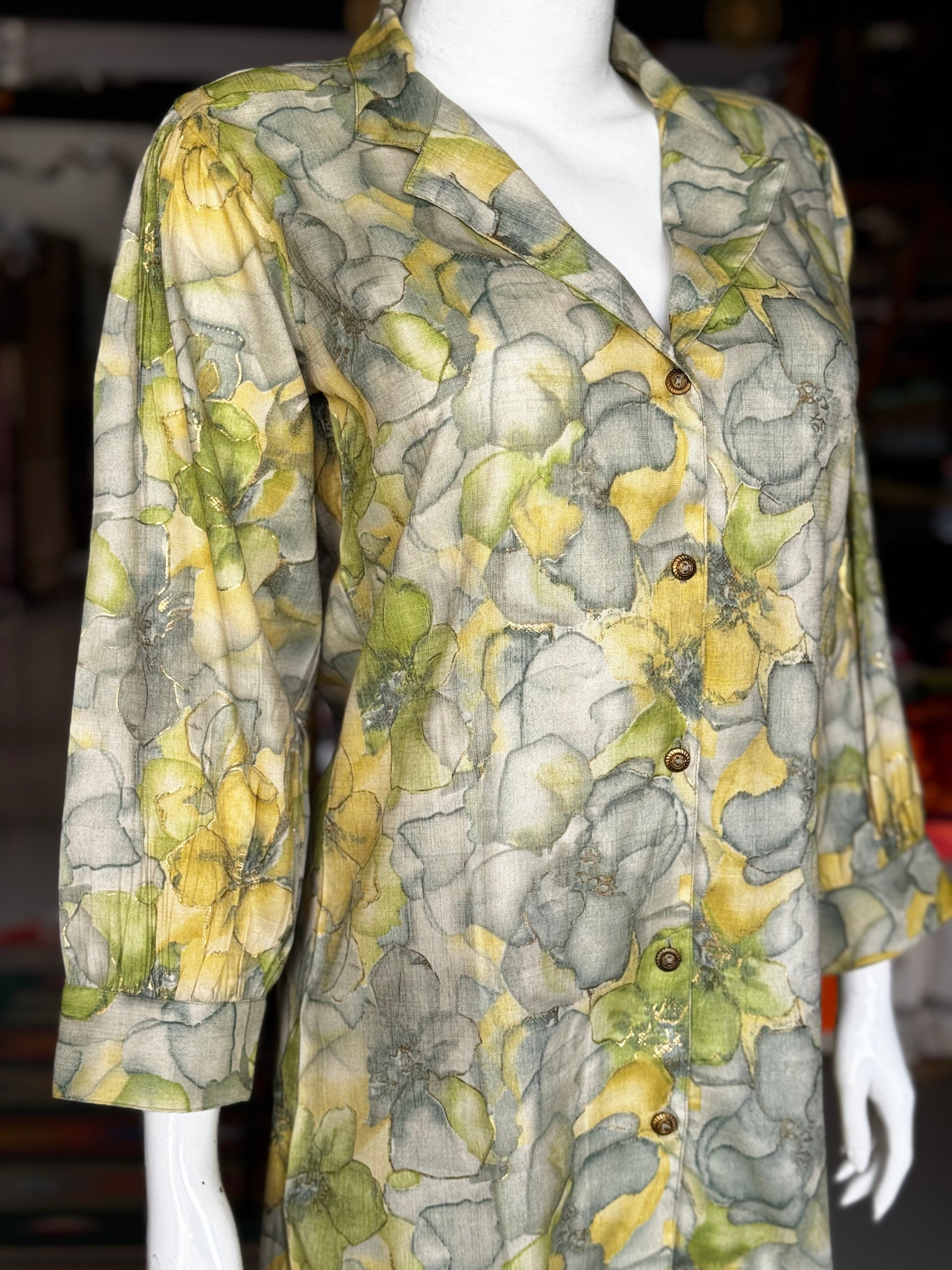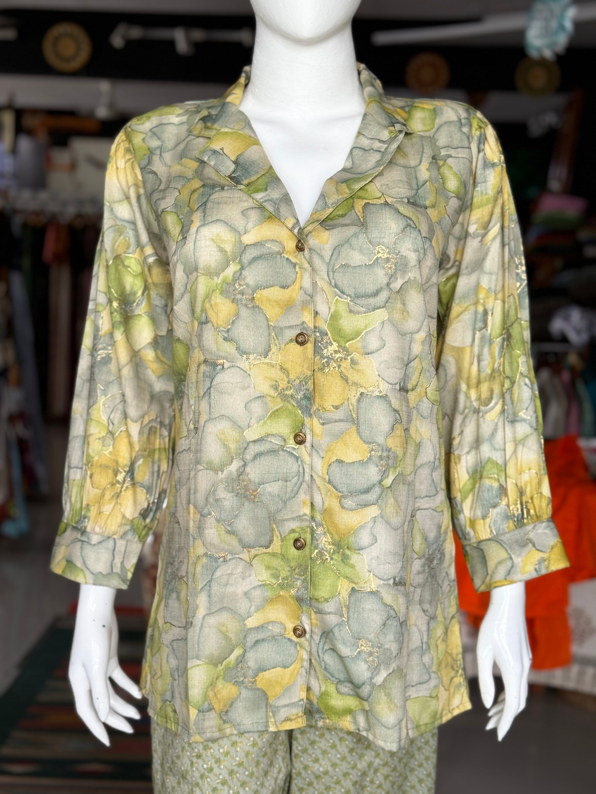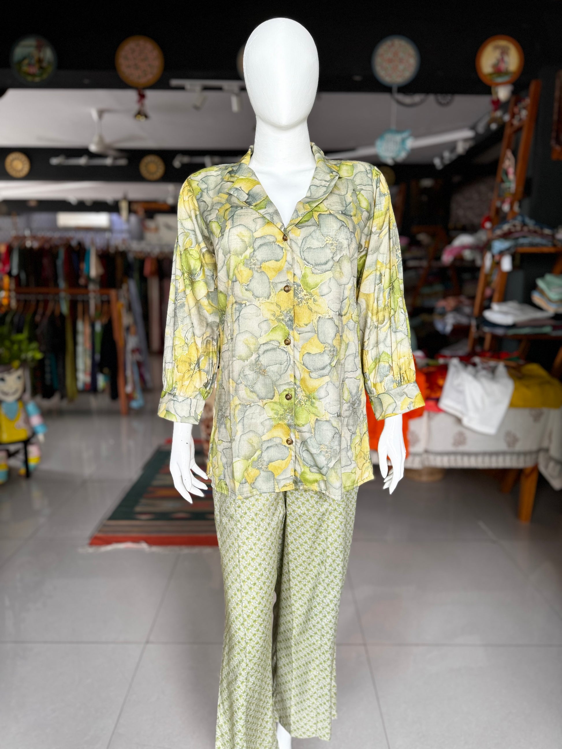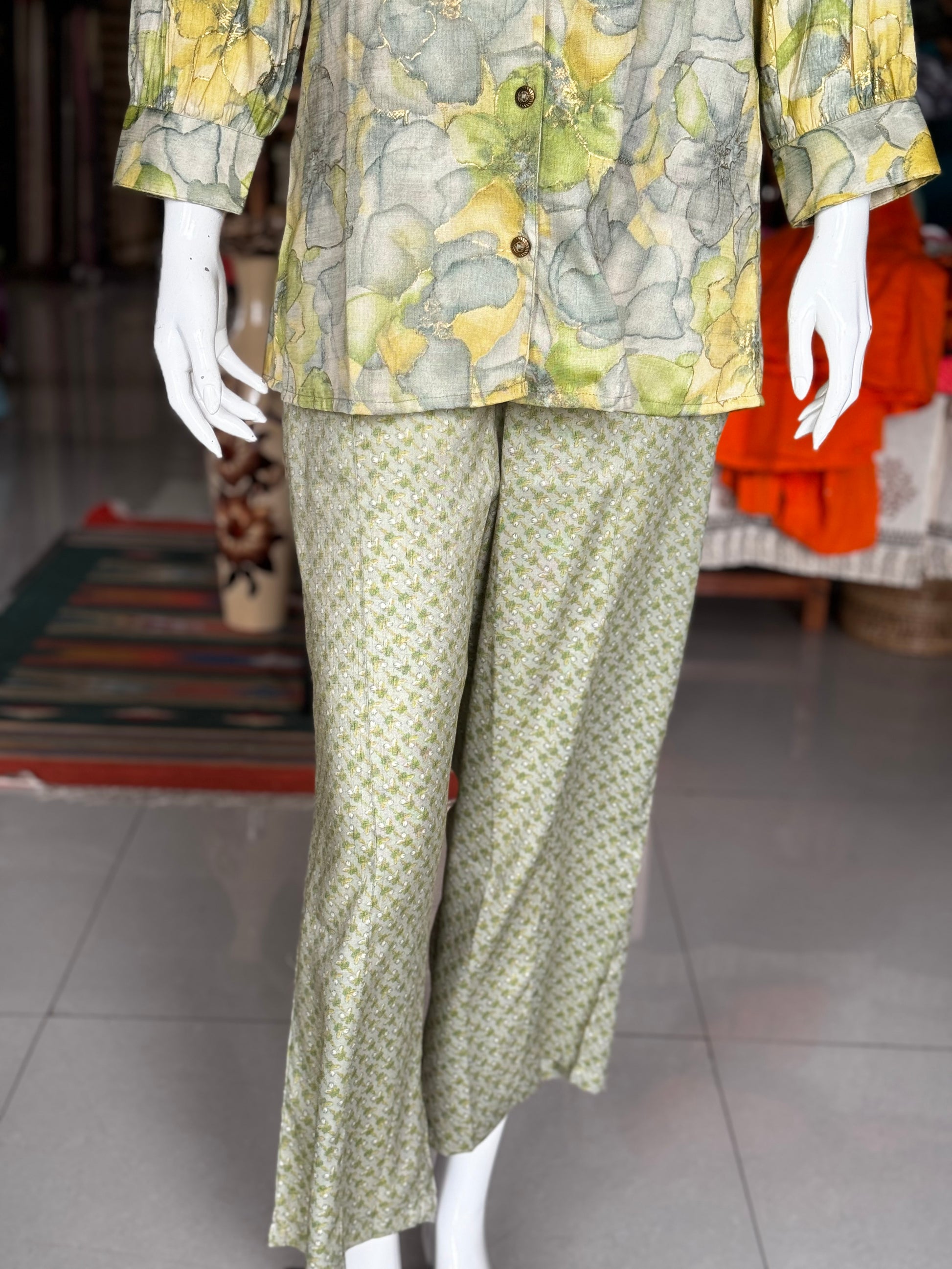 Light green floral print collared rayon cotton top with long sleeves and pants set