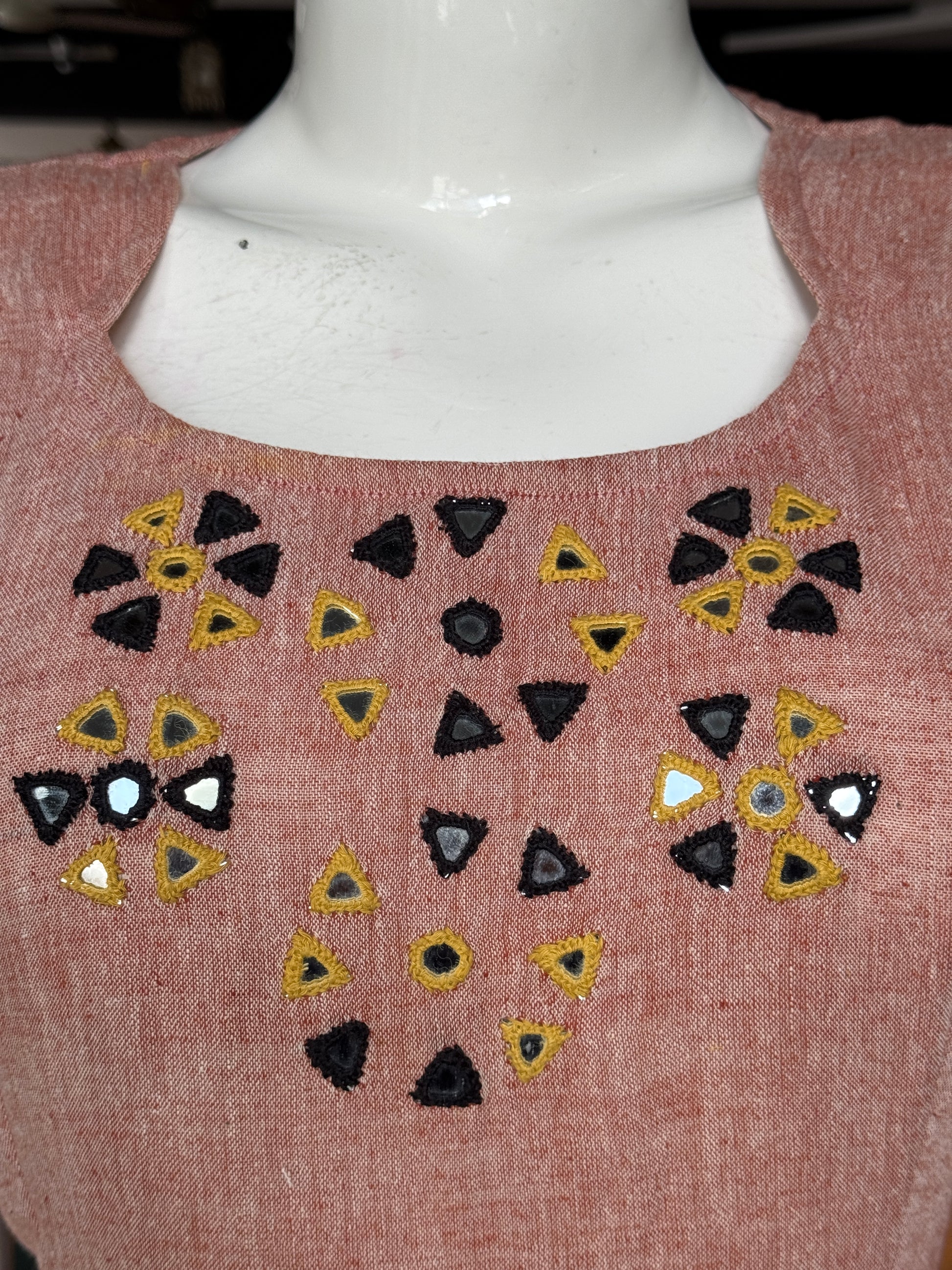Light peachish maroon kala cotton hand woven pleated dress with mirror embroidery on yoke
