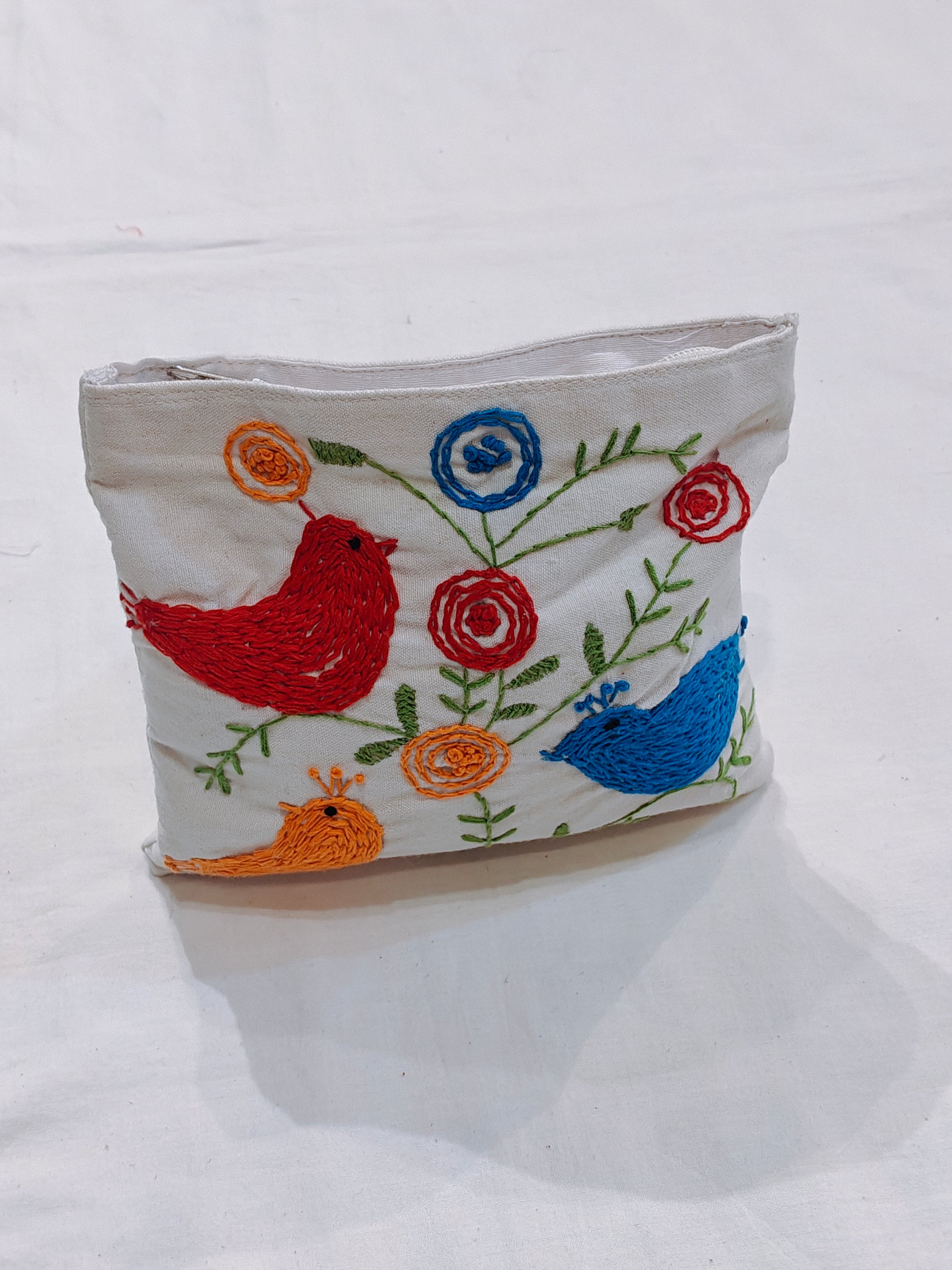 Little birdies hand embroidery on white base fabric pouch with zipper closure