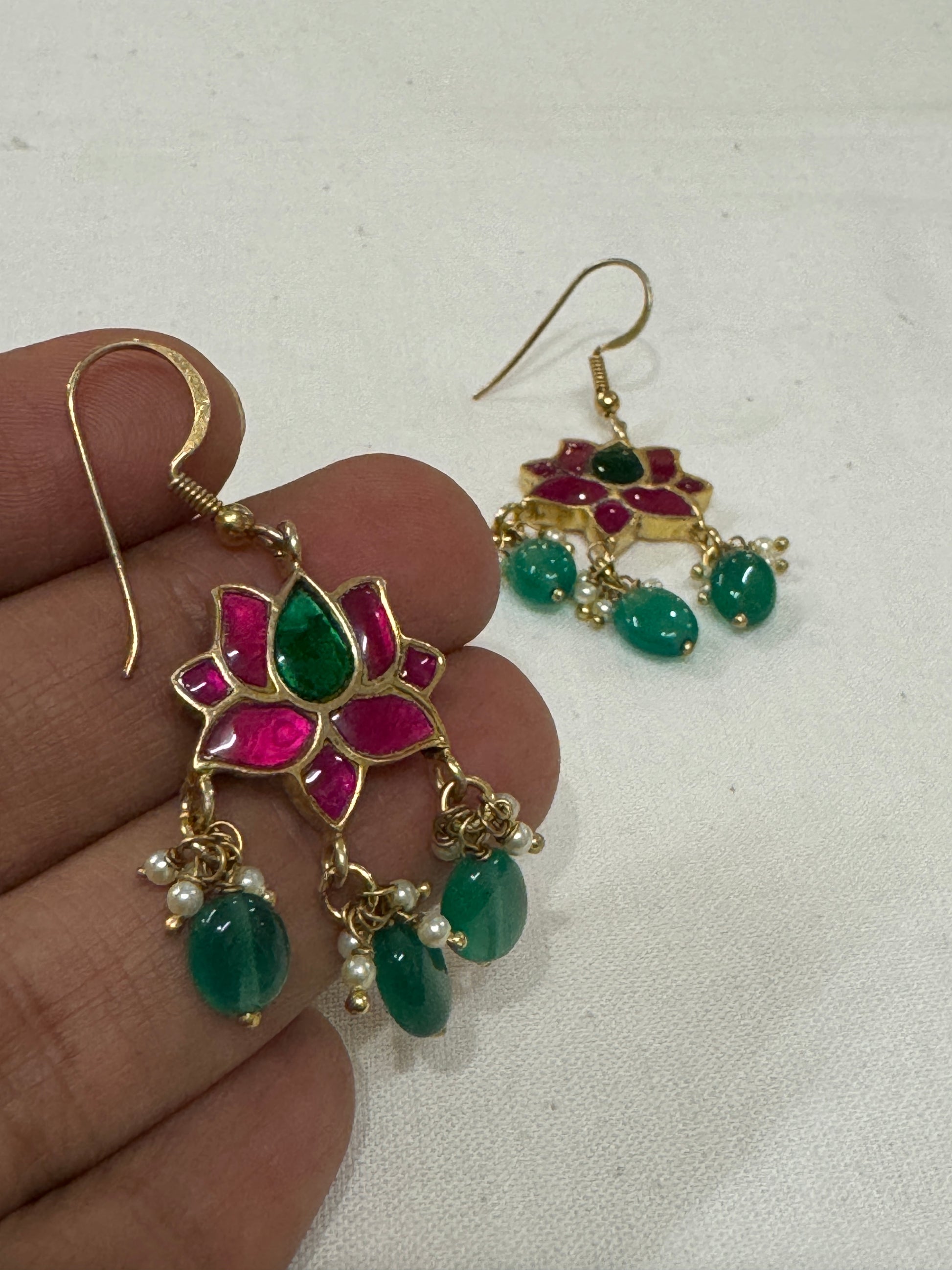 Lotus ear hooks in Pink and green stones with green stones and pearl drops - gold plated 92.5 sterling silver ear rings