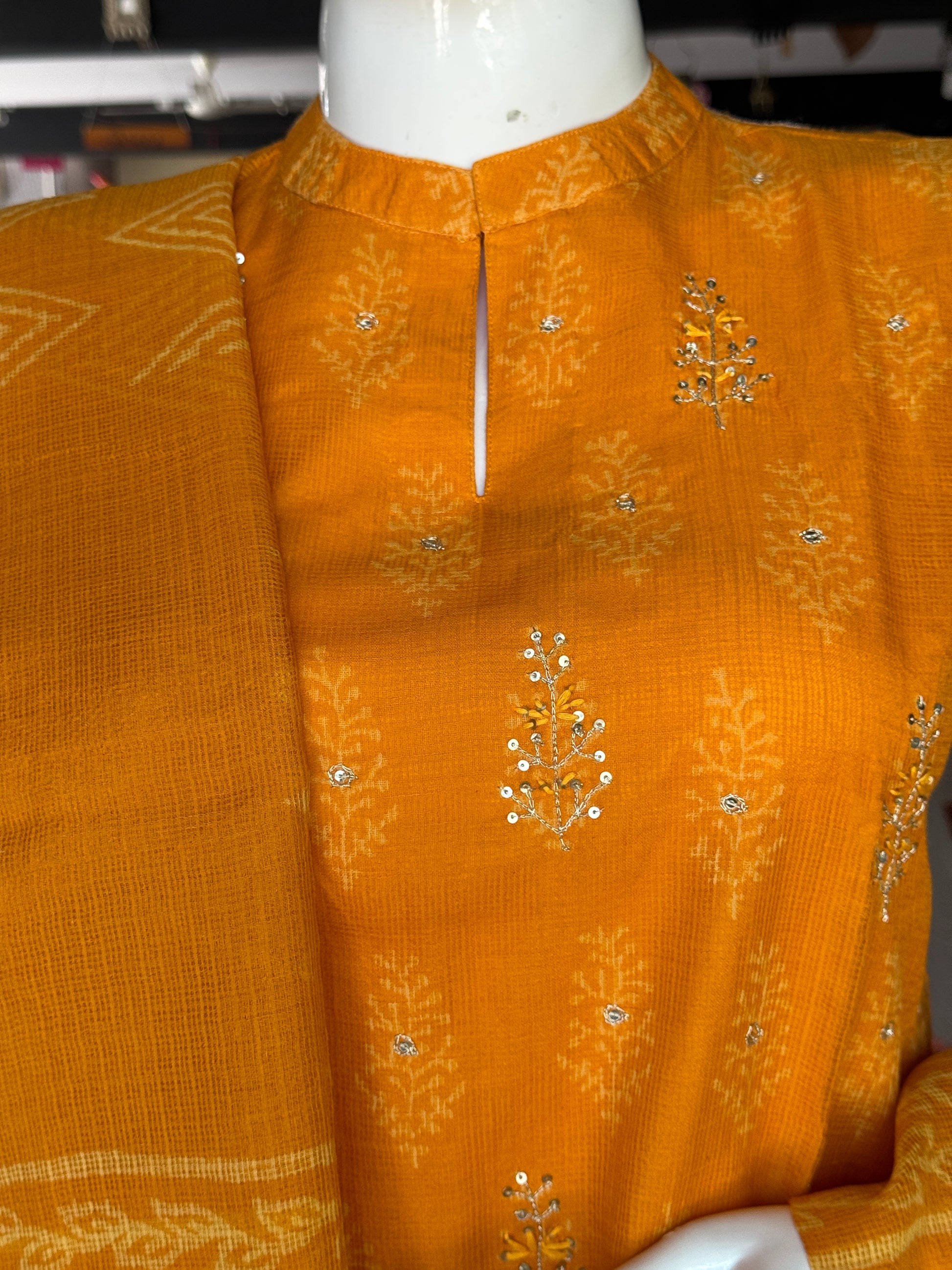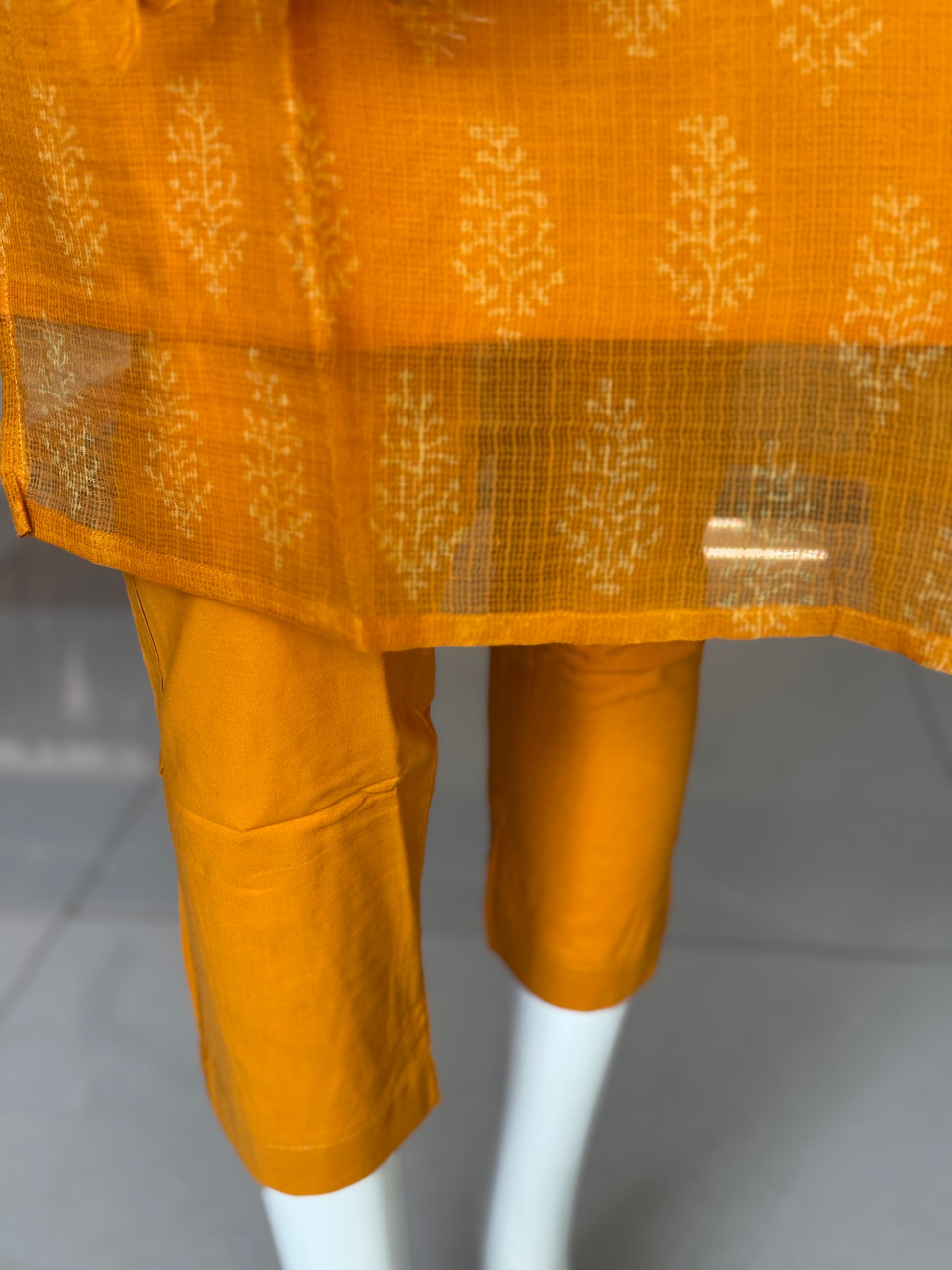 Mango yellow hand block printed kota cotton straight kurti, pants and dupatta set - with hand embroidery