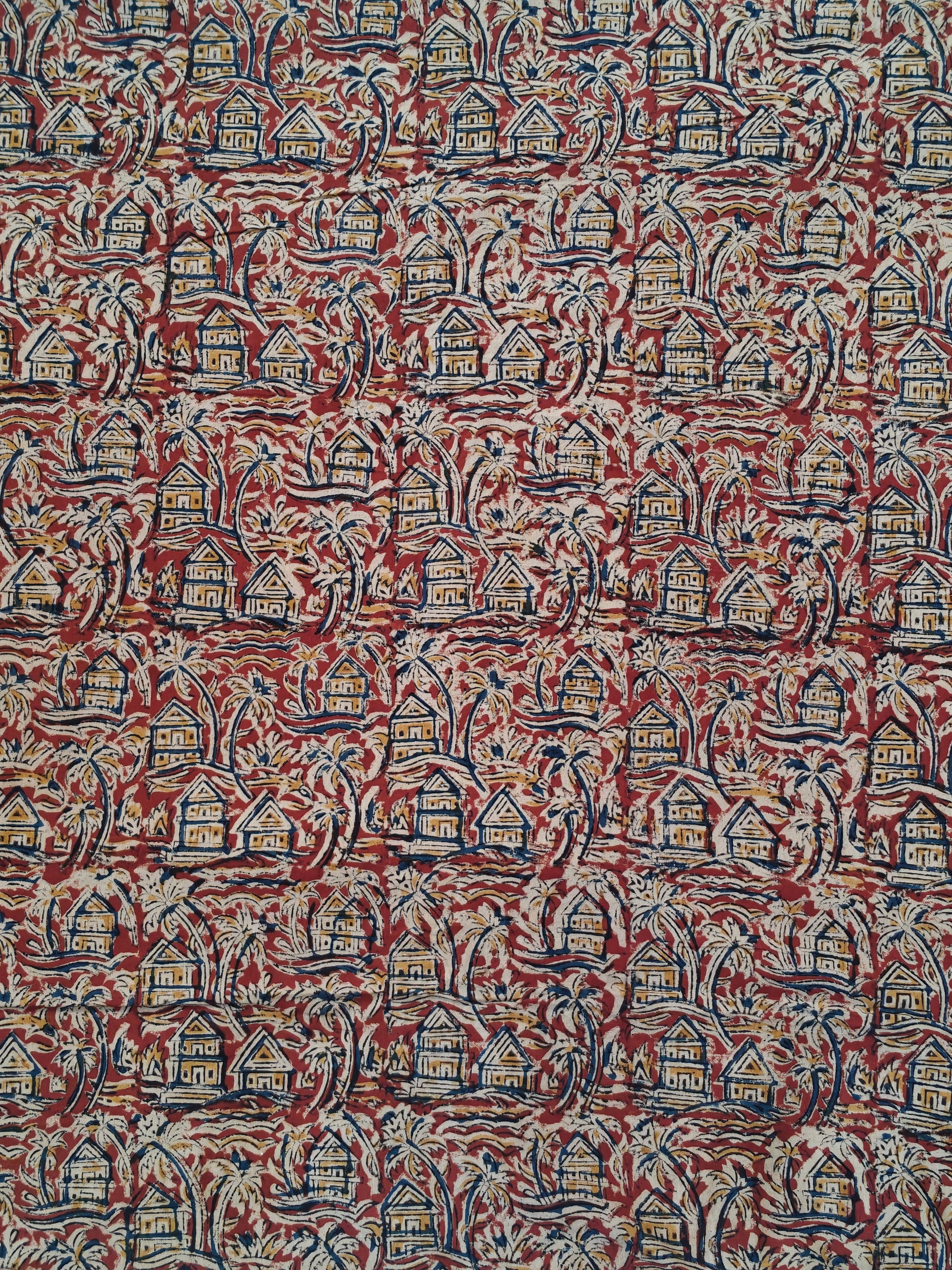Maroon houses n trees handblock printed Kalamkari cotton fabric