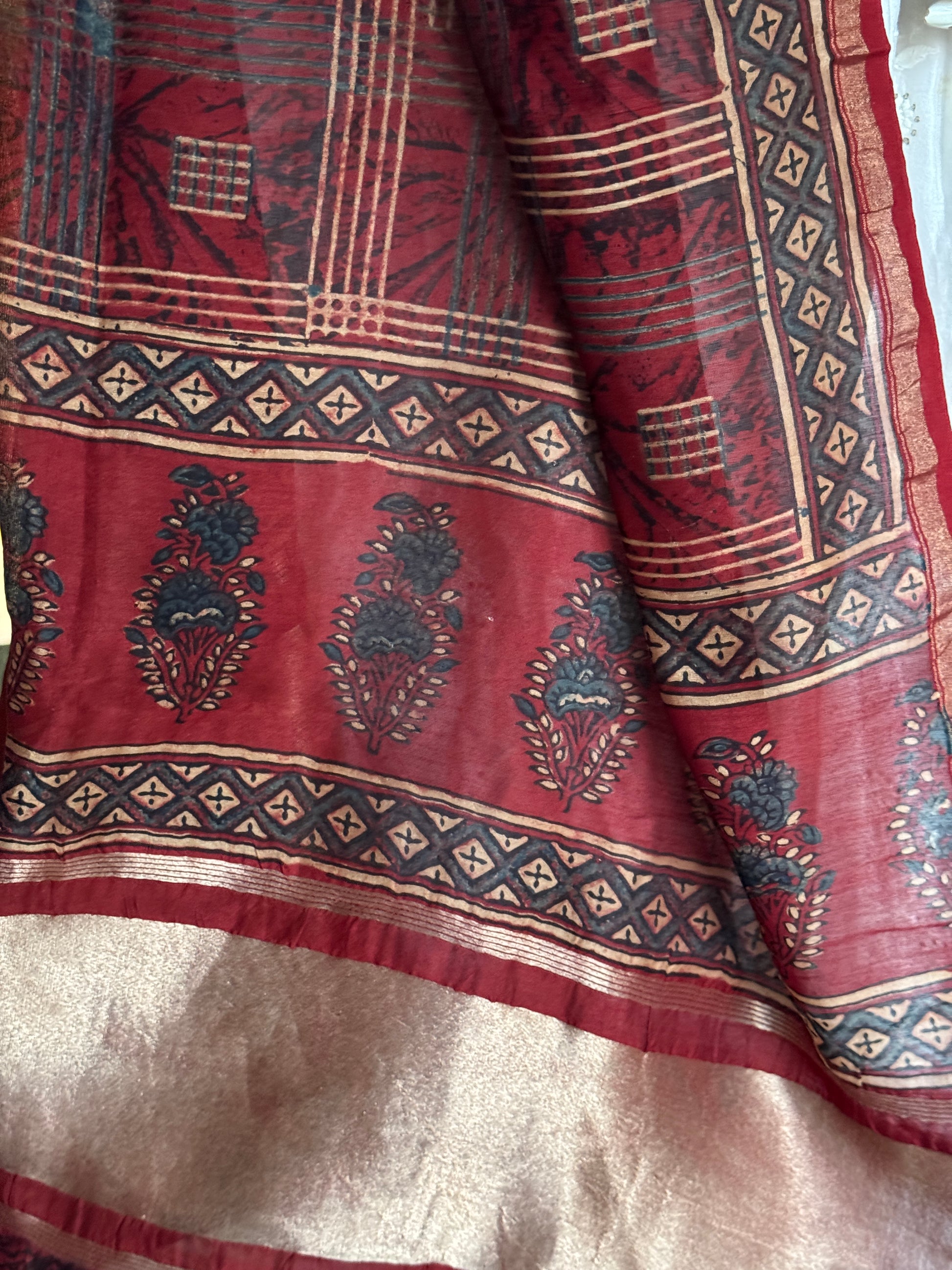 Maroon checkered Ajrakh Chanderi silk cotton dupatta with zari palla