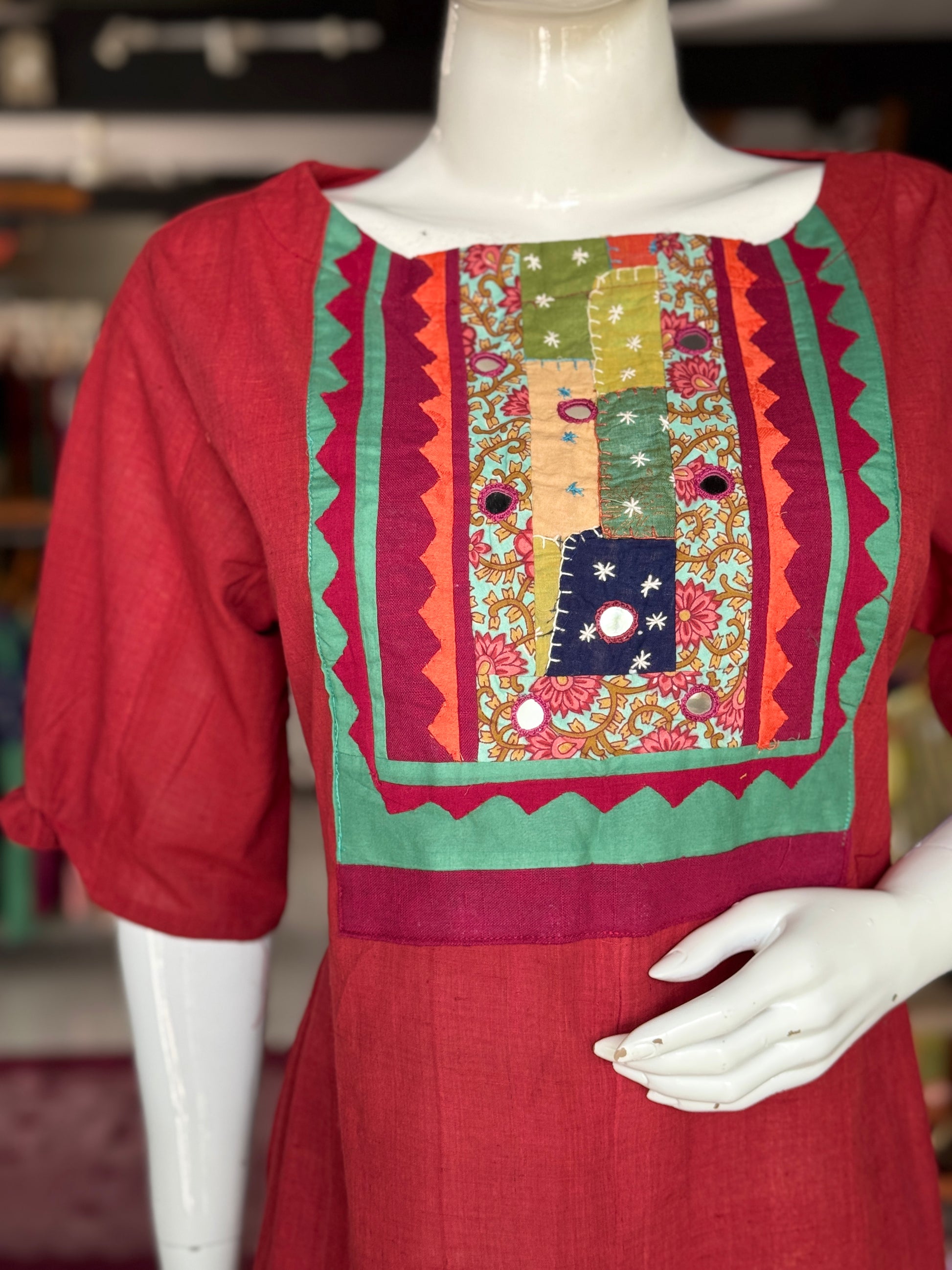 Maroon handwoven cotton A-line dress / kurti with hand embroidered appliq neck patch