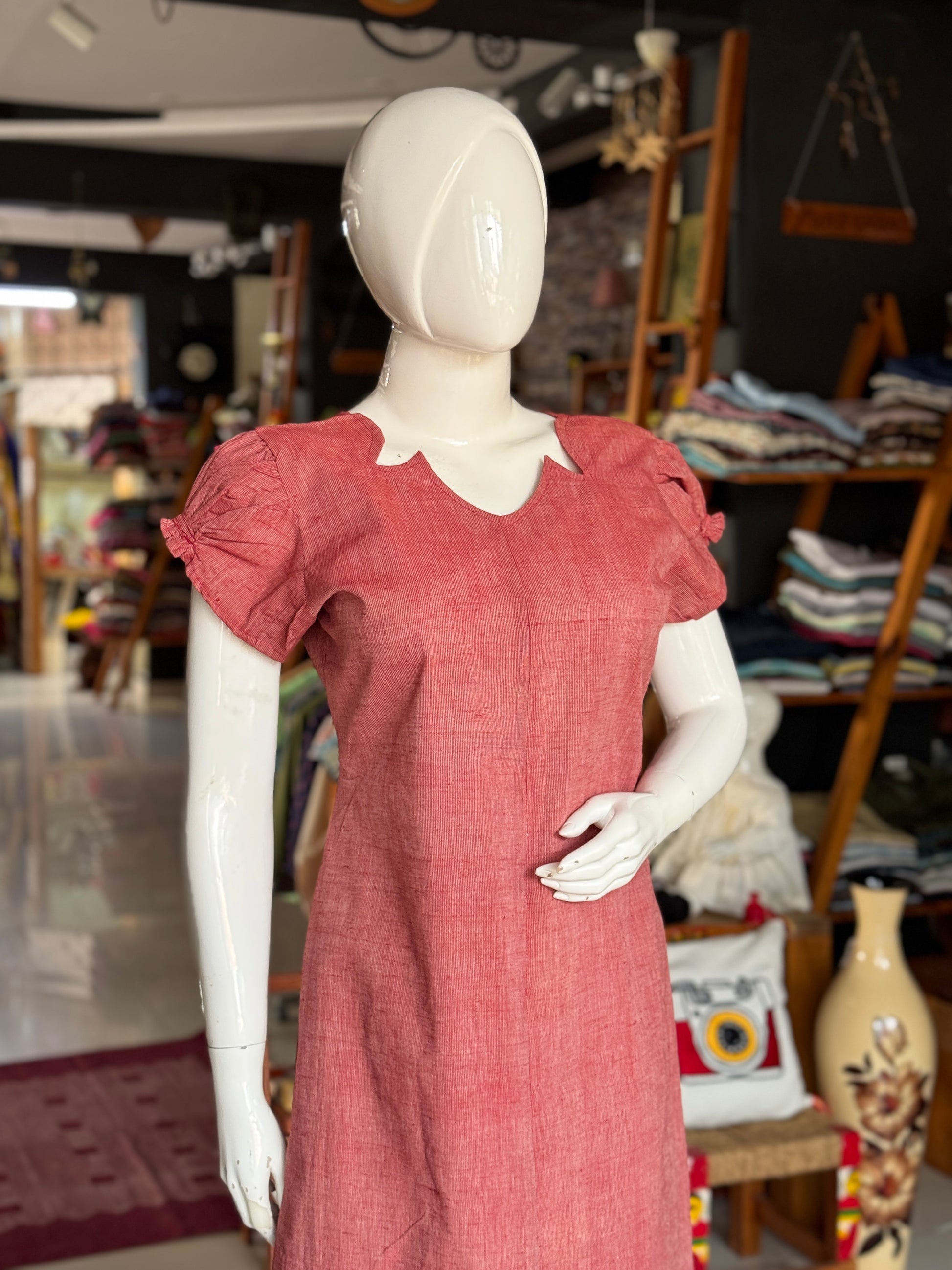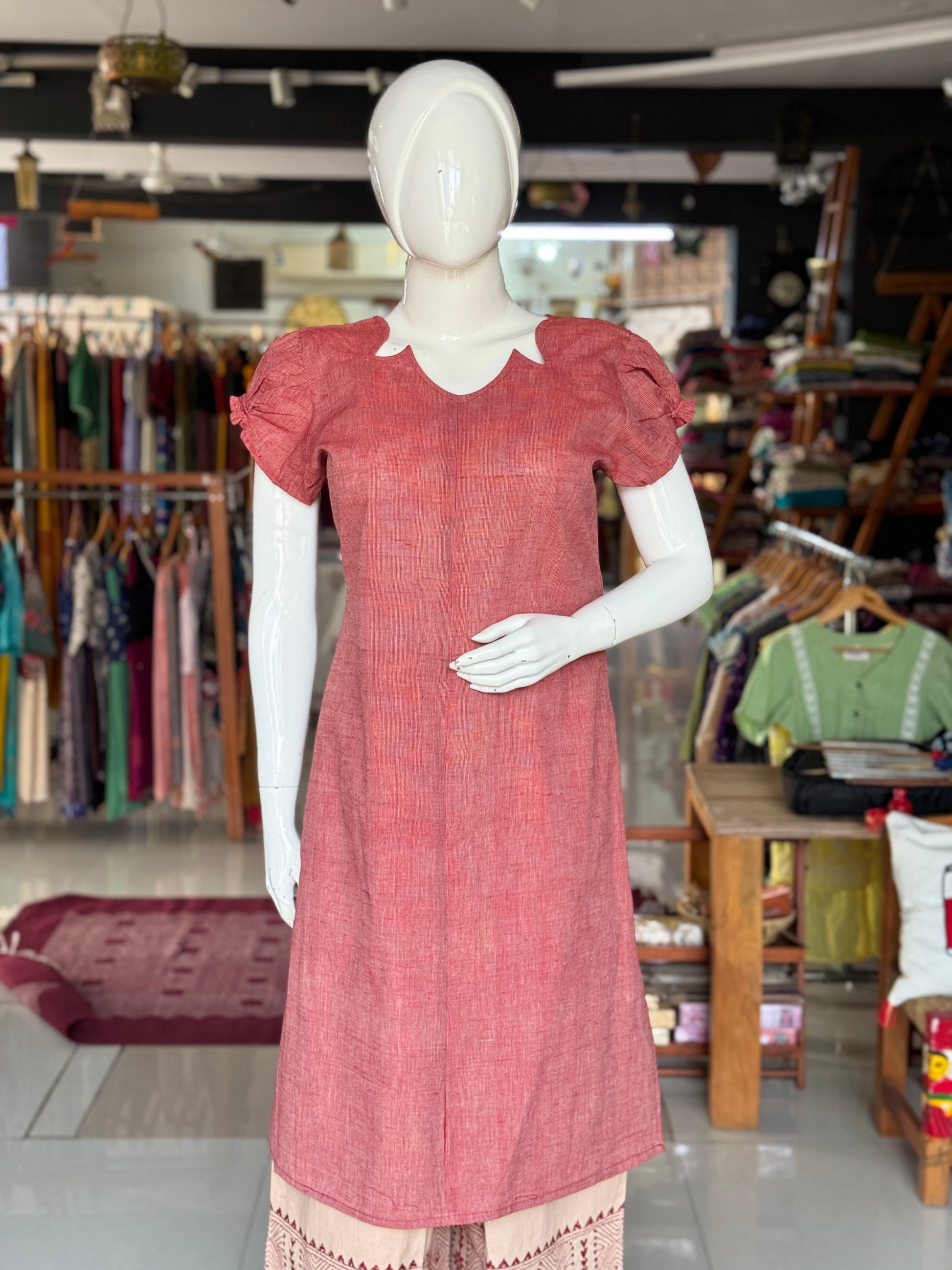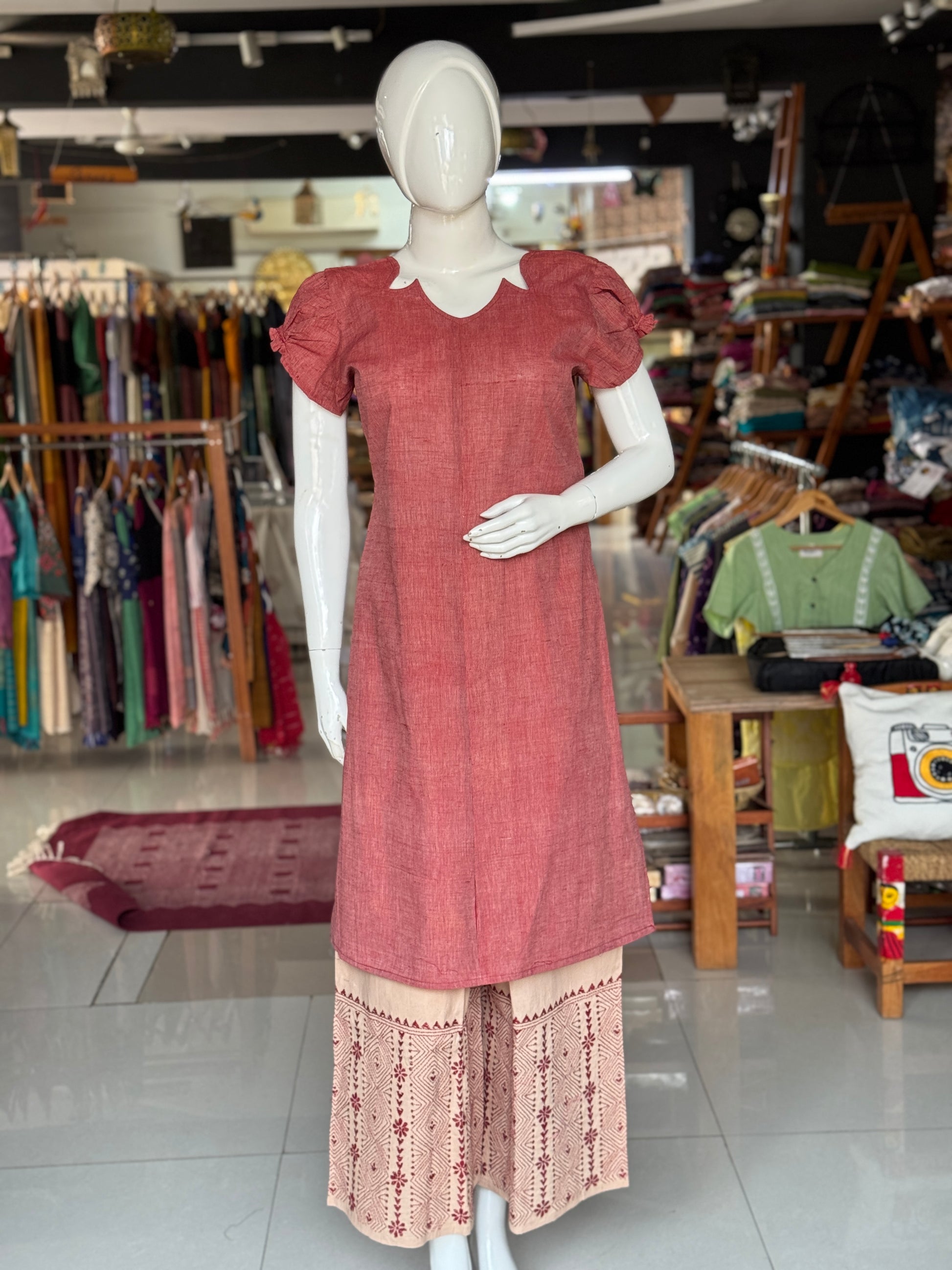 Maroon stripes handwoven cotton straight kurti with fancy neckline and sleeves