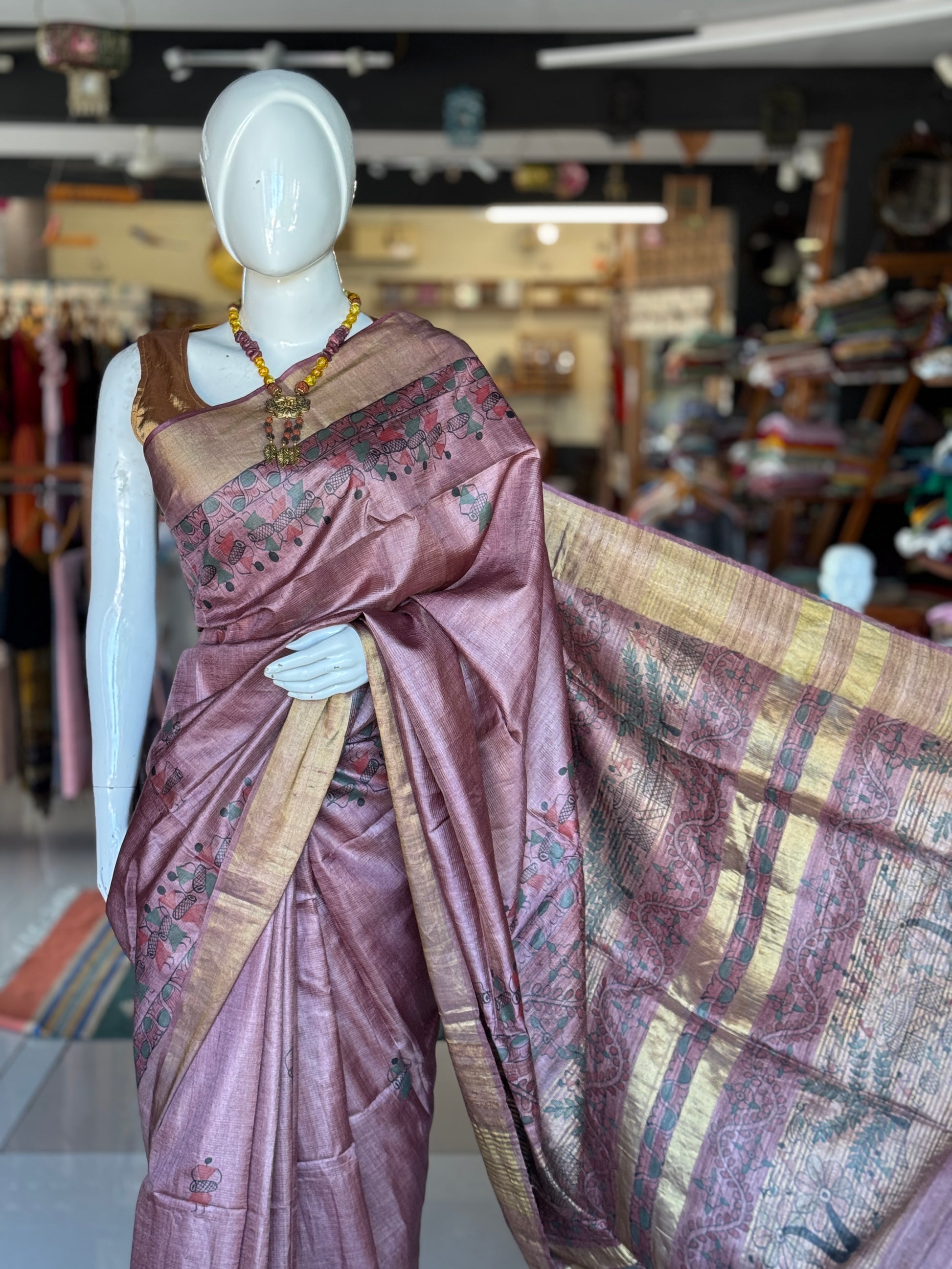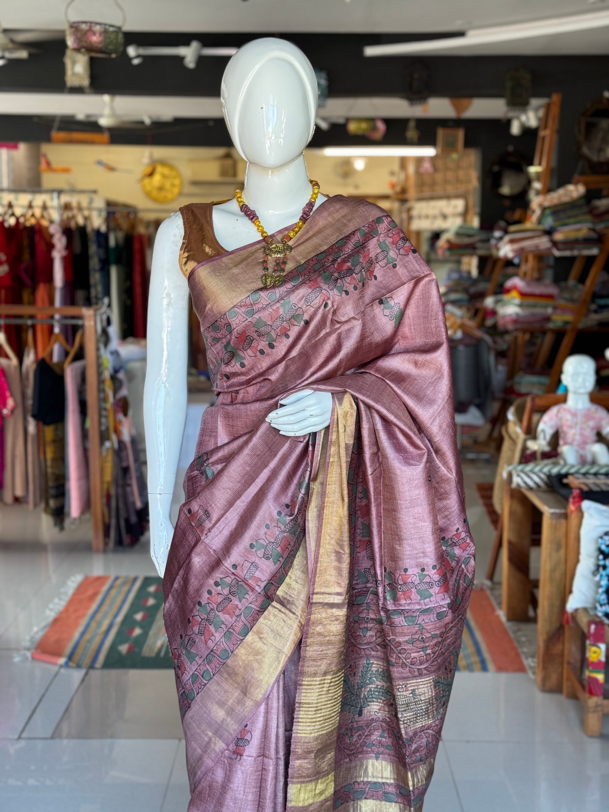 Mauve tone tussar silk hand woven, Warli hand painted saree