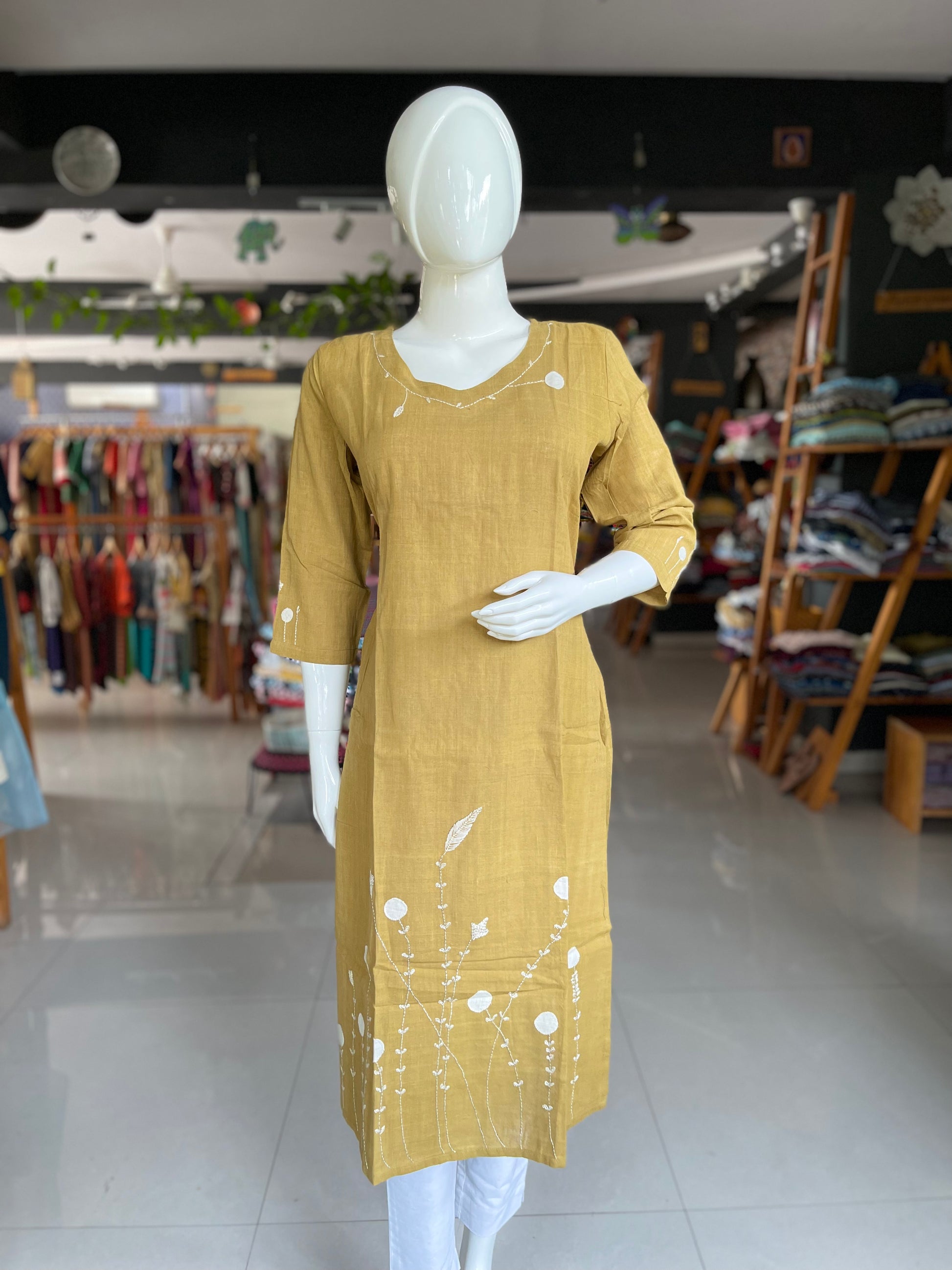 Mehendi green organic handloom cotton kurti with hand embroidery for yoke and hem