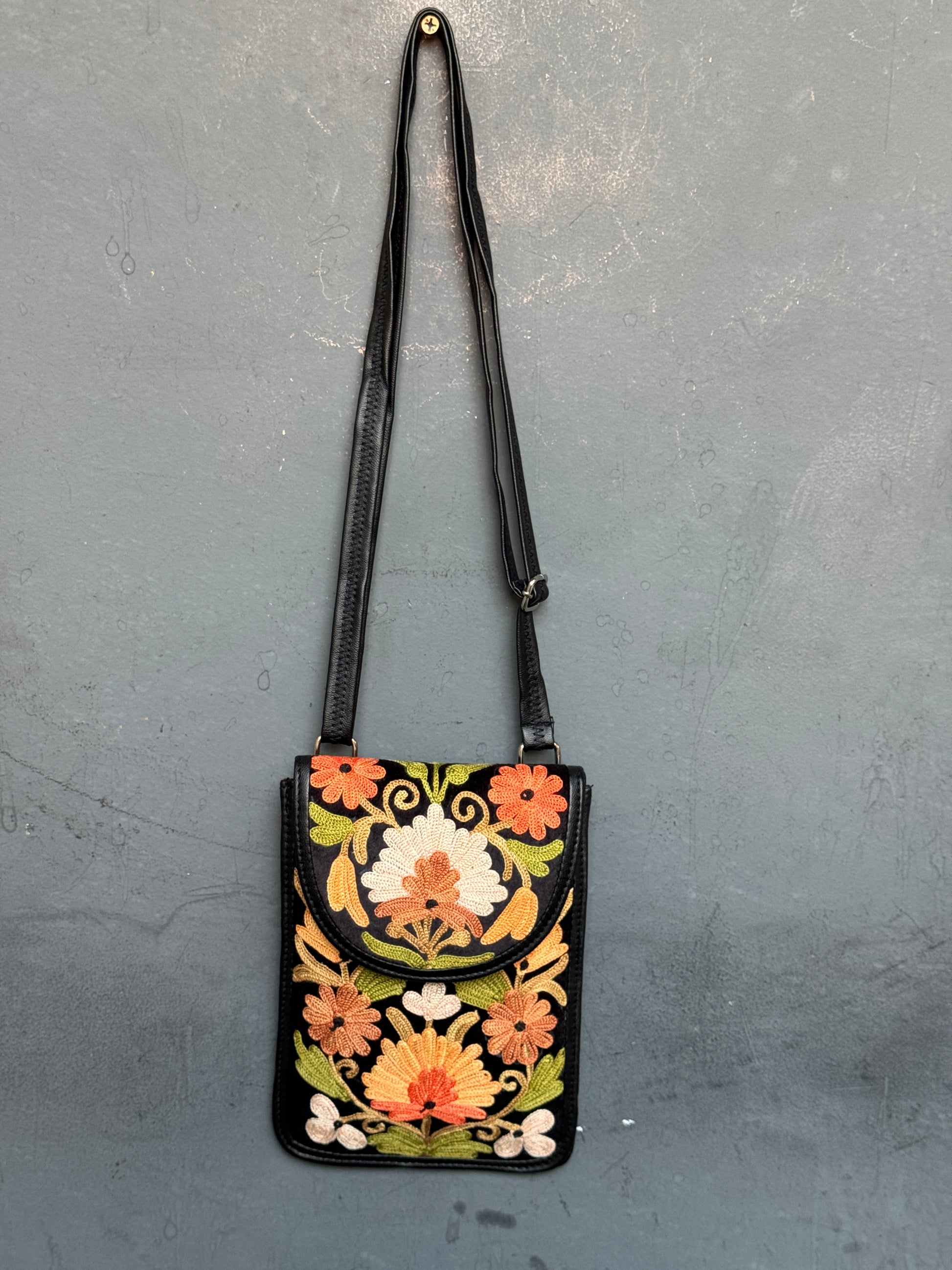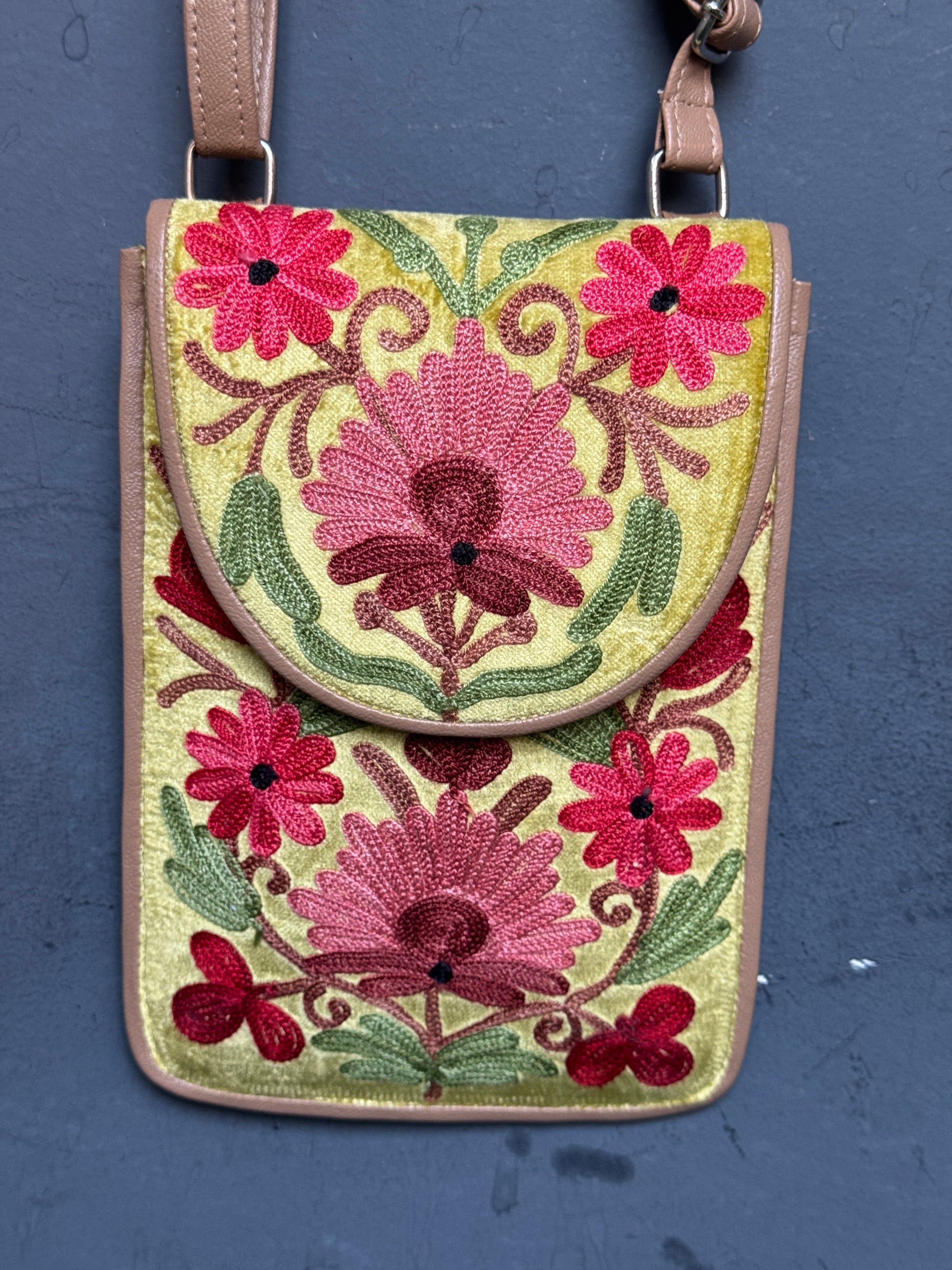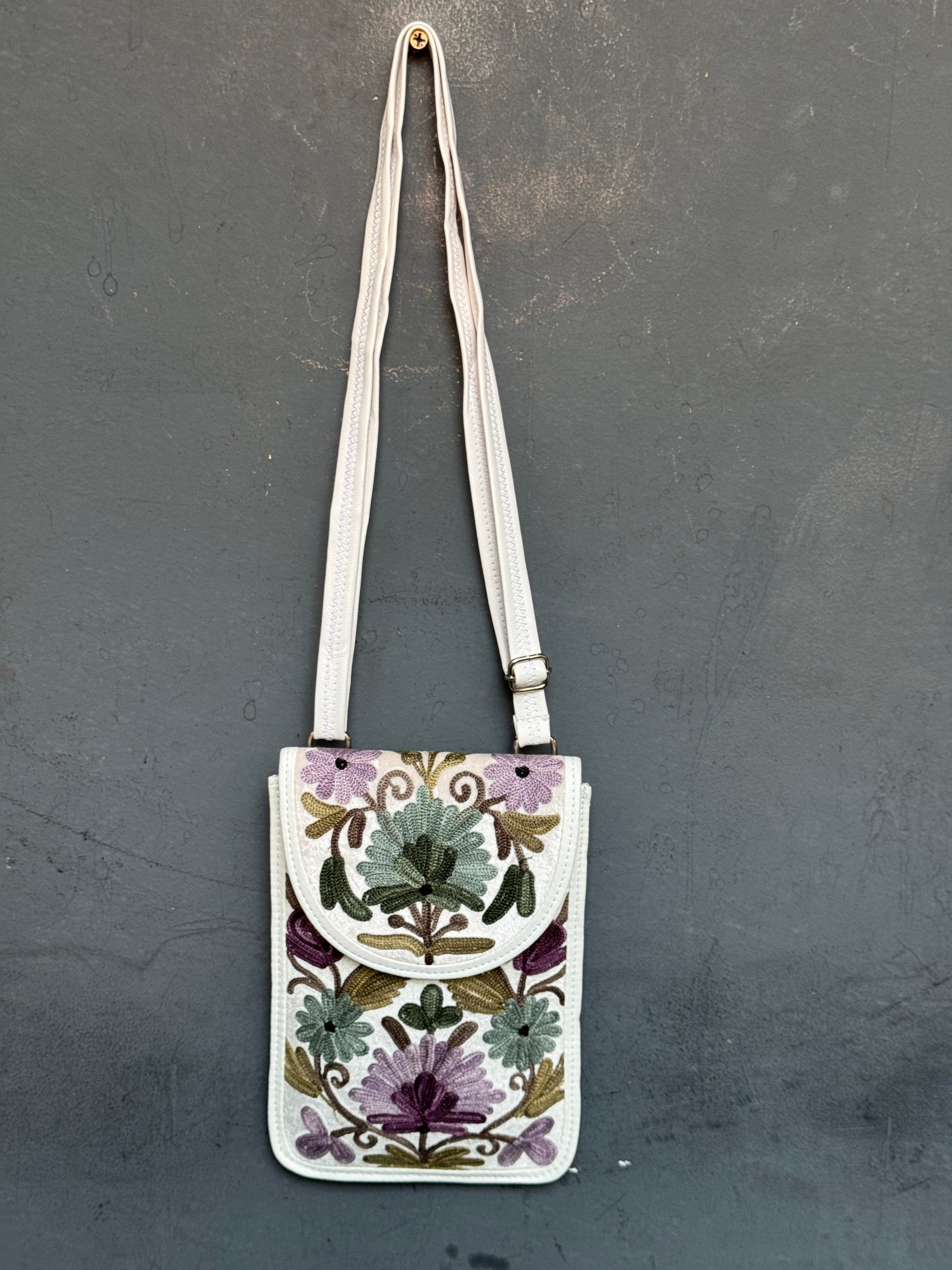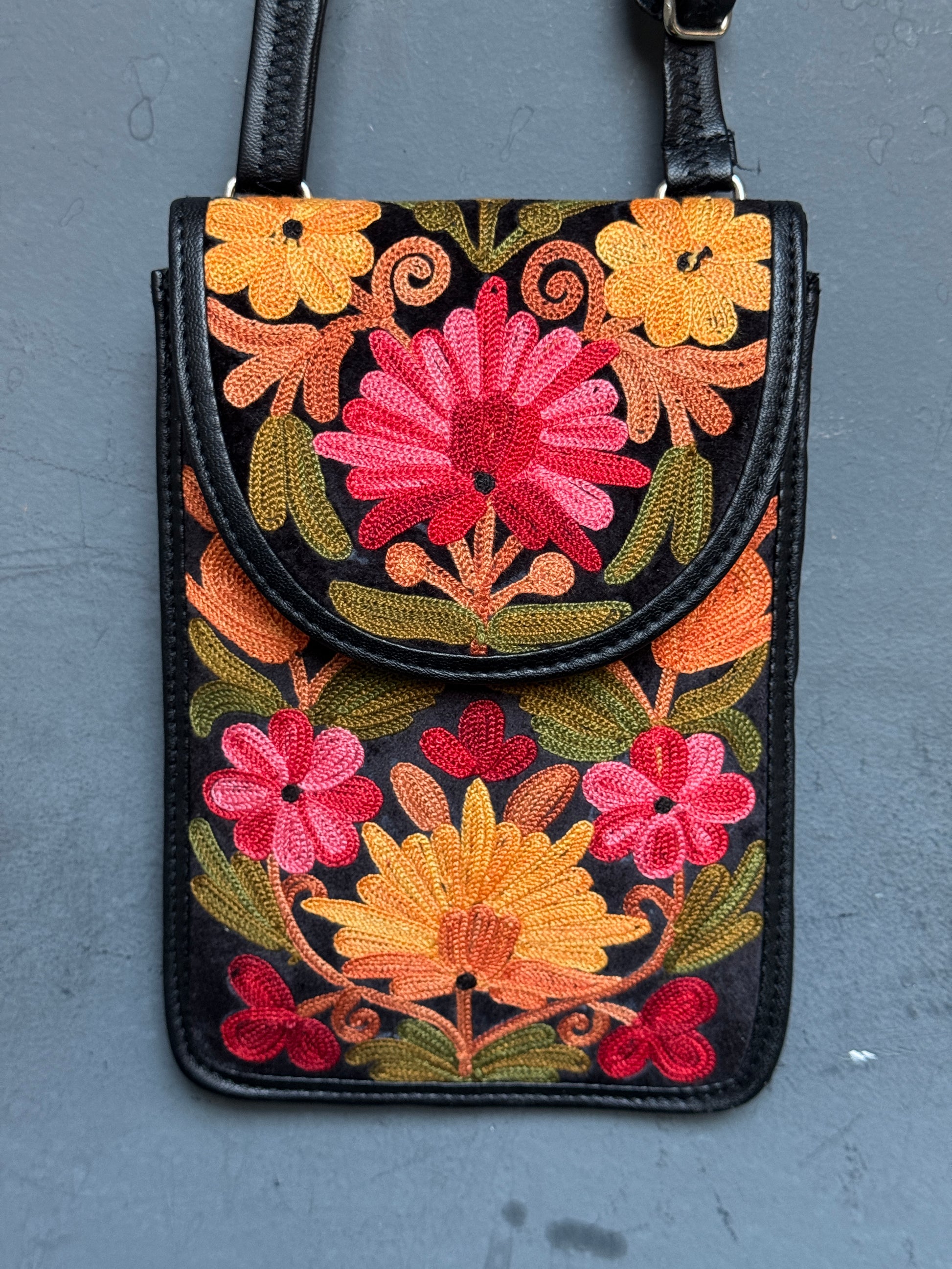 Mobile phone sling pouch - Kashmiri floral Aari embroidered with adjustable length strap and zippered back pocket - colors available
