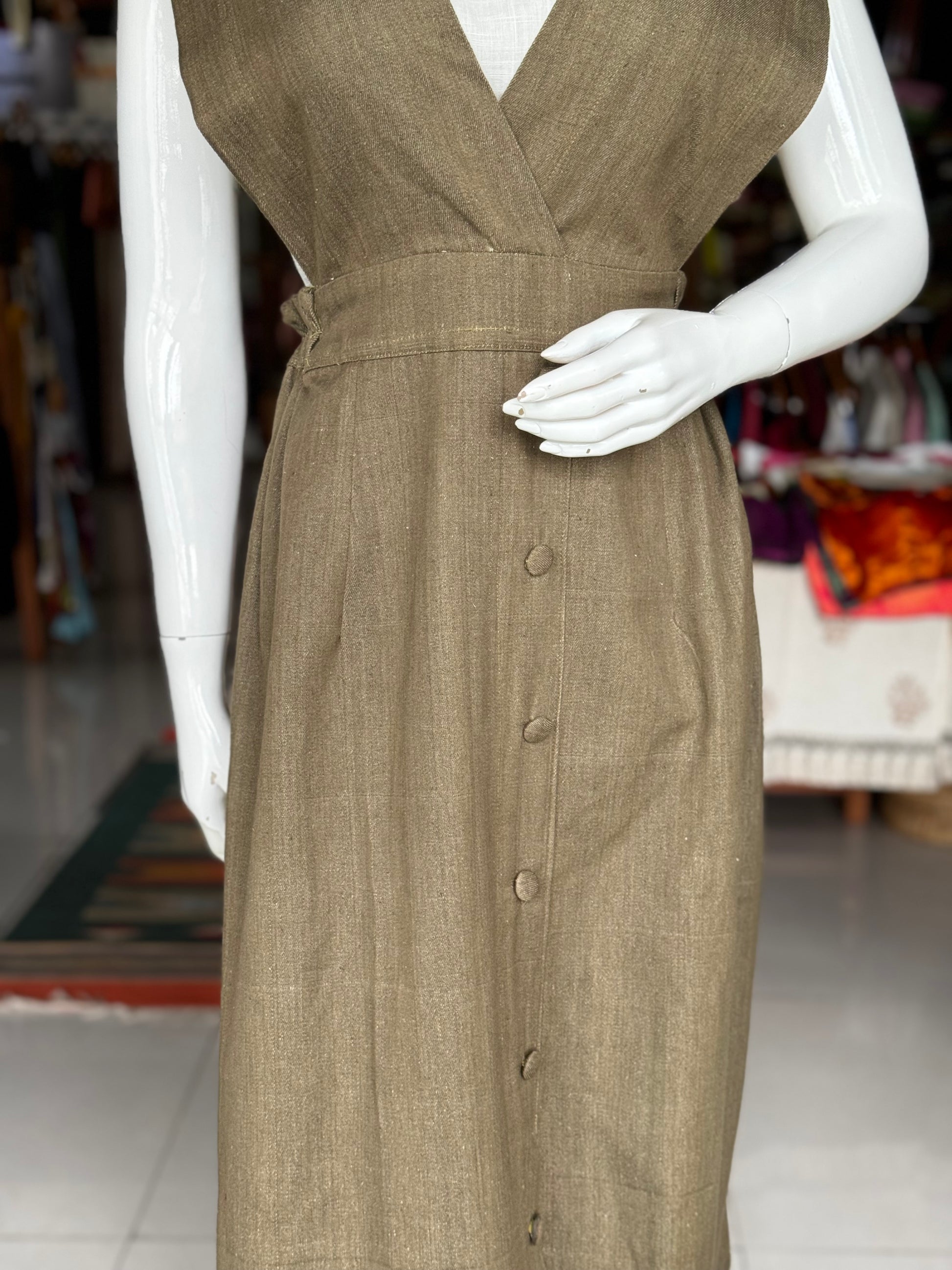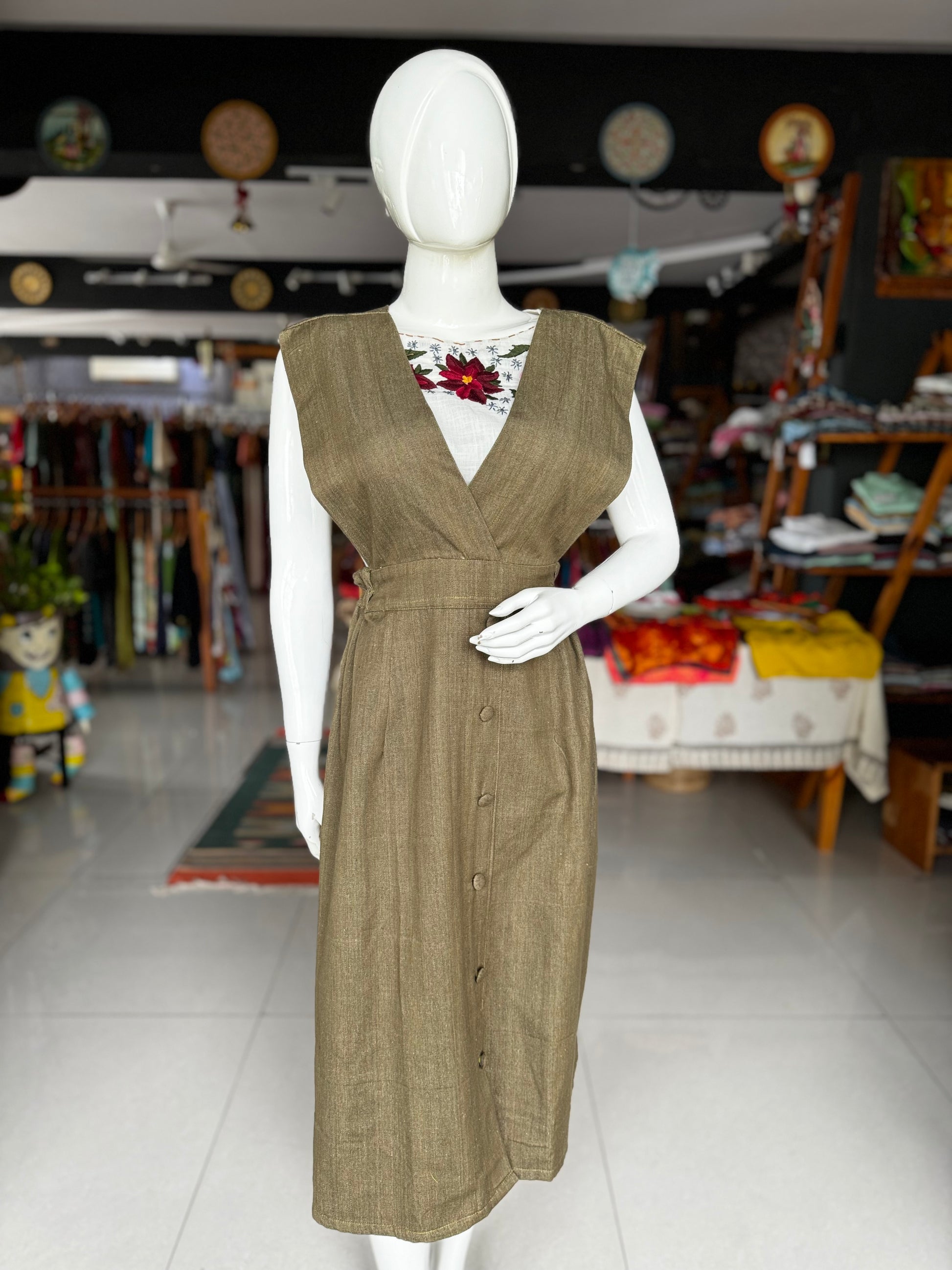 Mehendi green Denim pinafore dress in handloom natural dyed cotton