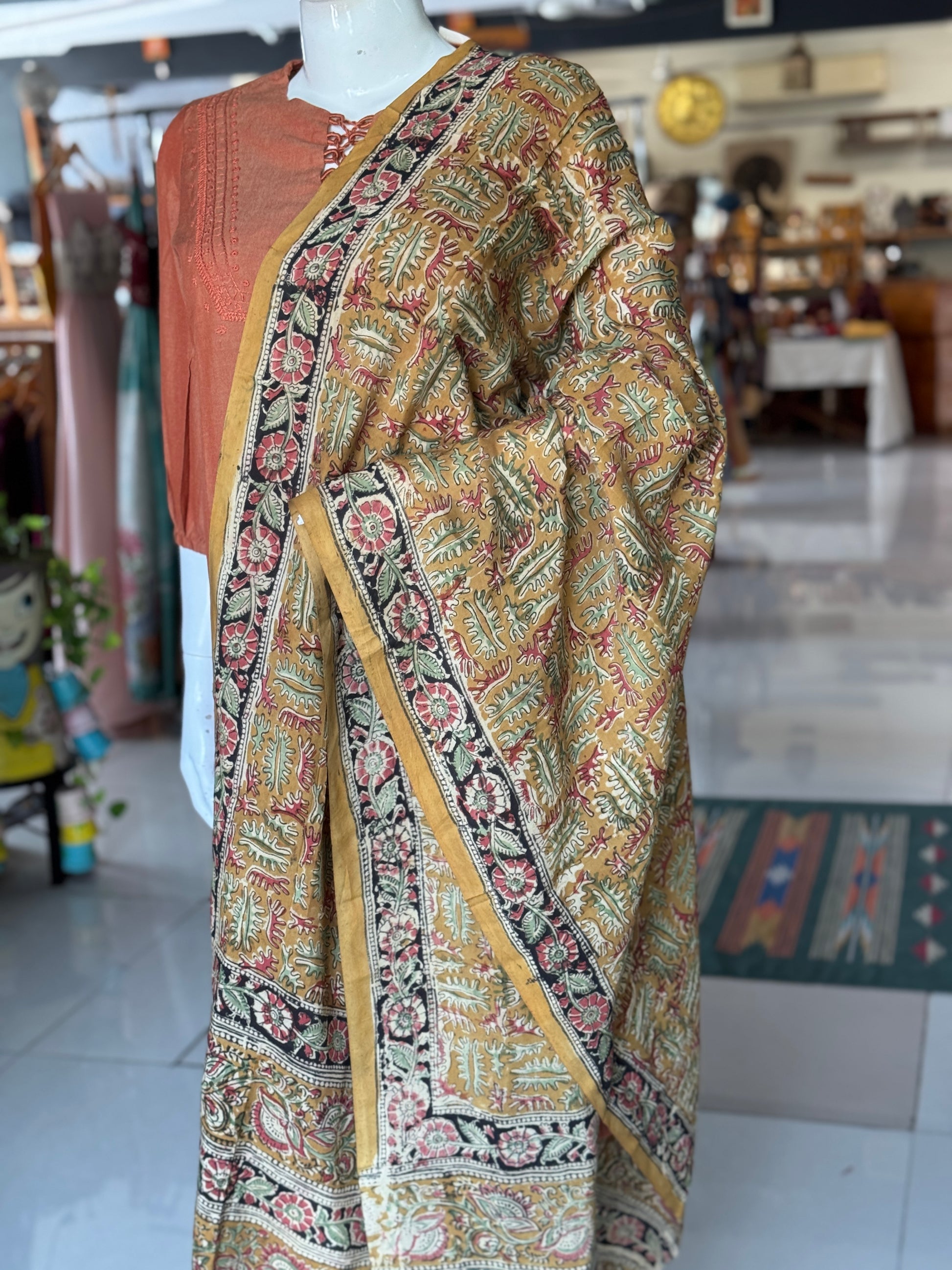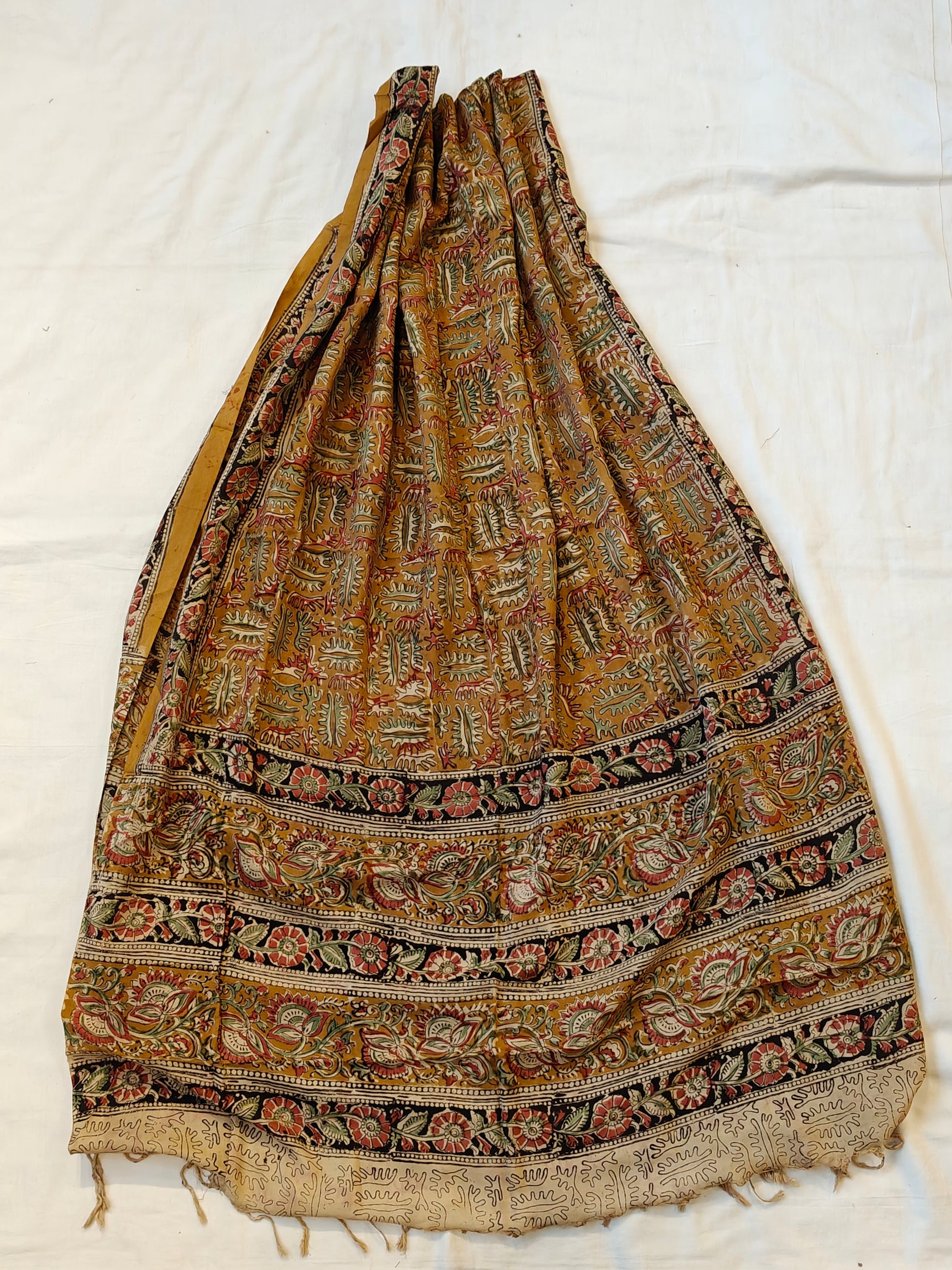 Mustard with leaves design Kalamkari handpainted on silk dupatta