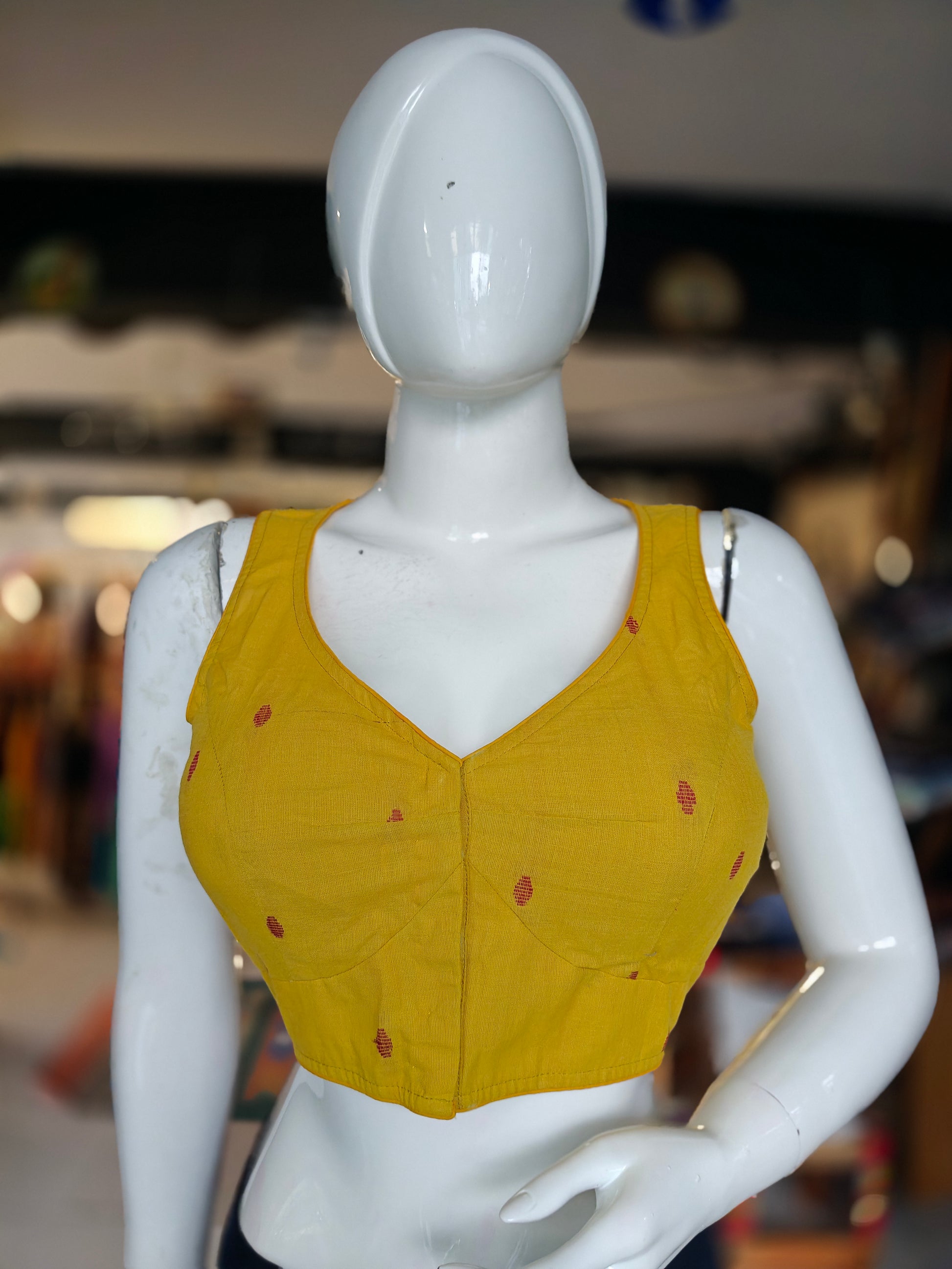 Mustard yellow dot prints front open sleeveless blouse with pads