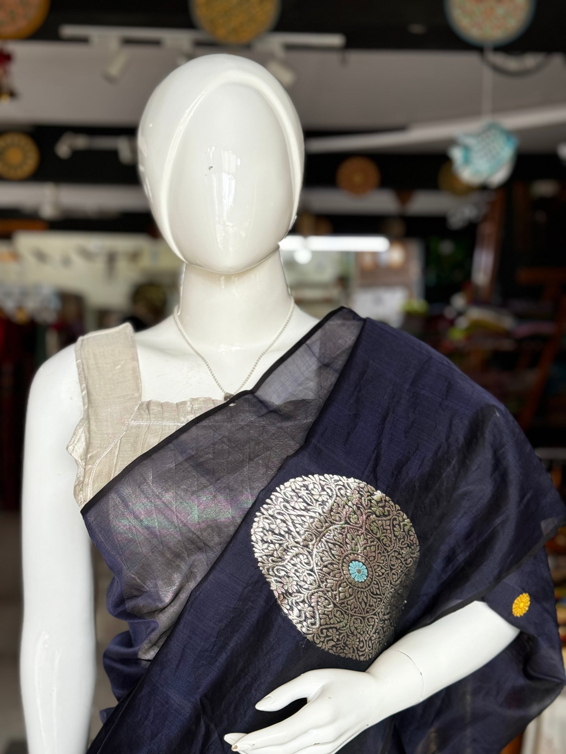 Navy blue Chanderi katan silk handwoven saree with big silver ball butis and colourful round butis