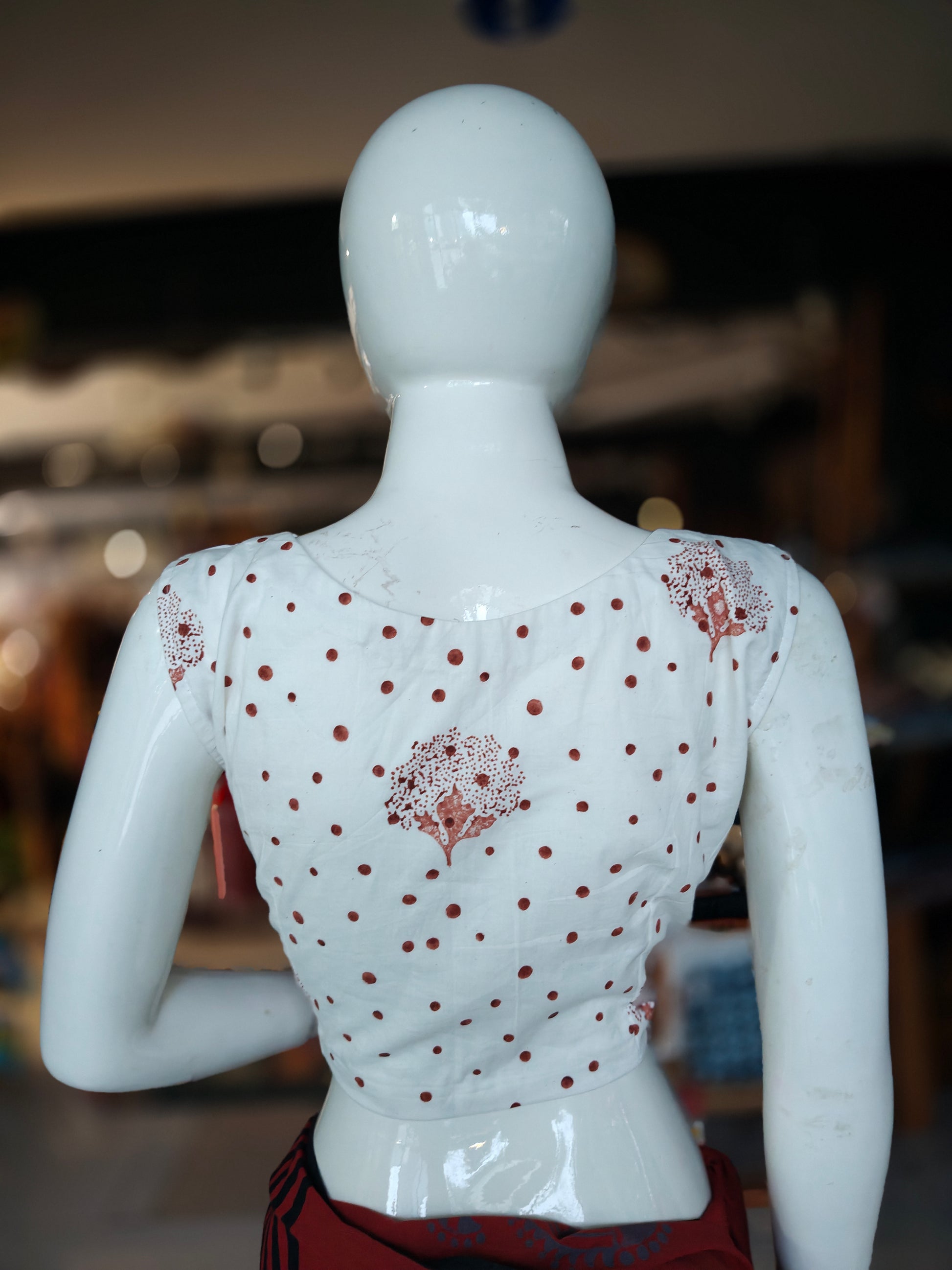 Off-white and brown polka dots hand block printed cotton sleeveless front open blouse
