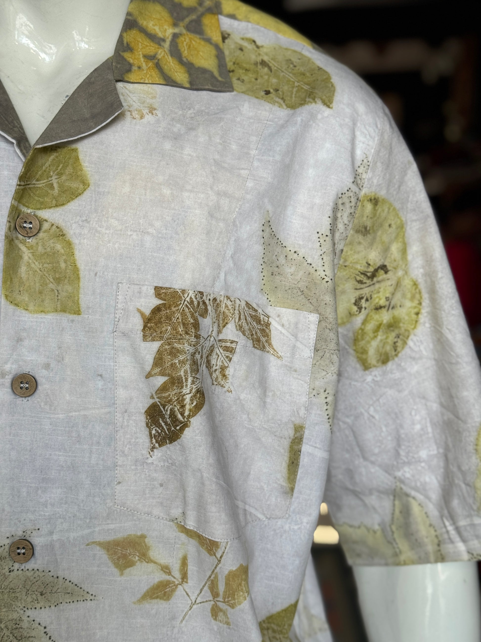 Off white eco friendly leaf printed cotton half sleeves loose fit shirt for men