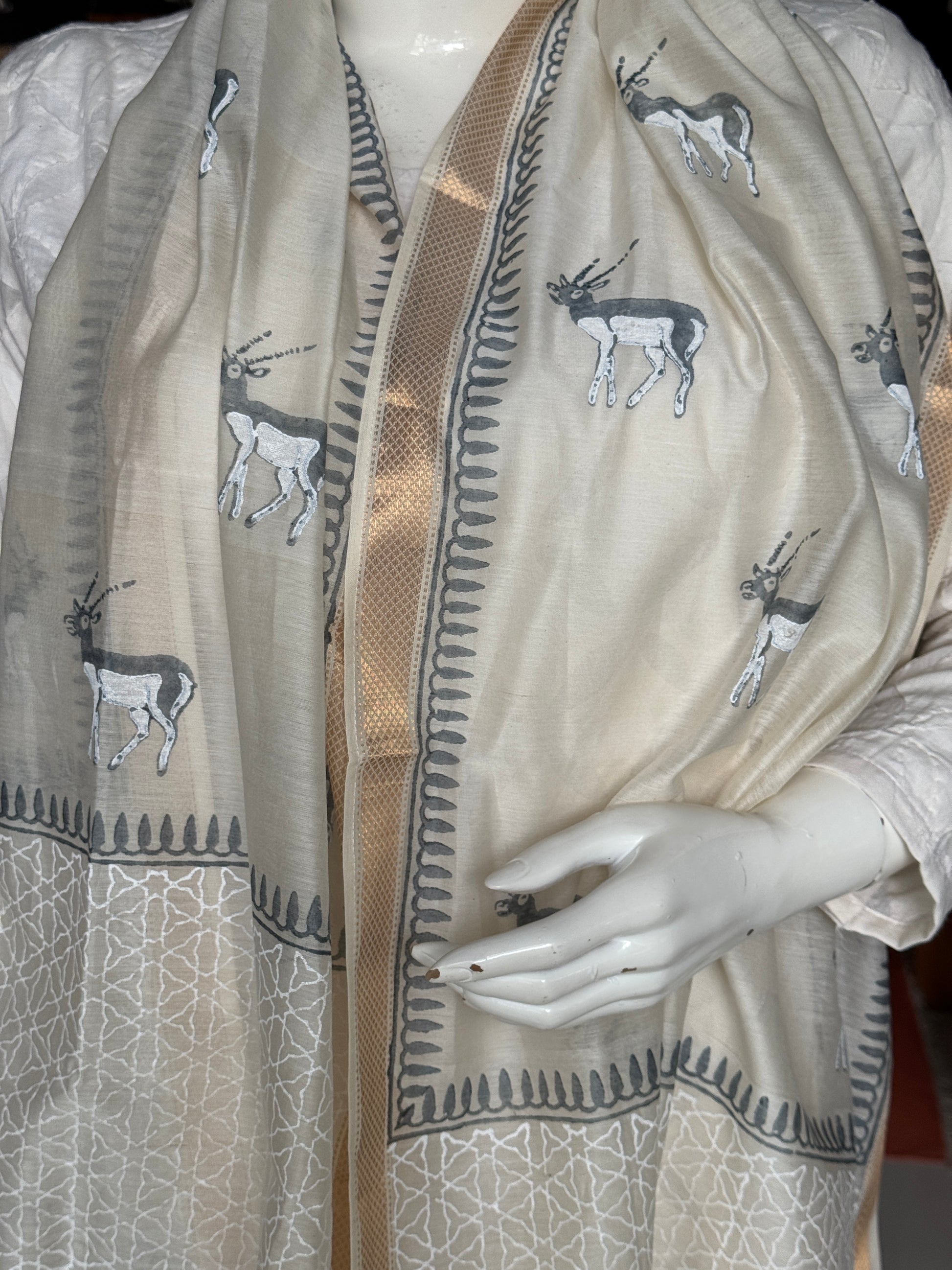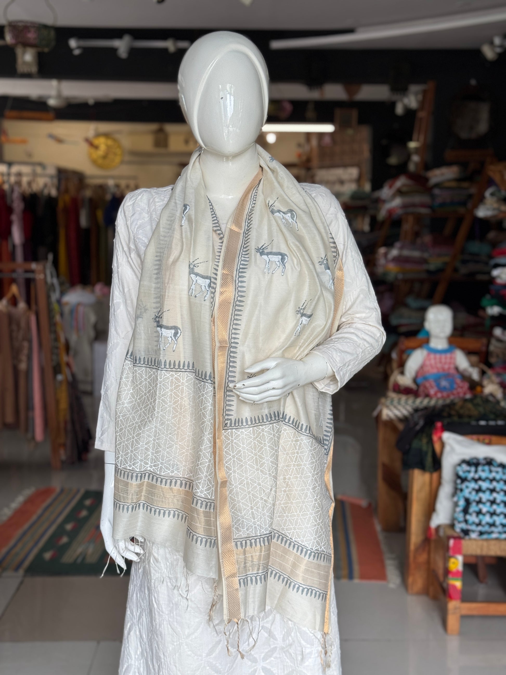 Off white hand woven, hand block printed, Maheshwari silk cotton stole - click to see designs