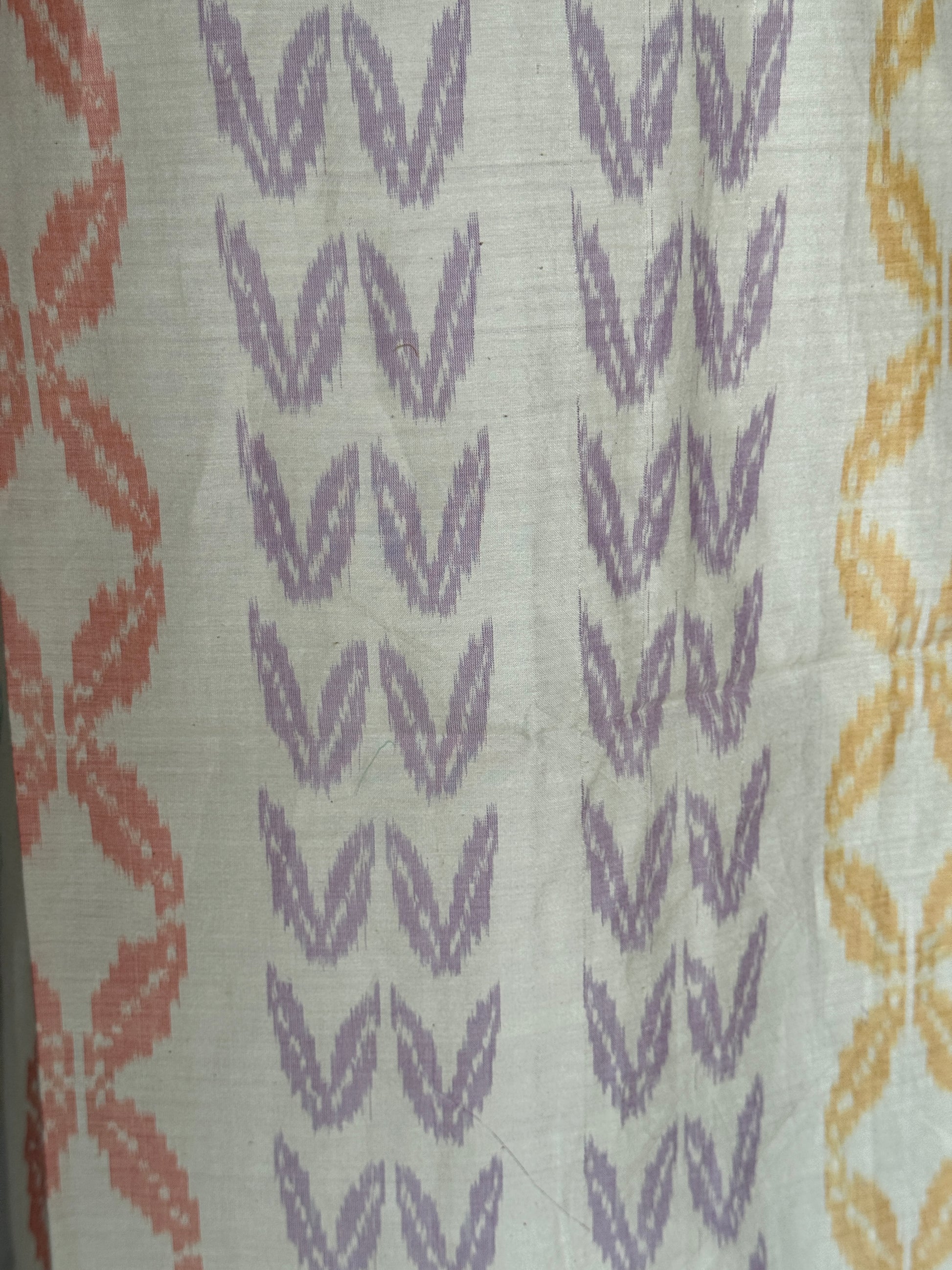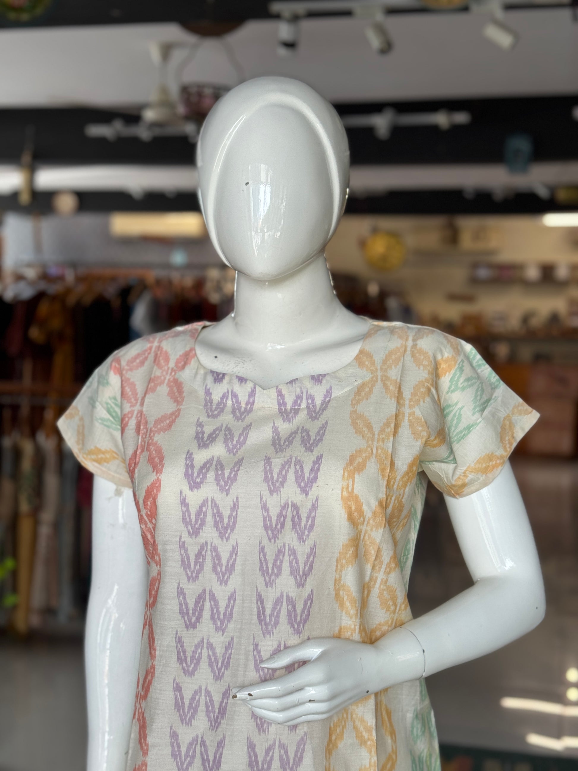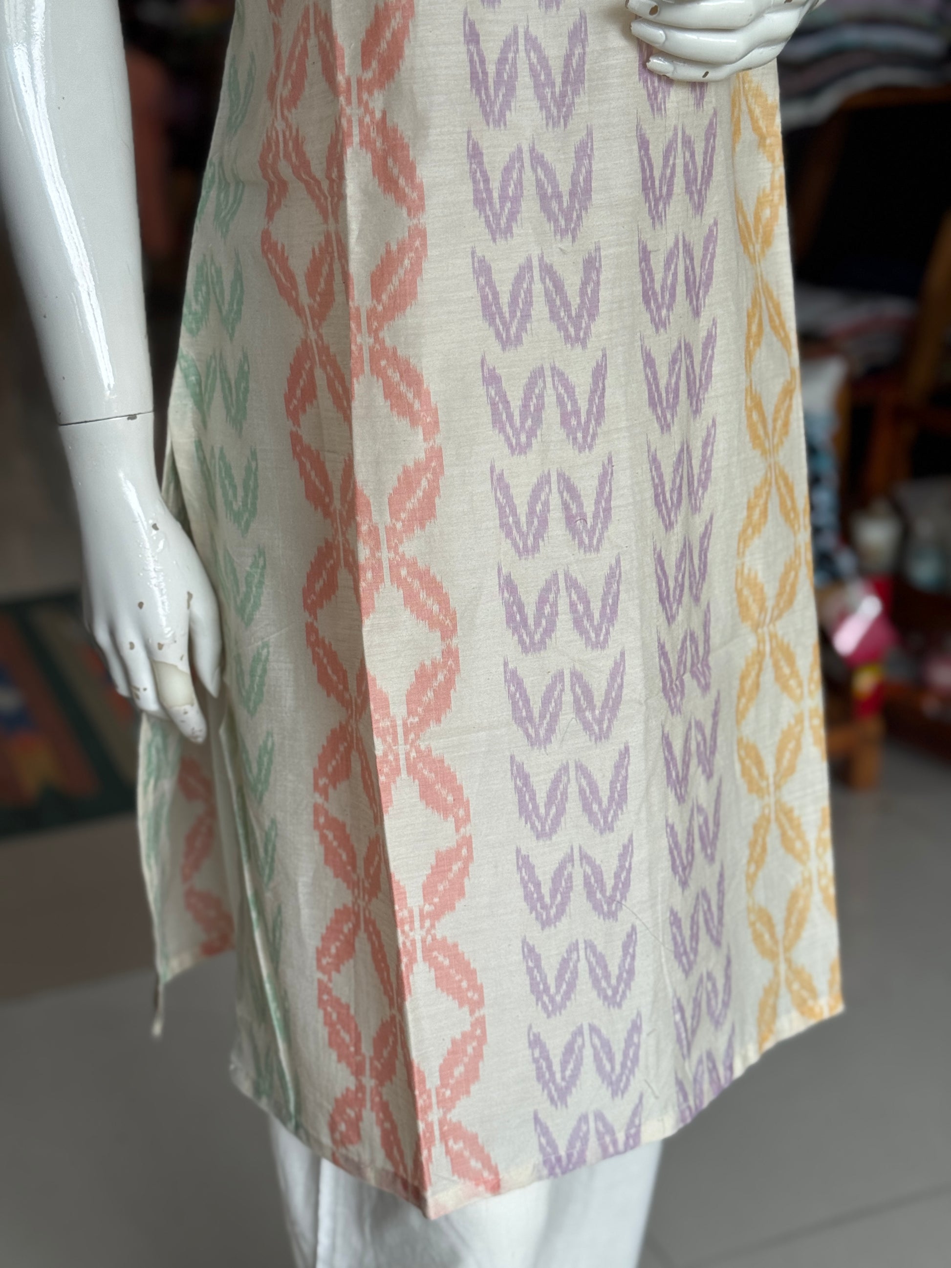 Off white handwoven silk ikat straight kurti with colorful vertical design