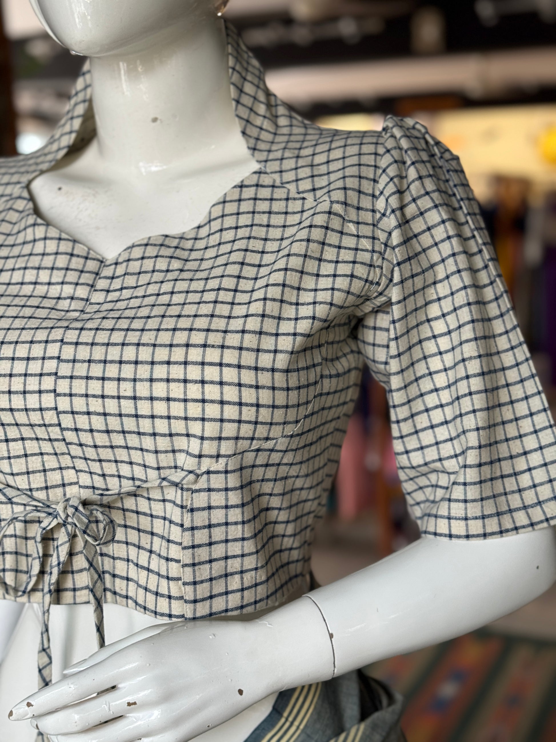 Off White n blue checks natural dyed, hand woven cotton blouse with standing collar, front tie and back hole
