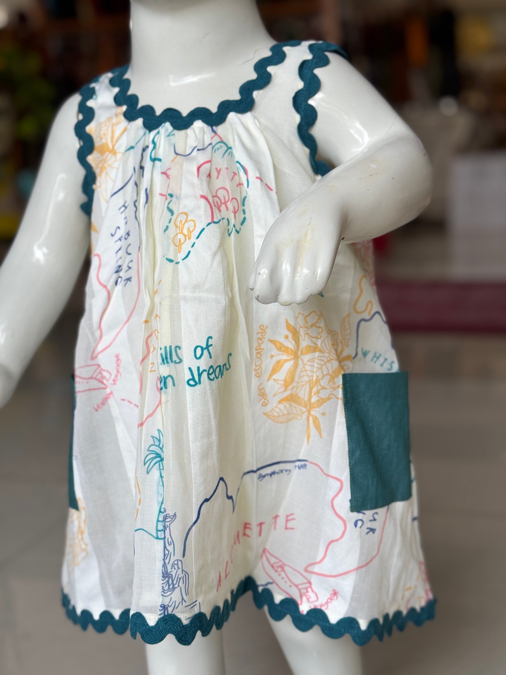 Off white soft cotton stripes frock with travel theme digital print
