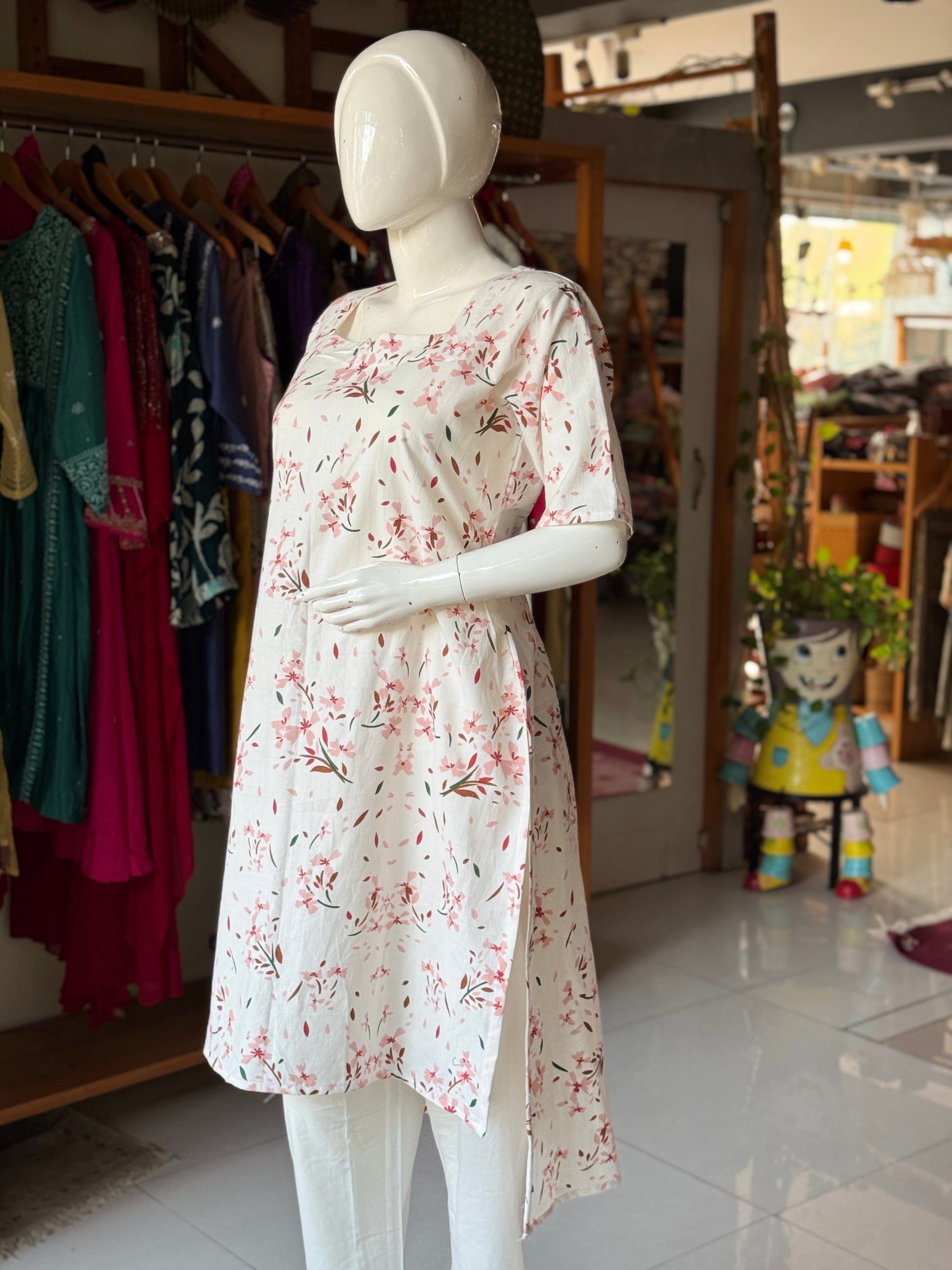 Offwhite handwoven cotton straight cuts kurti with mustard brown and peach flowers print