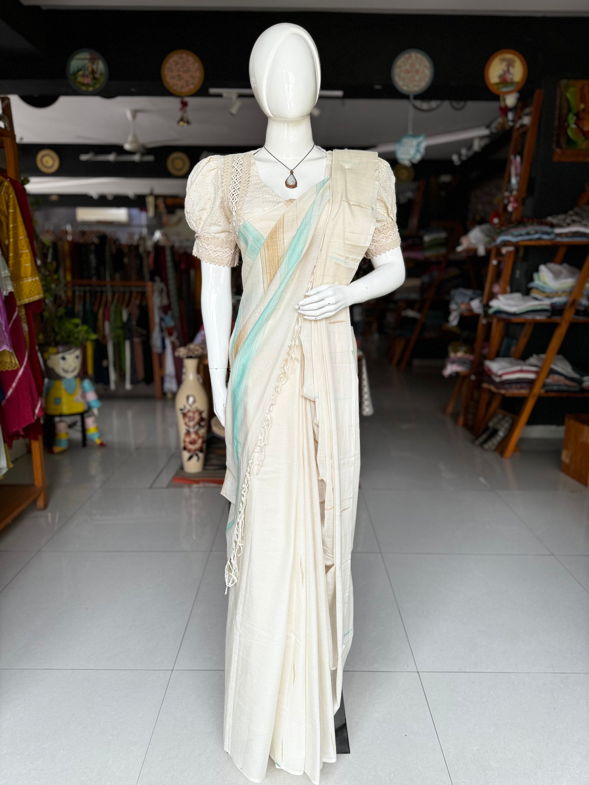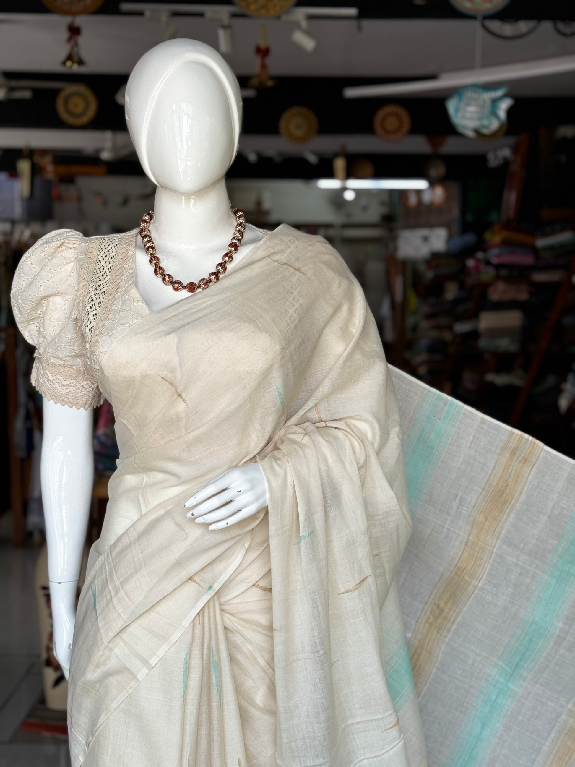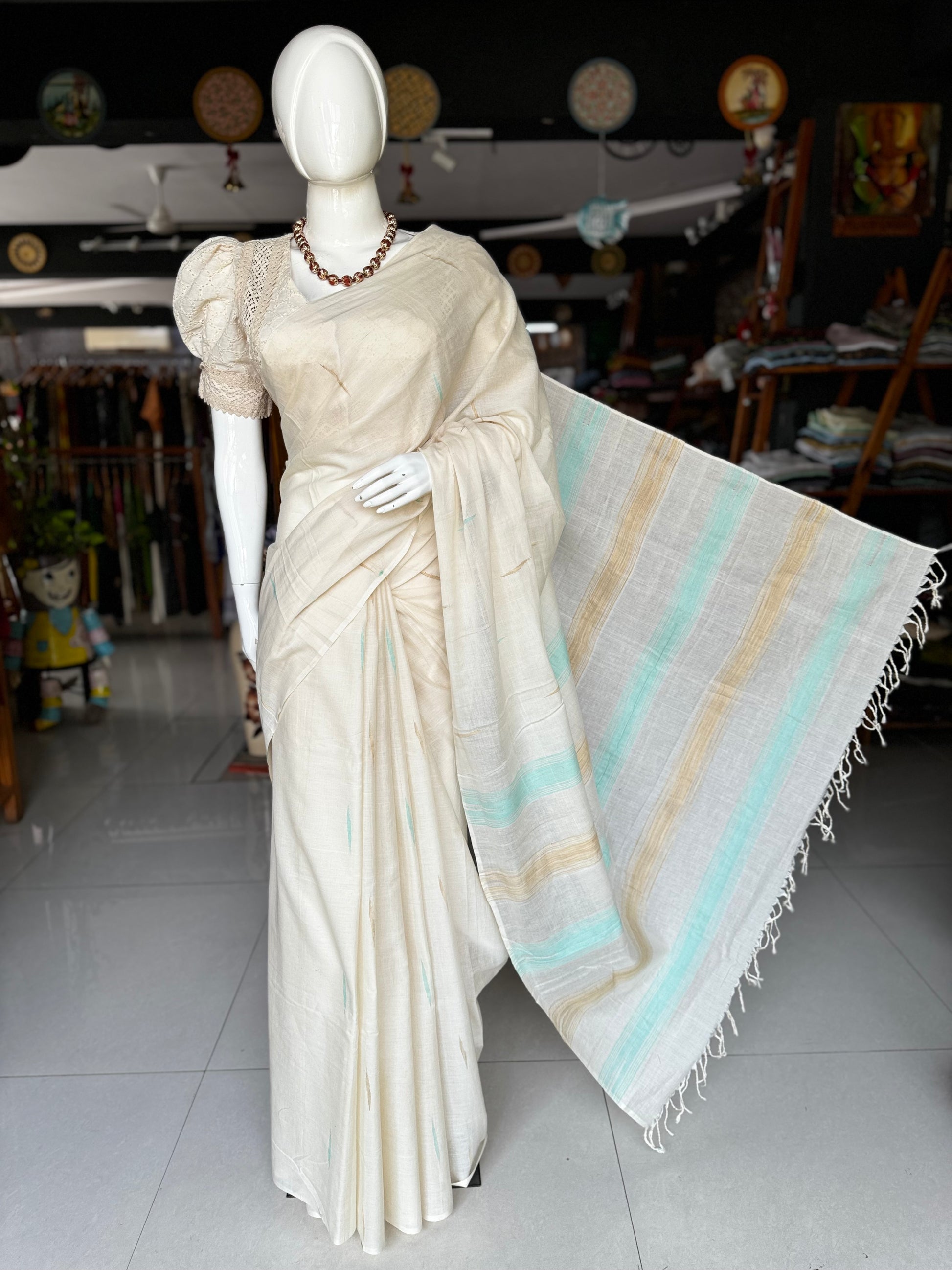 Offwhite pure soft cotton handloom saree with sea green and beige accents
