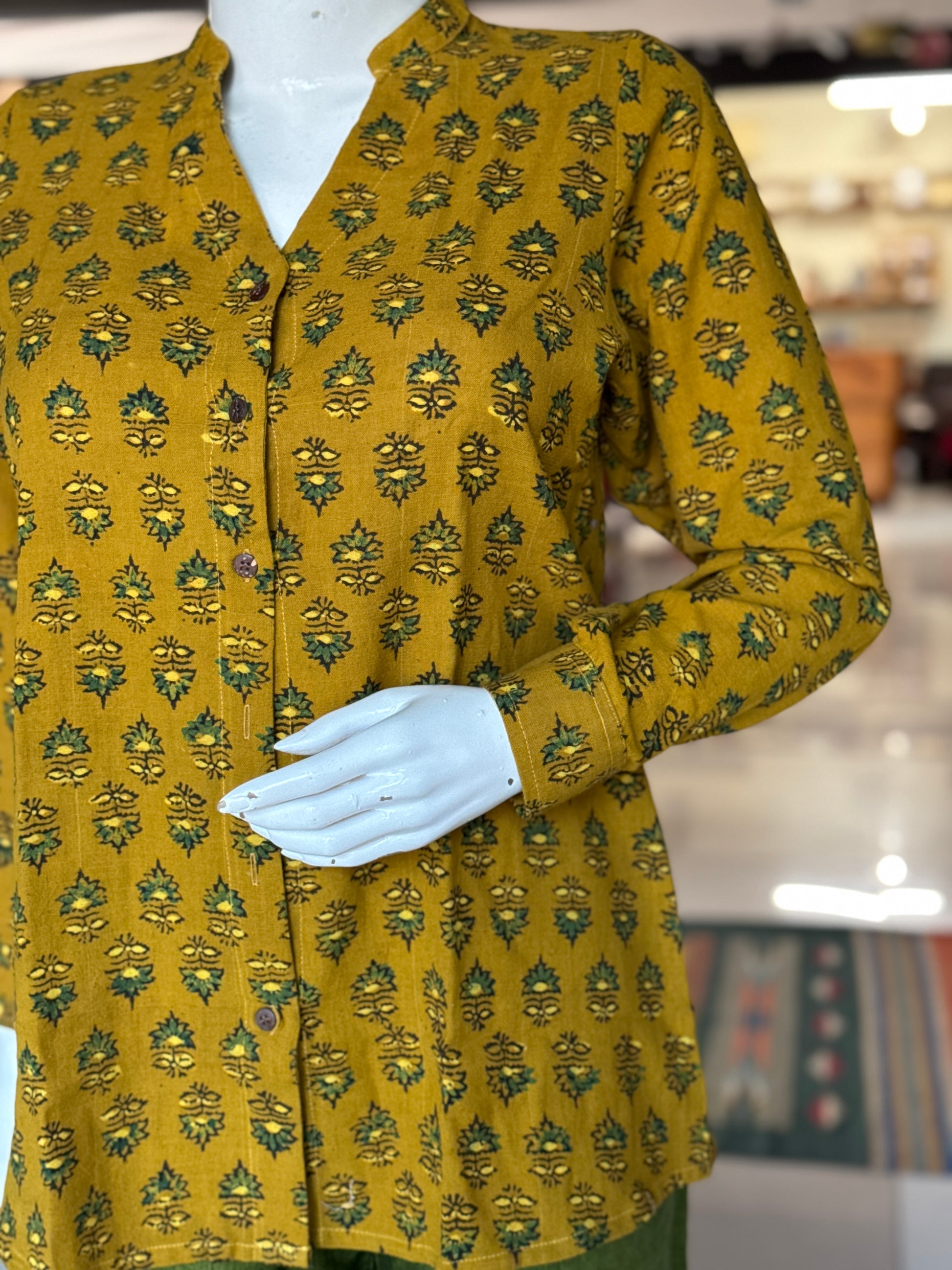 Olive green Chinese collared top with V-neckline - hand block printed, Hand spun, hand woven cotton