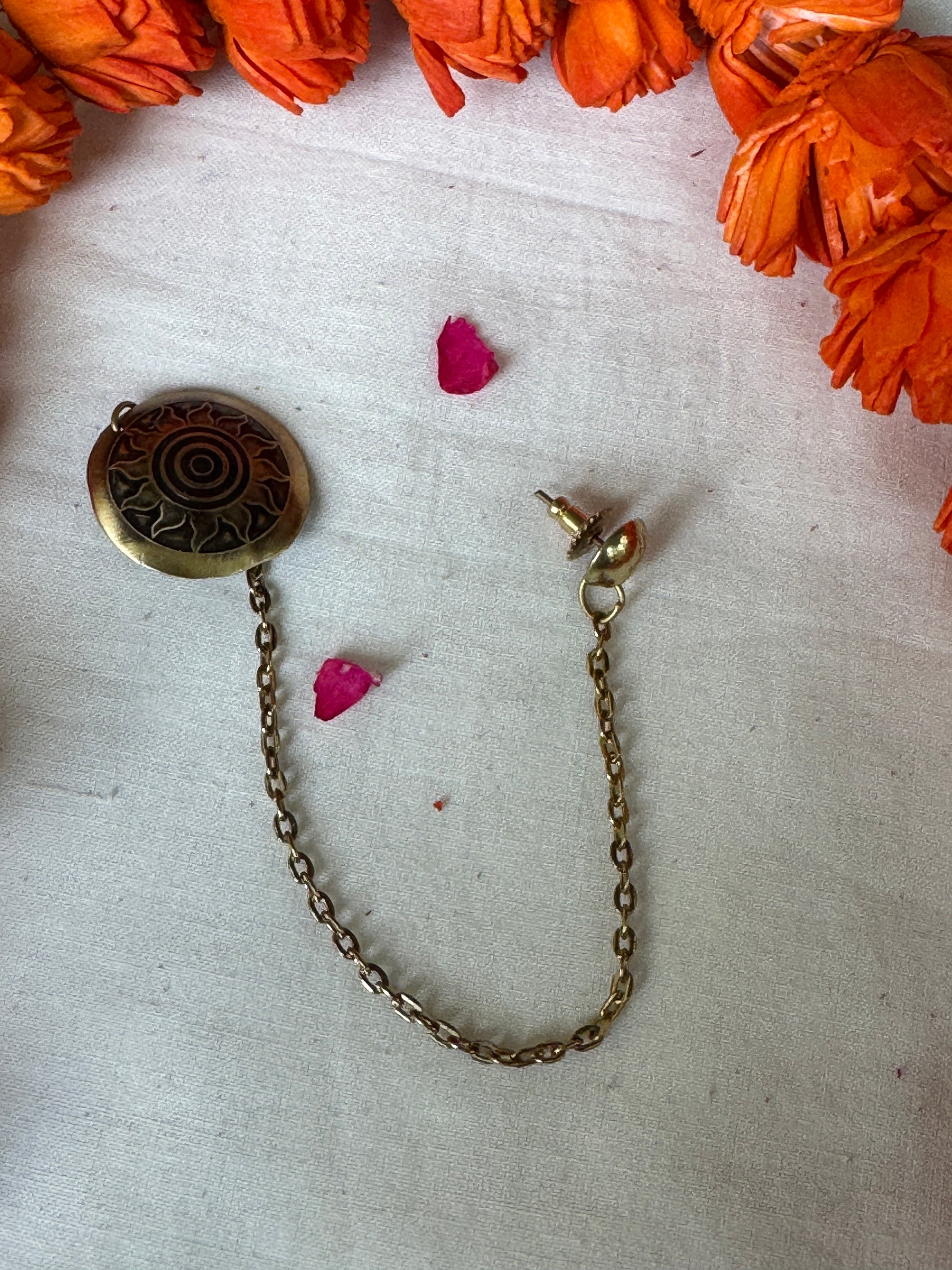 One ear wonder - Brass and copper sun design clip on plus stud with a connecting chain