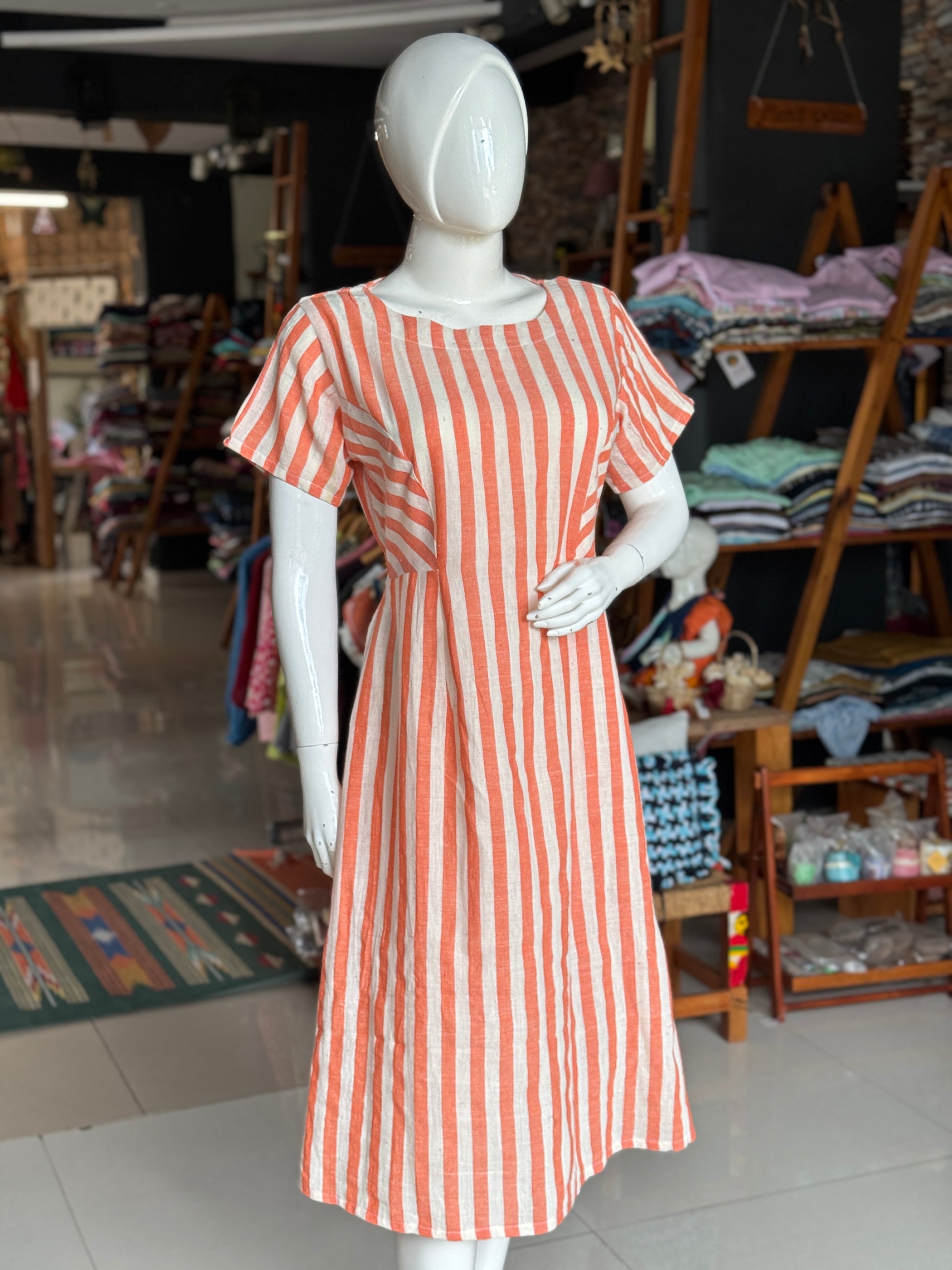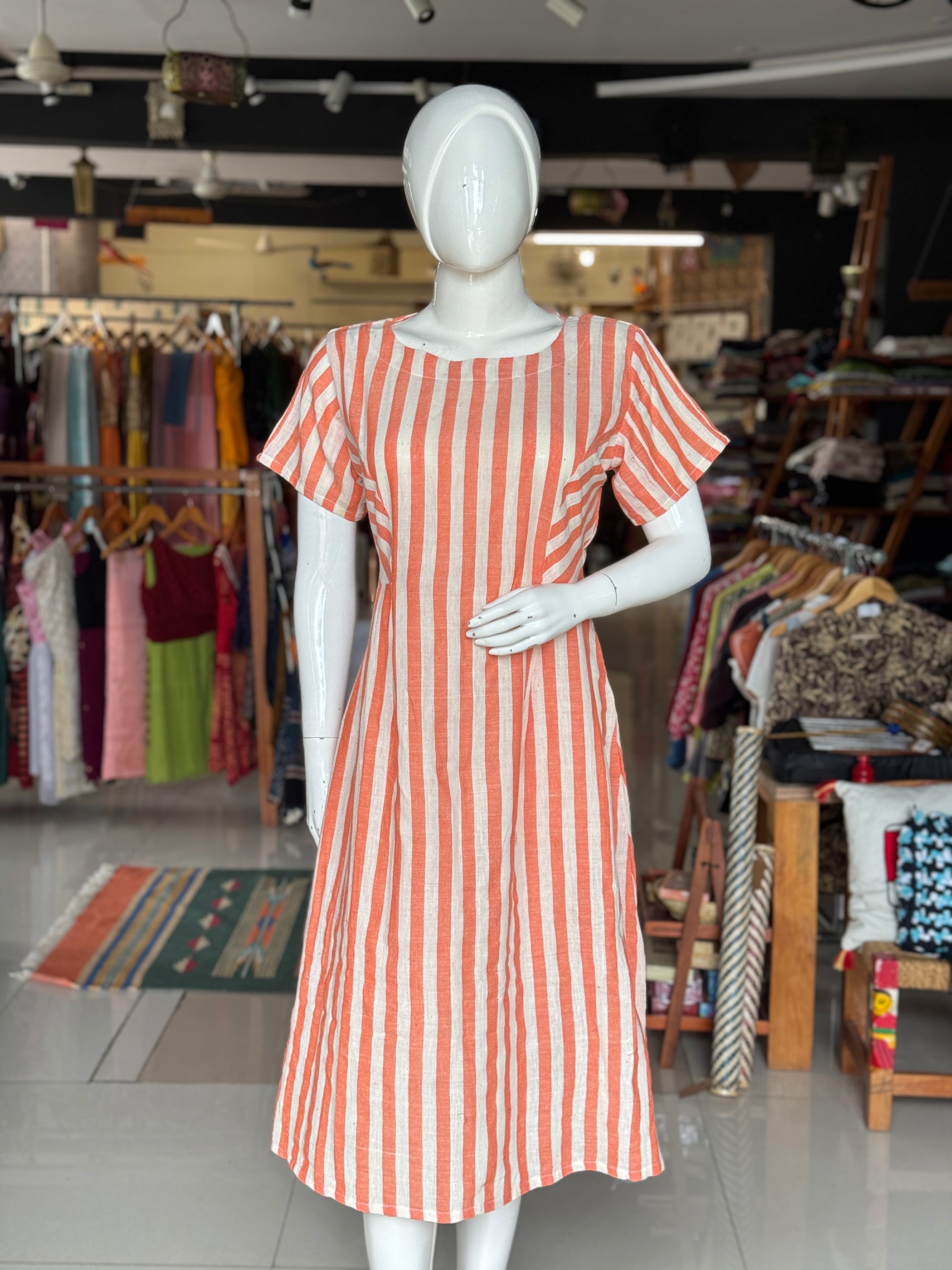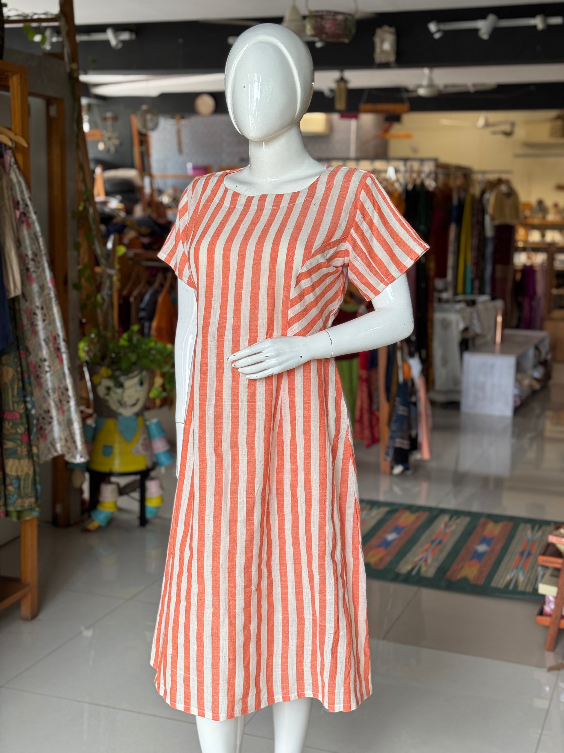 Orange and white stripes kala cotton, handwoven princess cut dress